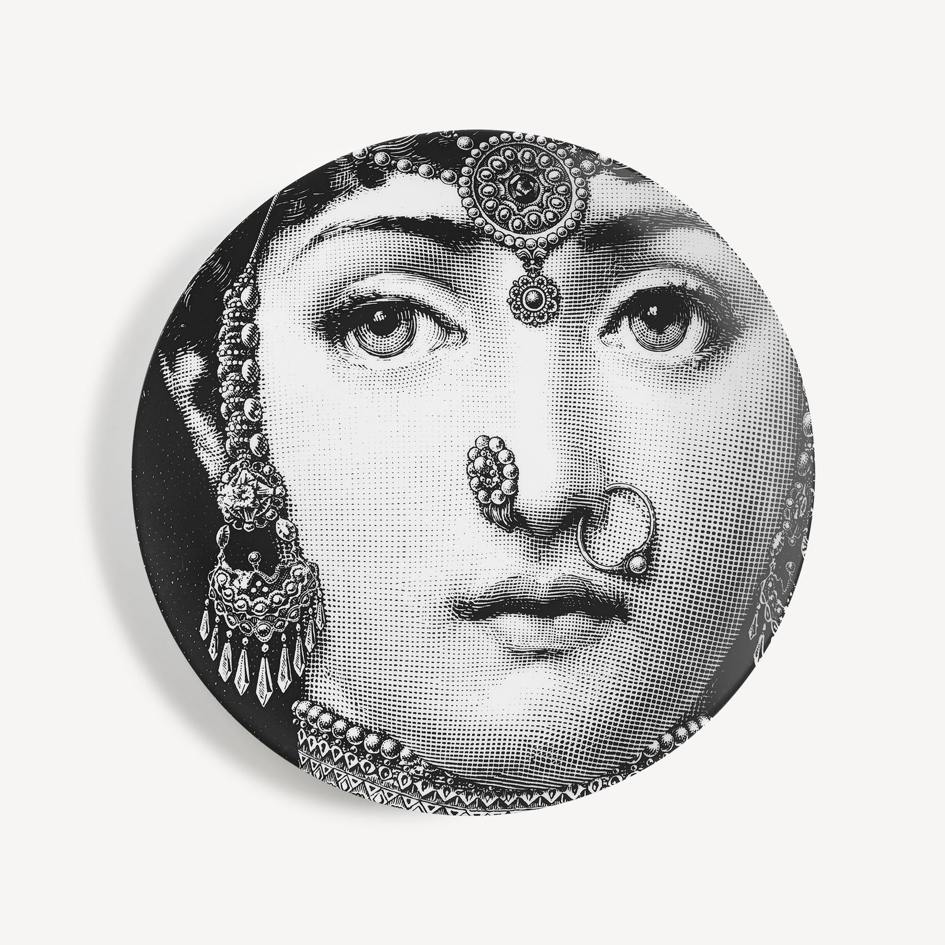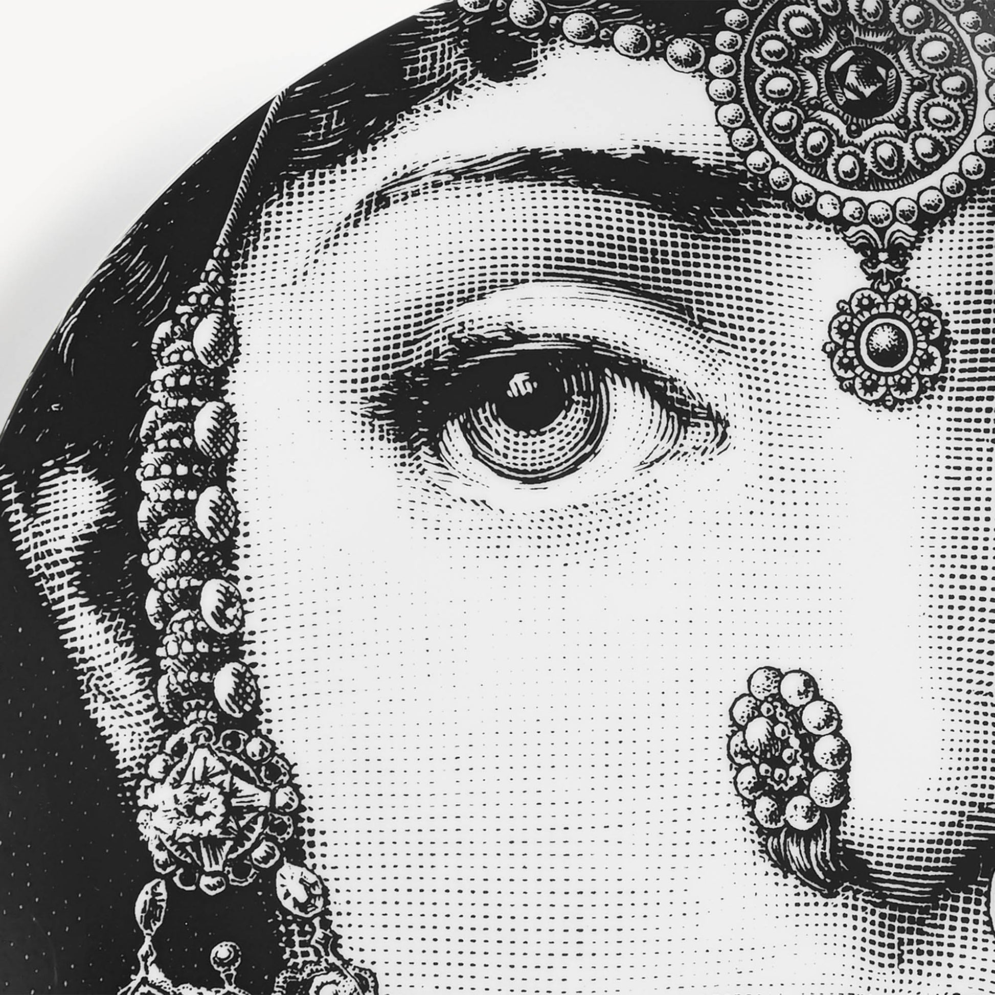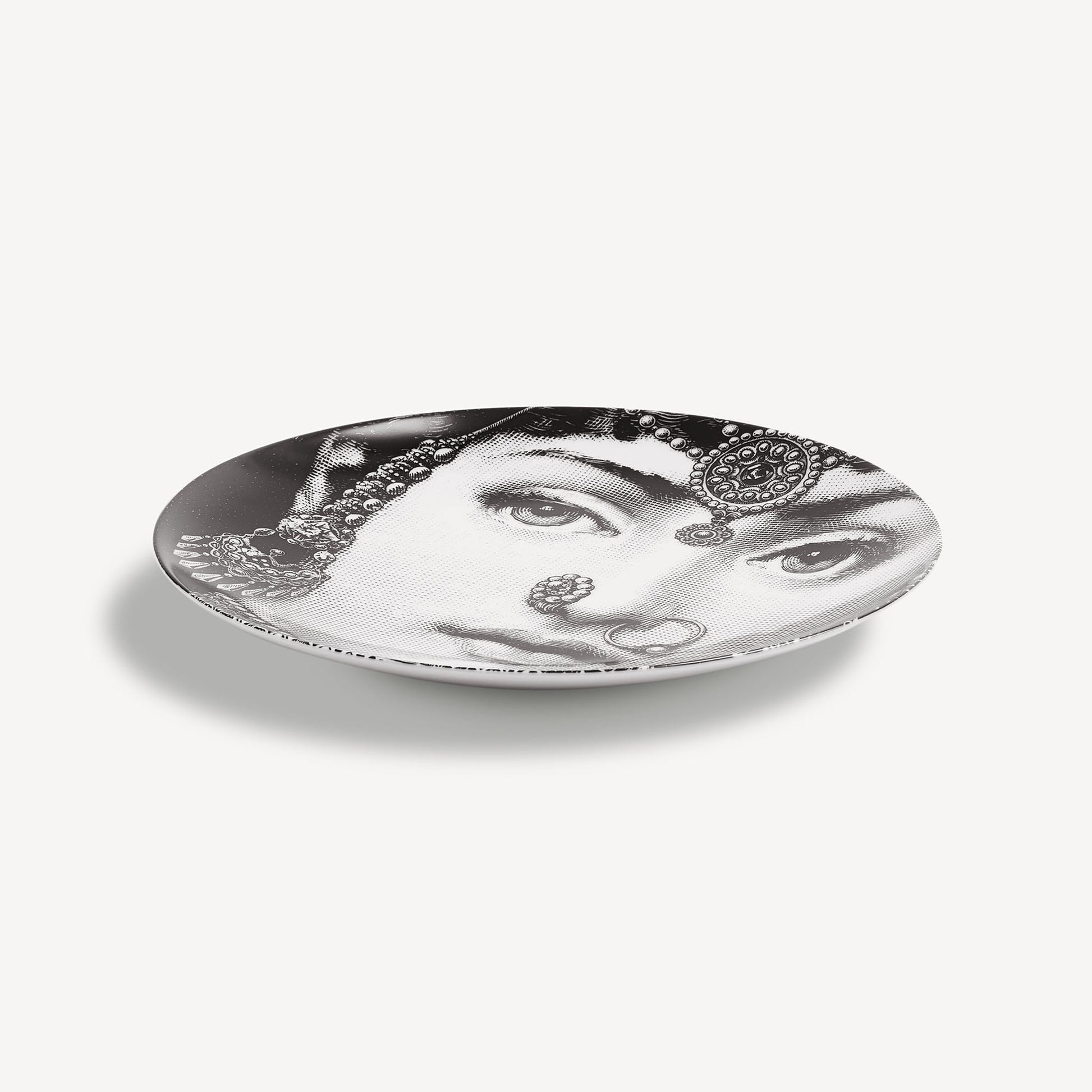 - Jouant gaiement à revisiter les traits inimitables de Lina Cavalieri, Fornasetti propose la série Tema e Variazioni, dont cette assiette en porcelaine décorée à la main est issue : une authentique pièce de collection, à vous de choisir si l’exposer comme assiette décorative murale, grâce à ses deux trous percés à l’arrière, ou comme élément ornemental pour l’art de la table. Pour le nettoyage, utiliser de préférence un chiffon humide sans détergent.