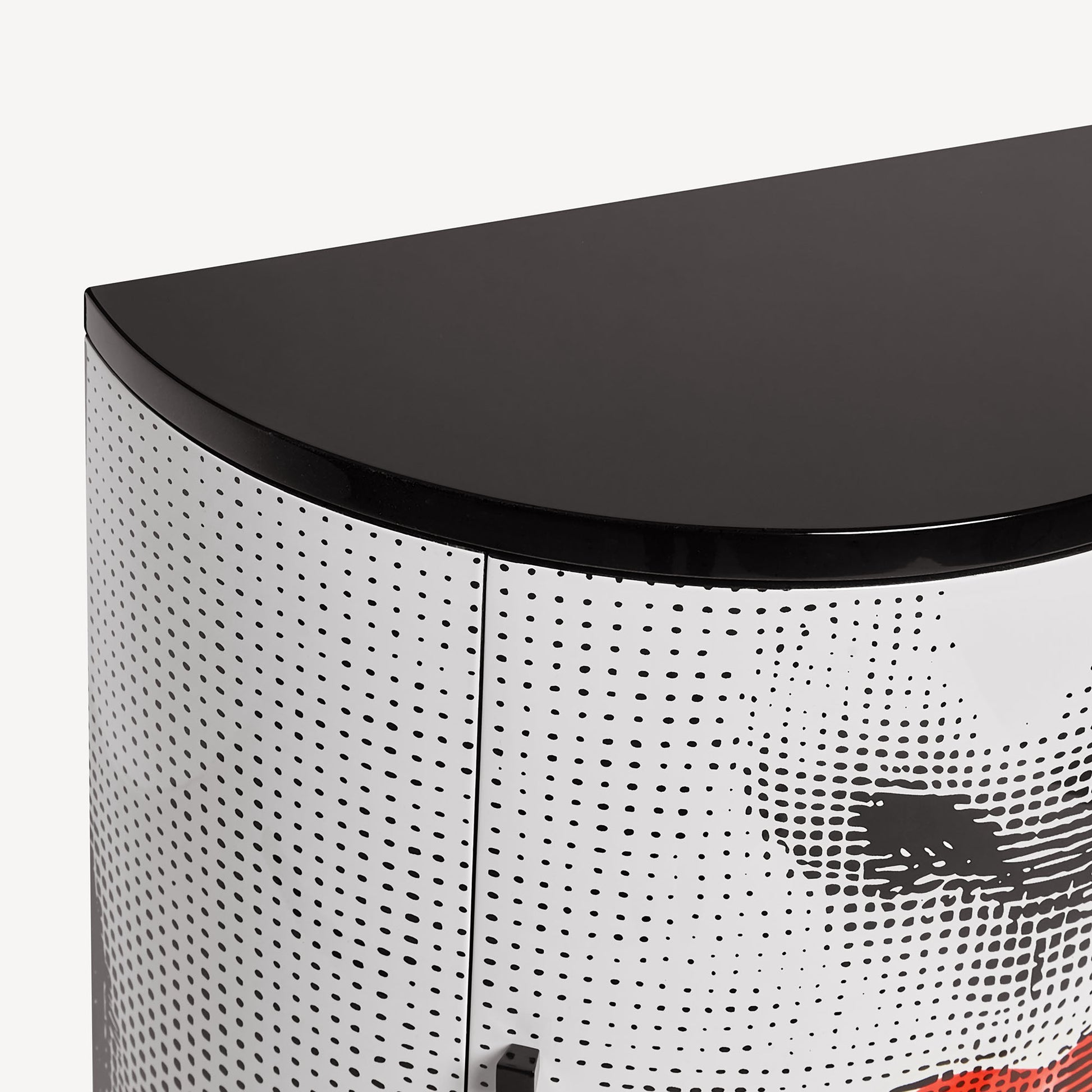 Le plateau de ce meuble Fornasetti est peint dans une teinte unie et laqué à la main, le verre de protection n’est pas fourni.