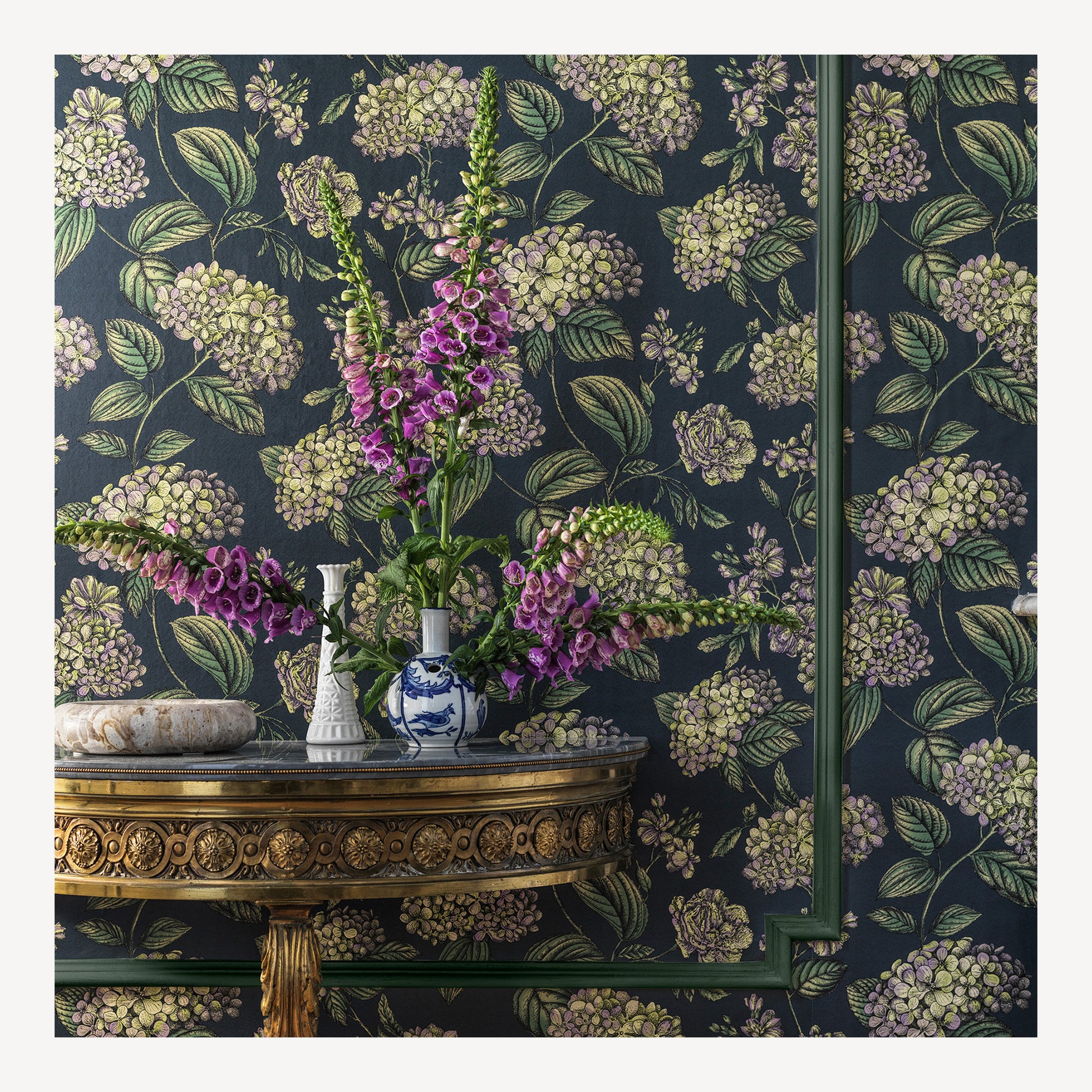 - Source d’inspiration de ce motif, les hortensias qui prospèrent dans le jardin milanais de Fornasetti se déploient sur ce papier peint.