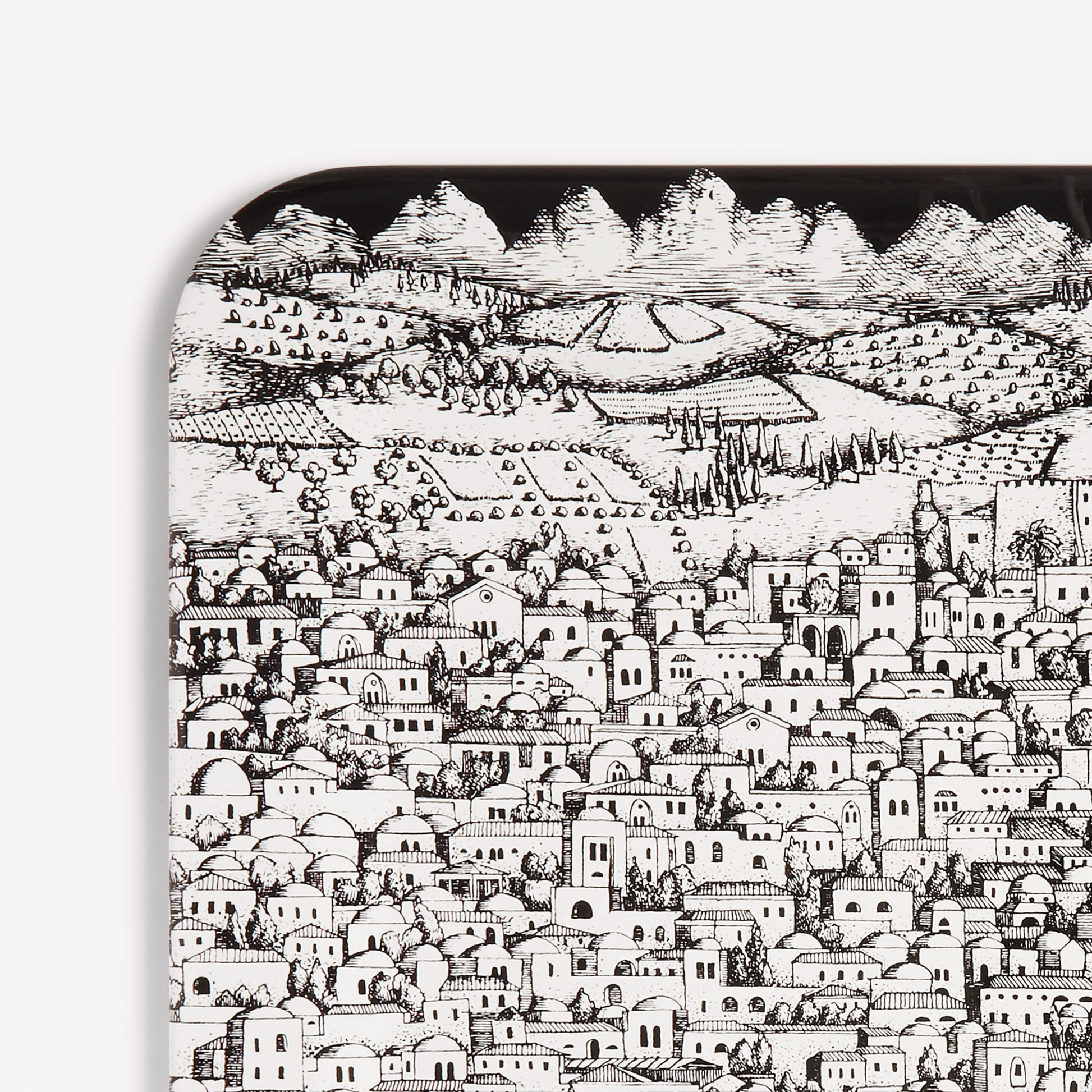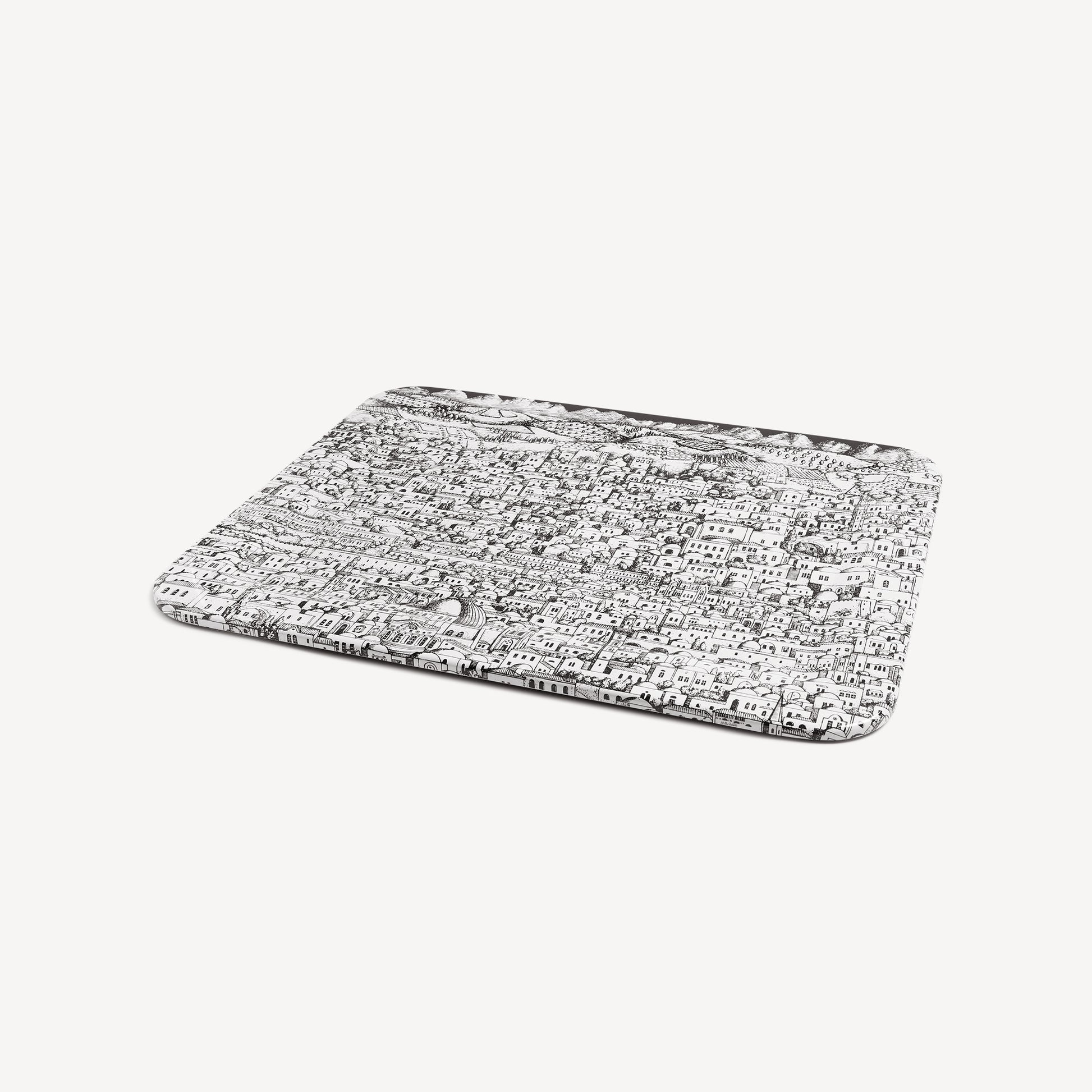 - Complément qui, par sa forme et sa surface, compte parmi ceux qui s’assimilent le plus à une feuille de papier, le plateau offre depuis toujours à Fornasetti de multiples possibilités d’expression. Sérigraphié à la main, avec la représentation d’une ville dessinée d’un trait fortement symbolique, ce modèle ne saurait passer inaperçu. Combiné à un support pliable, ce plateau peut se transformer en table d’appoint.