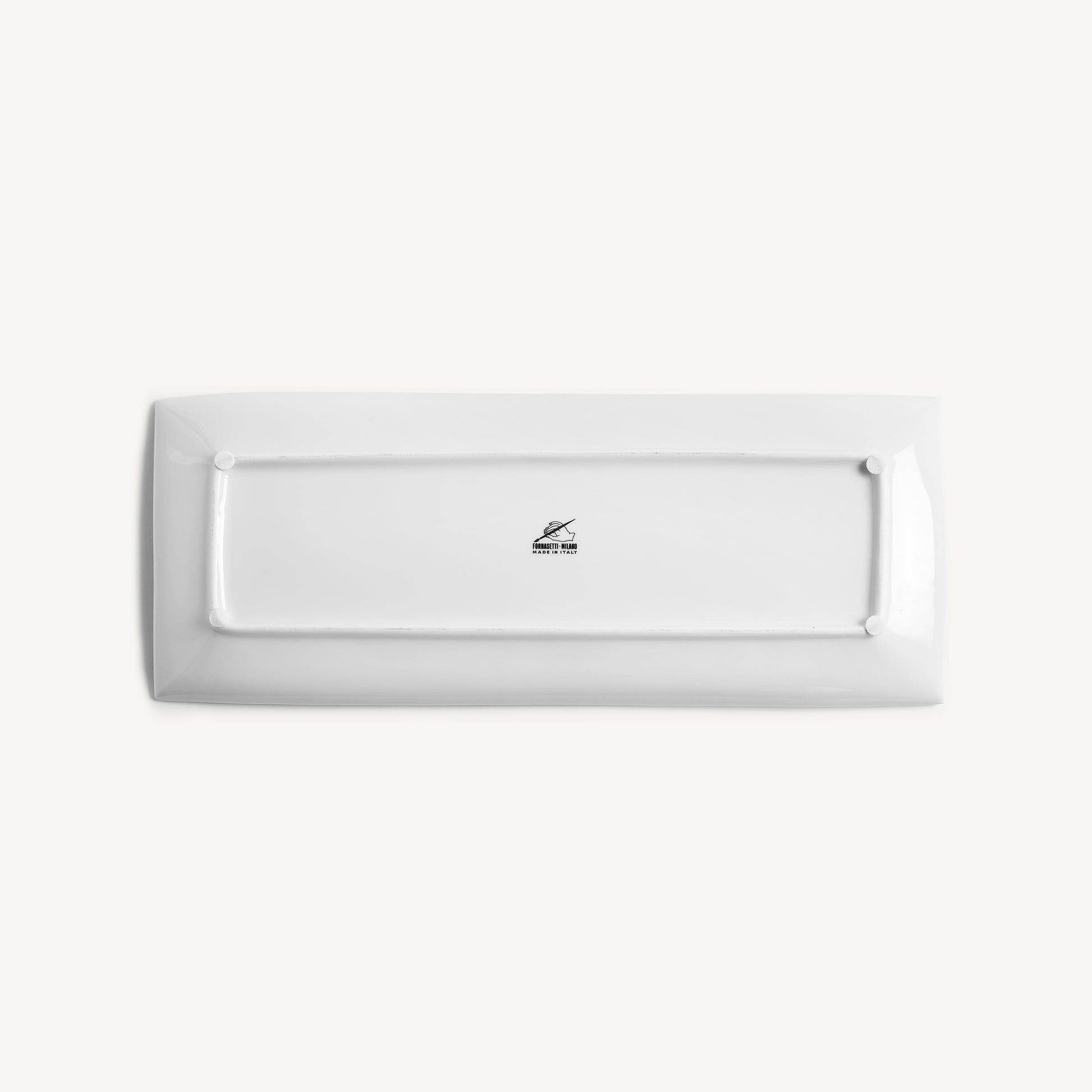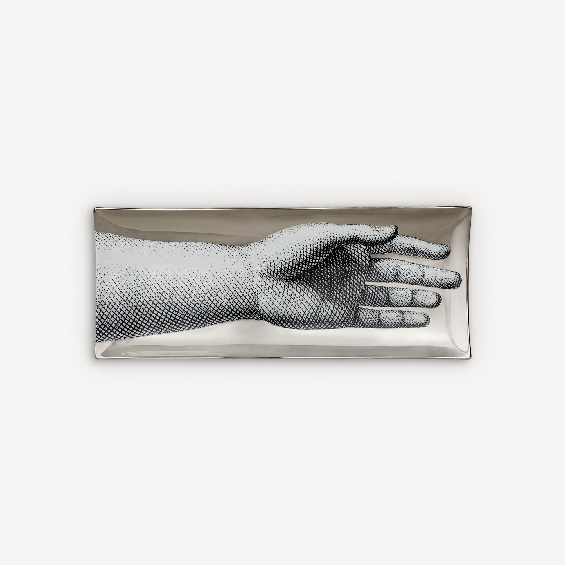 - La main est un leitmotiv dans la production de Fornasetti, car Piero attribuait une importance notable au dessin anatomique : ici, elle agrémente ce plateau en porcelaine décoré à la main.