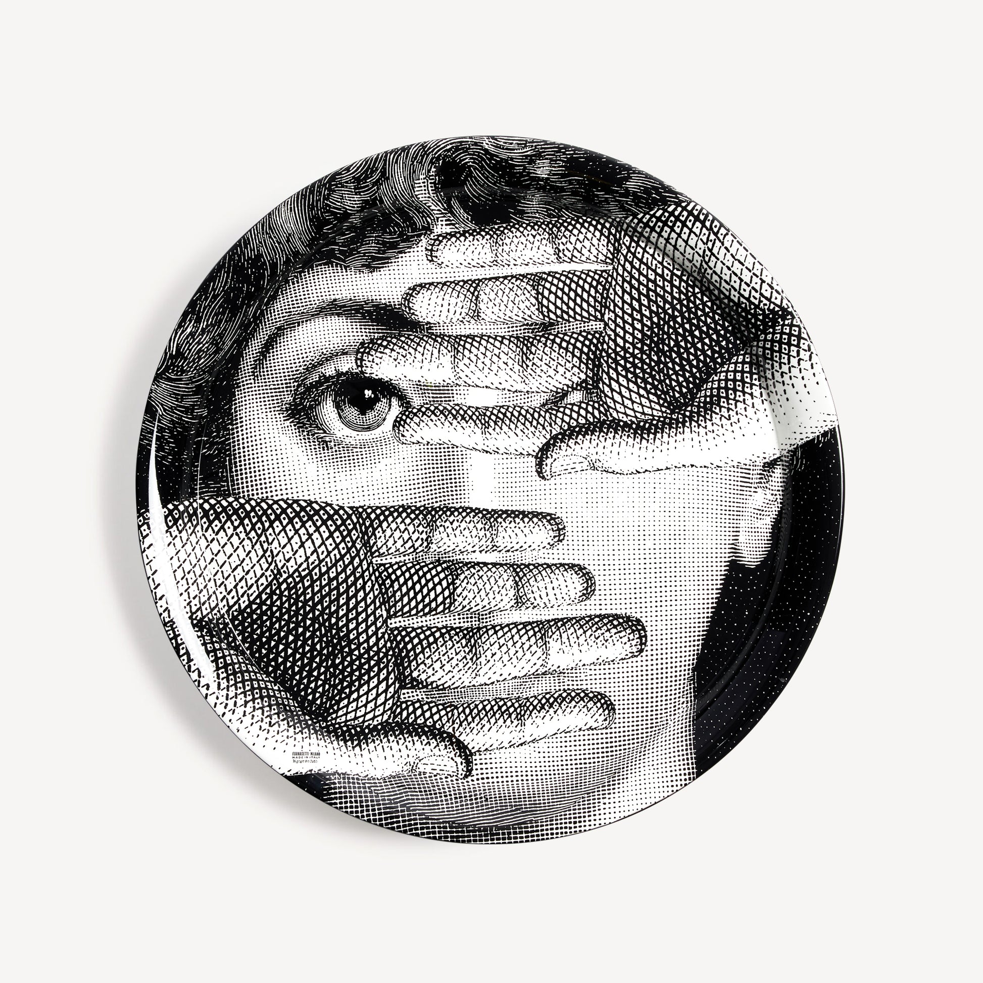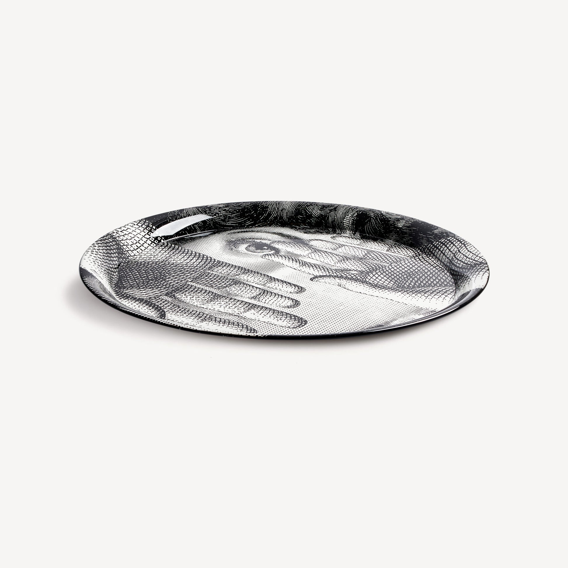 - La forme circulaire et la surface plane des plateaux Fornasetti mettent en lumière les traits du visage de la chanteuse d’opéra Lina Cavalieri, figure emblématique de l’univers créatif de l’Atelier. Son portrait orne cette série de plateaux en métal décorés à la main, appartenant à la collection Tema e Variazioni. Lorsqu’il est fixé à une structure pliante, le plateau peut se transformer en table.