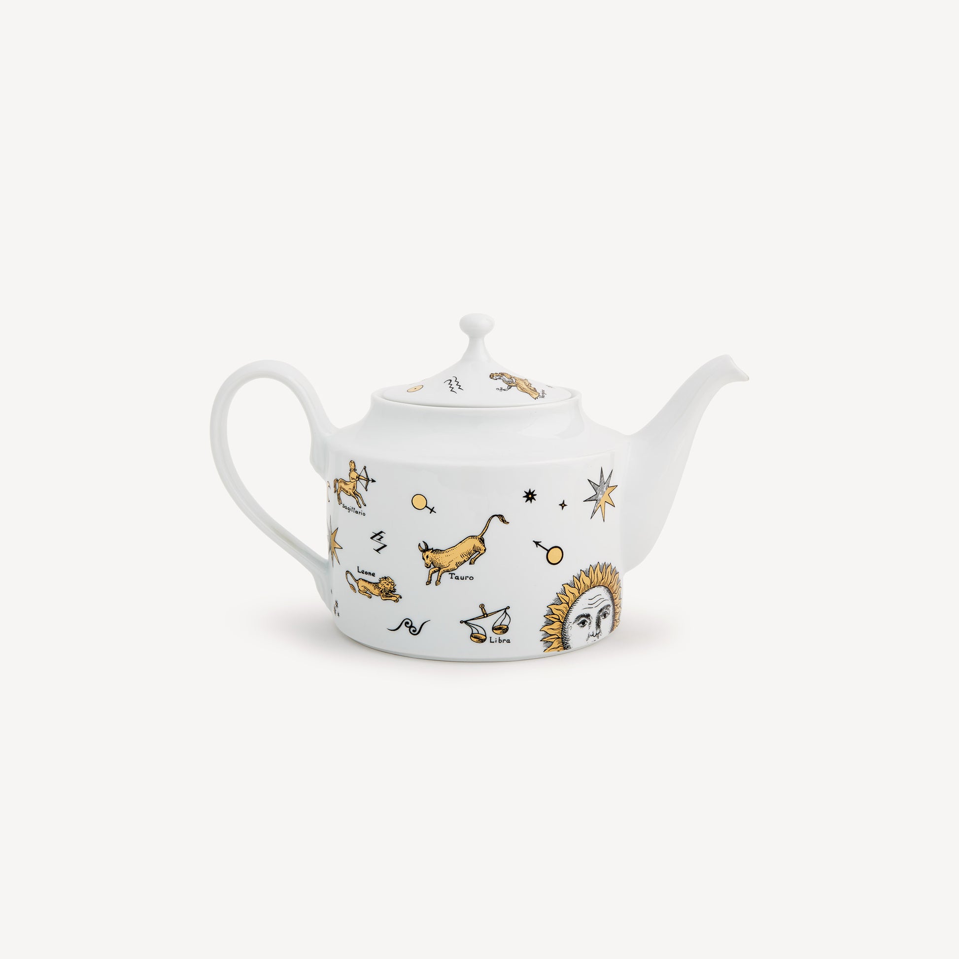 - De raffinés motifs rattachés au zodiaque habillent cette élégante théière en porcelaine décorée à la main avec des accents dorés : un objet d’usage quotidien devient ainsi une authentique pièce de collection.