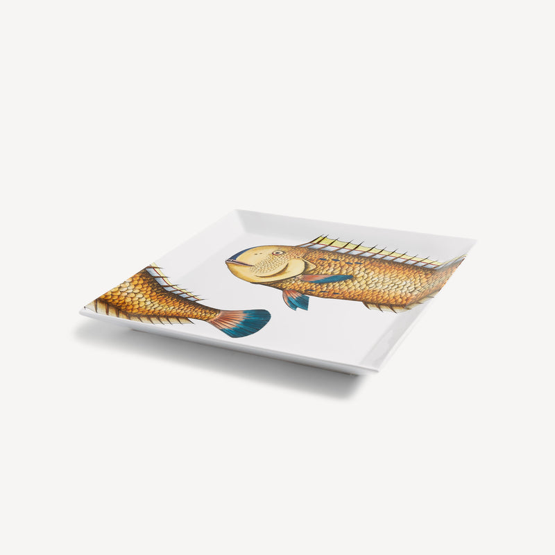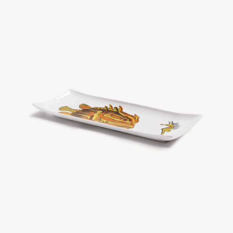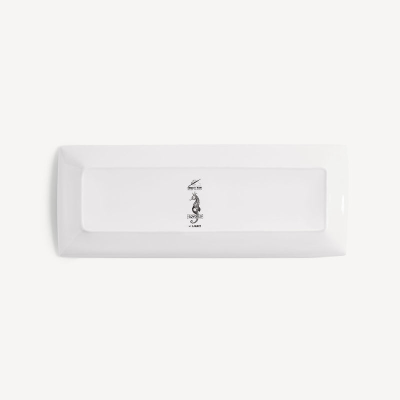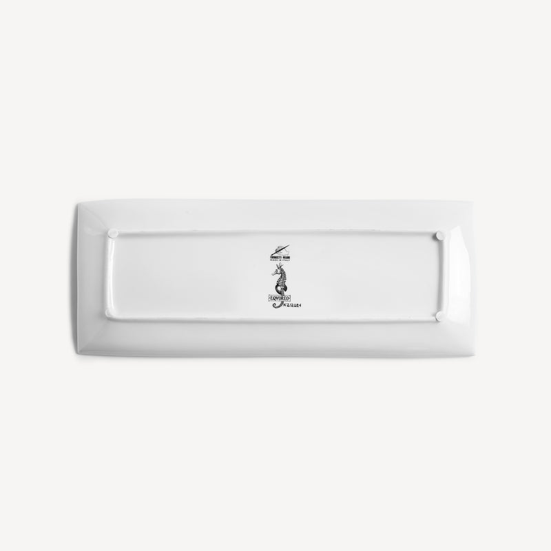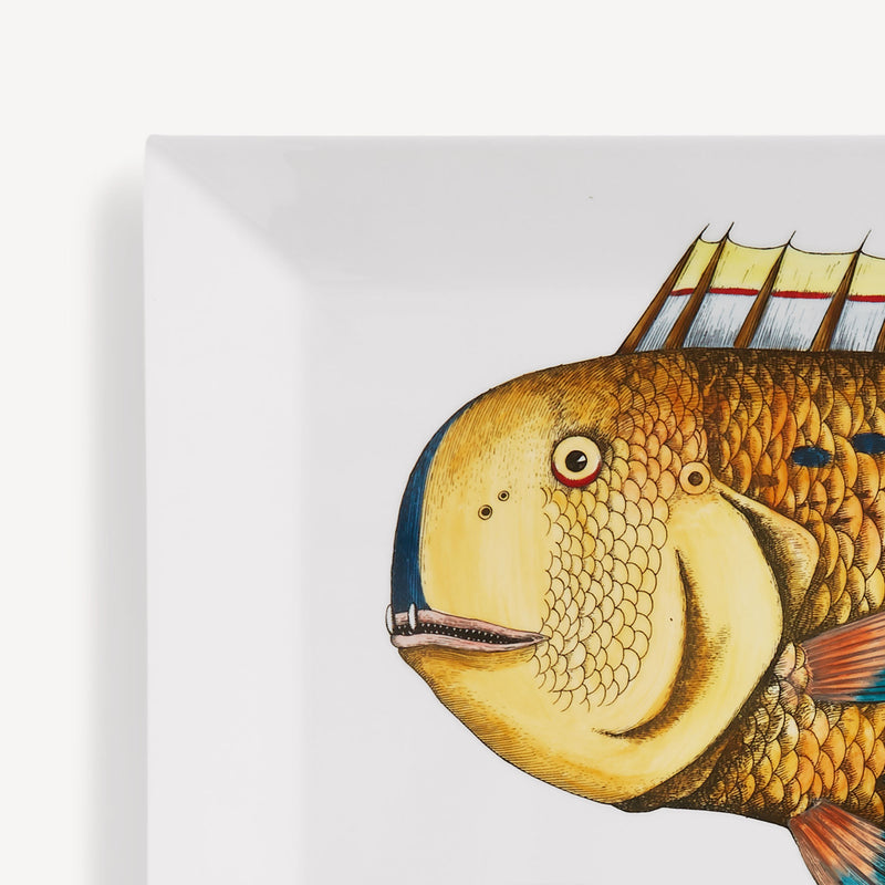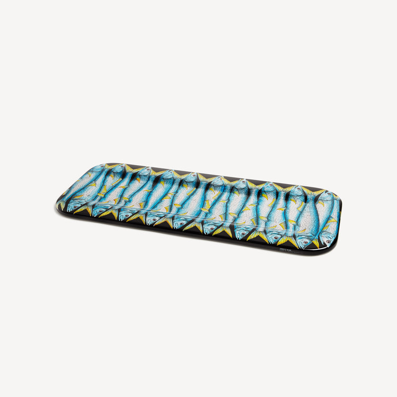 L’esprit créatif de Fornasetti se délecte d’interpréter, de sublimer et de réinventer la réalité. Puisant l’inspiration dans le mystère des profondeurs abyssales, il a créé son propre manuel de zoologie illustré, rassemblant des dessins surréalistes et fantastiques qui, depuis les années 1940, dressent le portrait des créatures marines les plus étranges. Né de l’exploration sans trêve de solutions, de matériaux et de techniques artisanales de composition, le plateau Sardine, désormais iconique, nous est offert la décennie suivante, orné de feuille d’argent appliquée à la main.