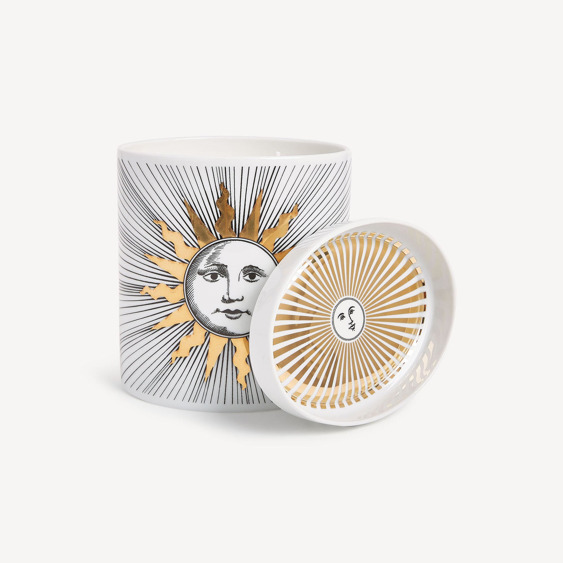 - Le trait essentiel et raffiné de Fornasetti transforme les bougies ornées de l’iconique motif Soli en objets inimitables et intemporels.