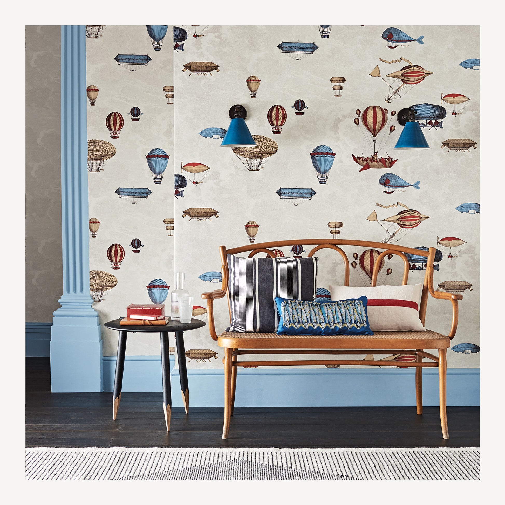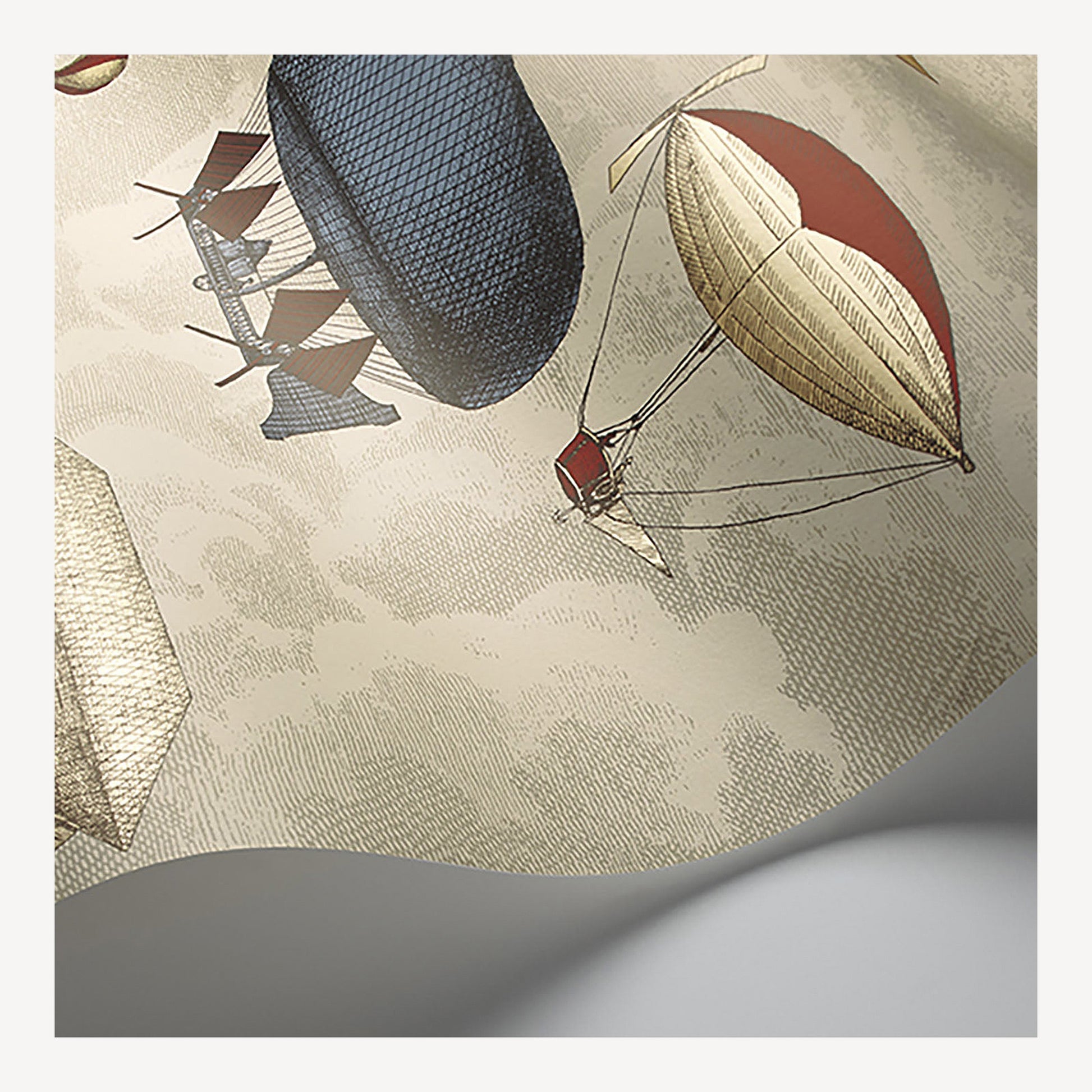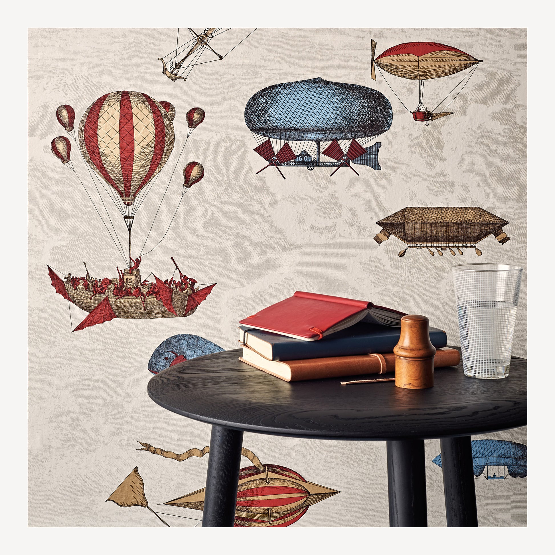 Ce papier peint orné de montgolfières rend aussi hommage à la créativité précoce du jeune Fornasetti : les machines volantes ont peuplé son univers créatif dès le moment où, dans son enfance, il les choisit pour décorer sa chambre.