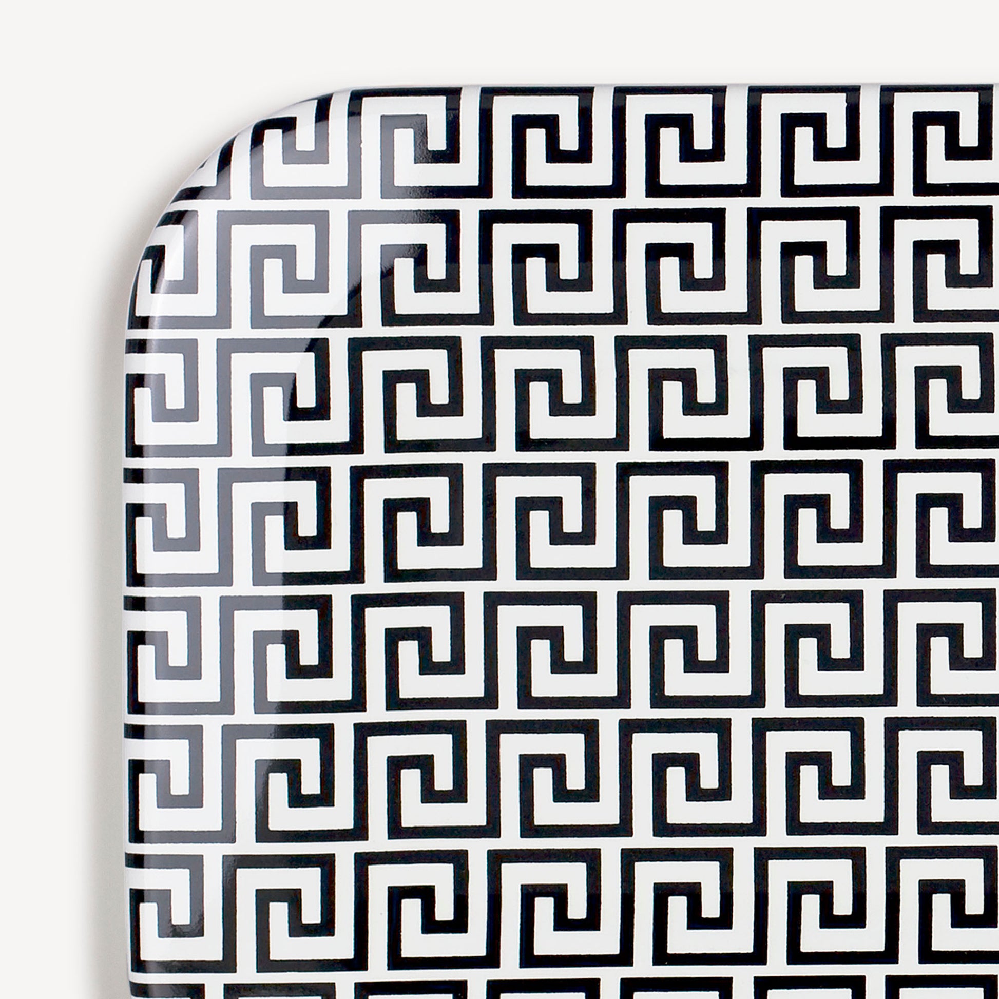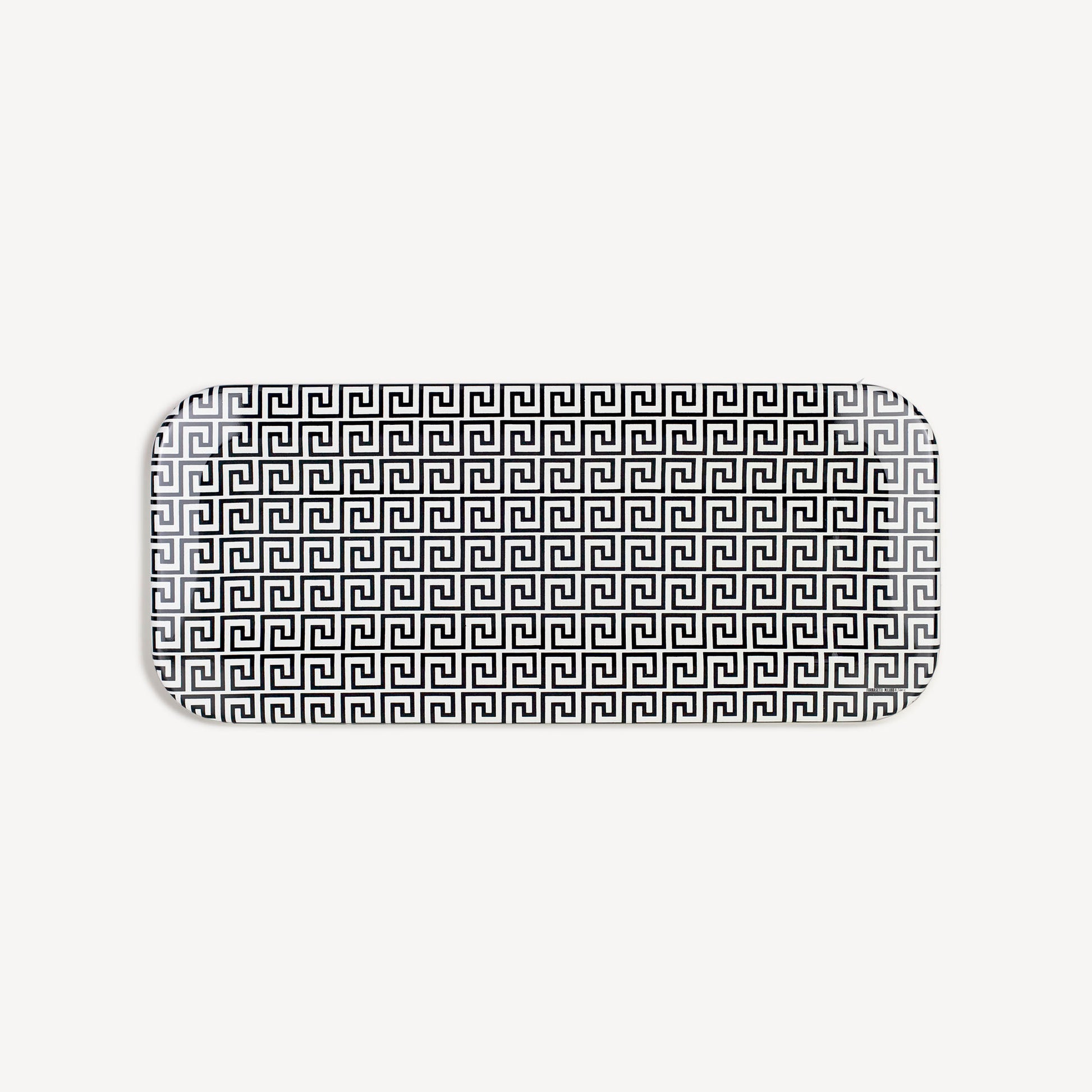 L'ornement allie le classicisme grec à l'attrait de Fornasetti pour la répétition et les formes géométriques, le tout dans un élégant contraste de noir et blanc.