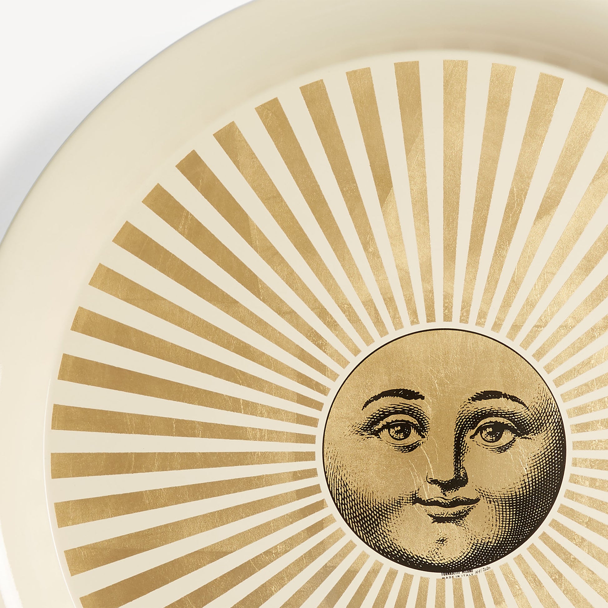 - Sa forme circulaire et sa surface plate exaltent remarquablement les motifs de l’Atelier. Ce plateau décoré à la main aux accents dorés attire le regard avec son motif hypnotique, qui rayonne d’un soleil anthropomorphe. Combiné à un support pliable, ce plateau peut se transformer en table d’appoint.