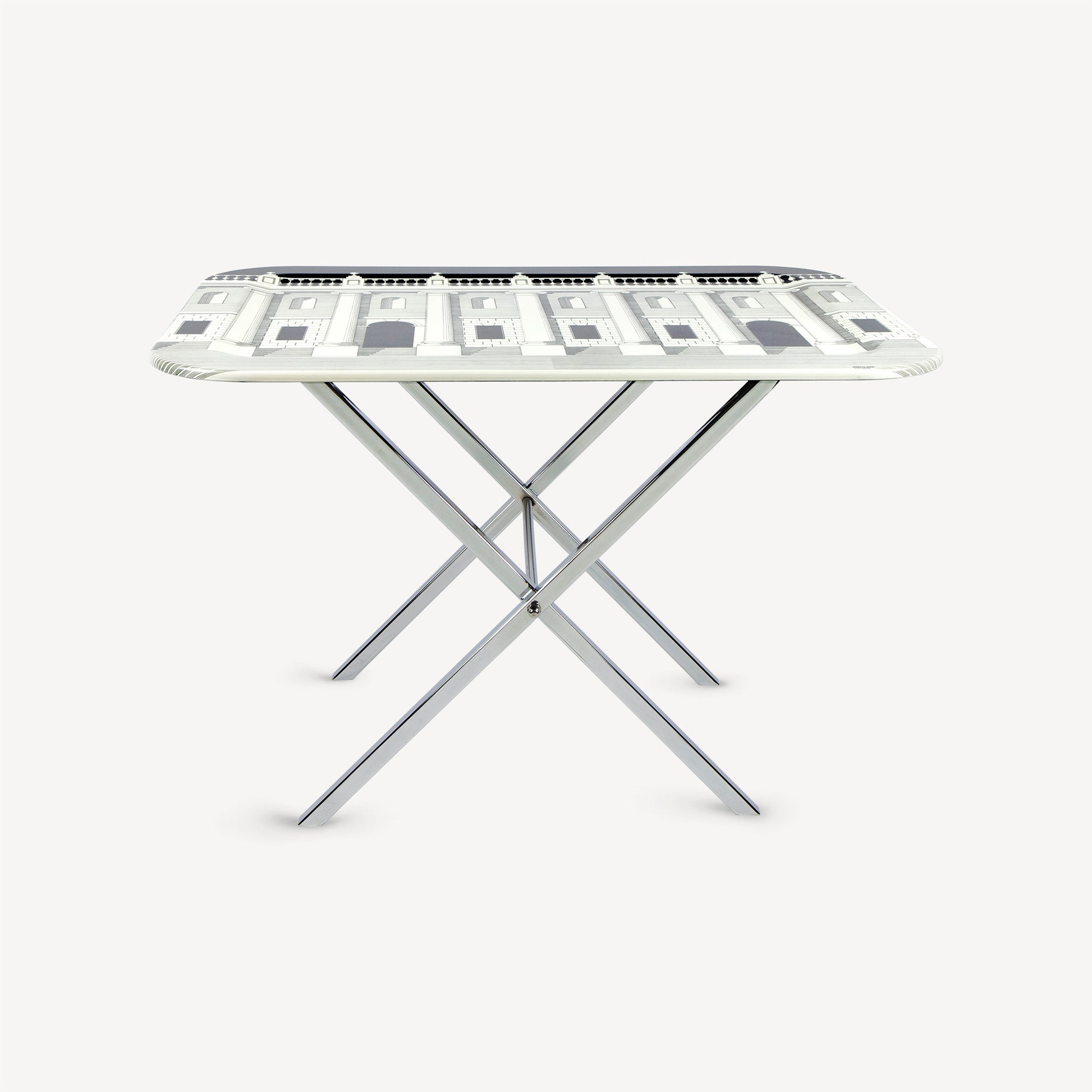 - Ce support pliable en fer chromé, renforcé par des lanières en cuir, permet de transformer le plateau en table d’appoint. Ce simple objet du quotidien acquiert ainsi une nouvelle fonction d’utilisation et de plaisir.