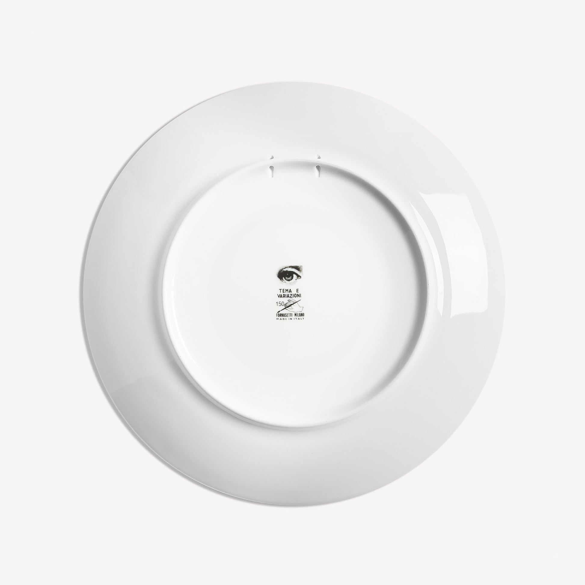 - Revisitant inlassablement le visage de sa muse, la chanteuse d’opéra Lina Cavalieri, Fornasetti donne naissance à son emblématique série Tema e Variazioni, faisant de cette assiette en porcelaine décorée à la main un objet extrêmement prisé des collectionneurs et des amateurs d’art : à vous de choisir si l’exposer comme assiette décorative murale, grâce à ses deux trous percés à l’arrière, ou comme élément ornemental pour l’art de la table. Pour le nettoyage, utiliser de préférence un chiffon humide sans détergent.