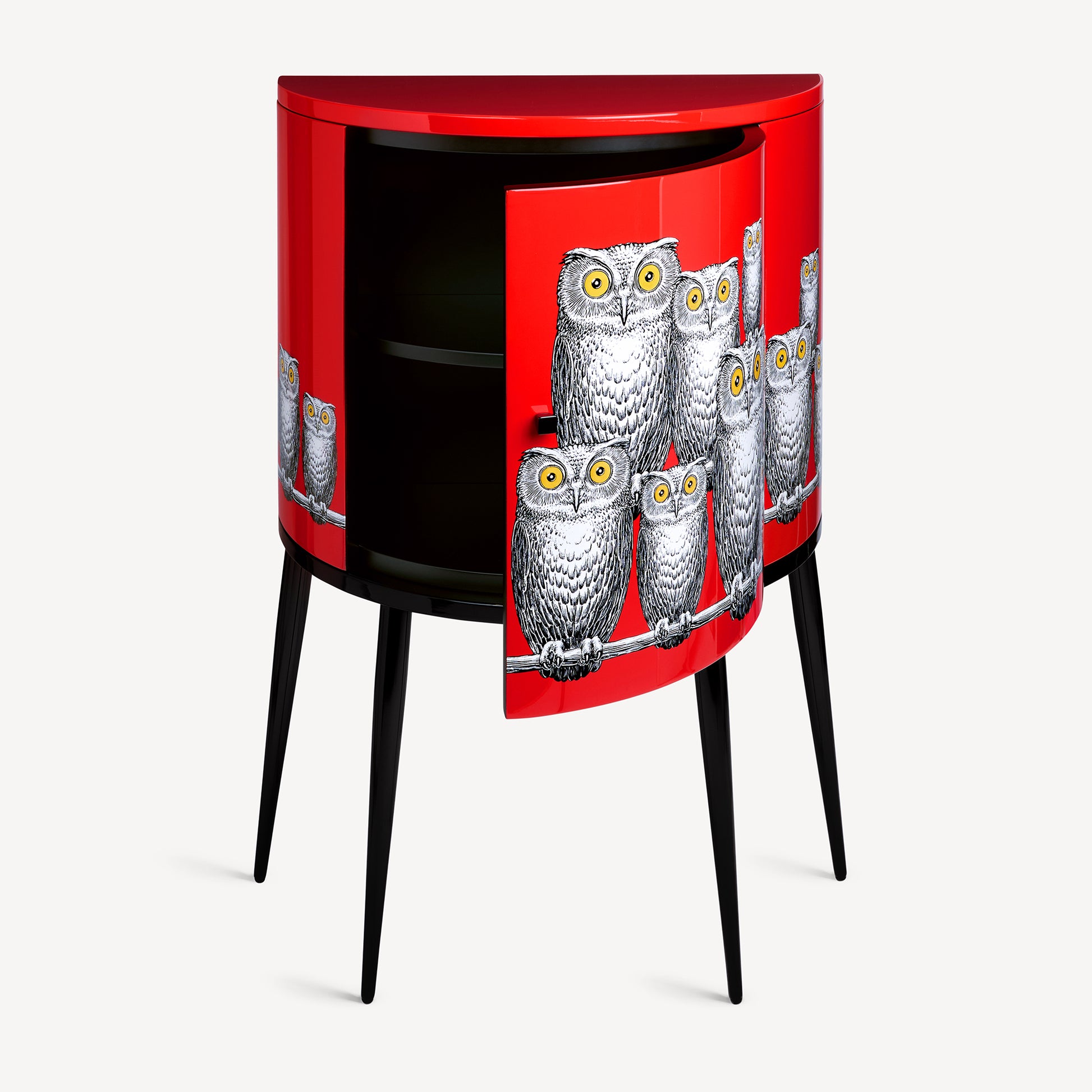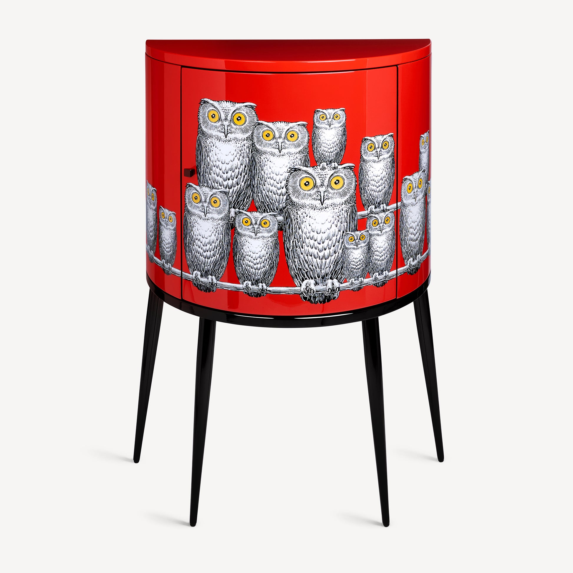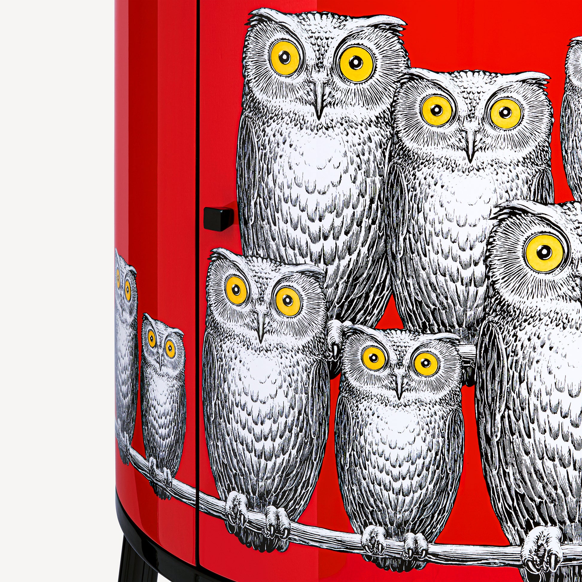 - Sur un fond rouge profond, le regard des chouettes définit une présence silencieuse et magnétique.