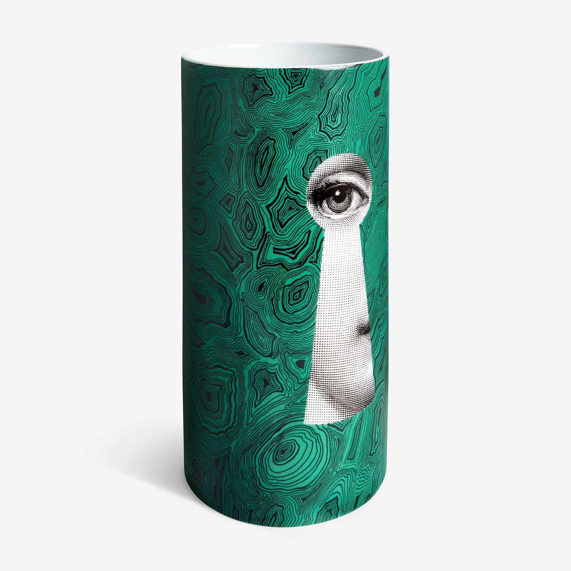 - Une serrure se détache sur ce vase en porcelaine décoré à la main, superposée à un vert malachite profond, dans un jeu subtil entre mystère et ornement.