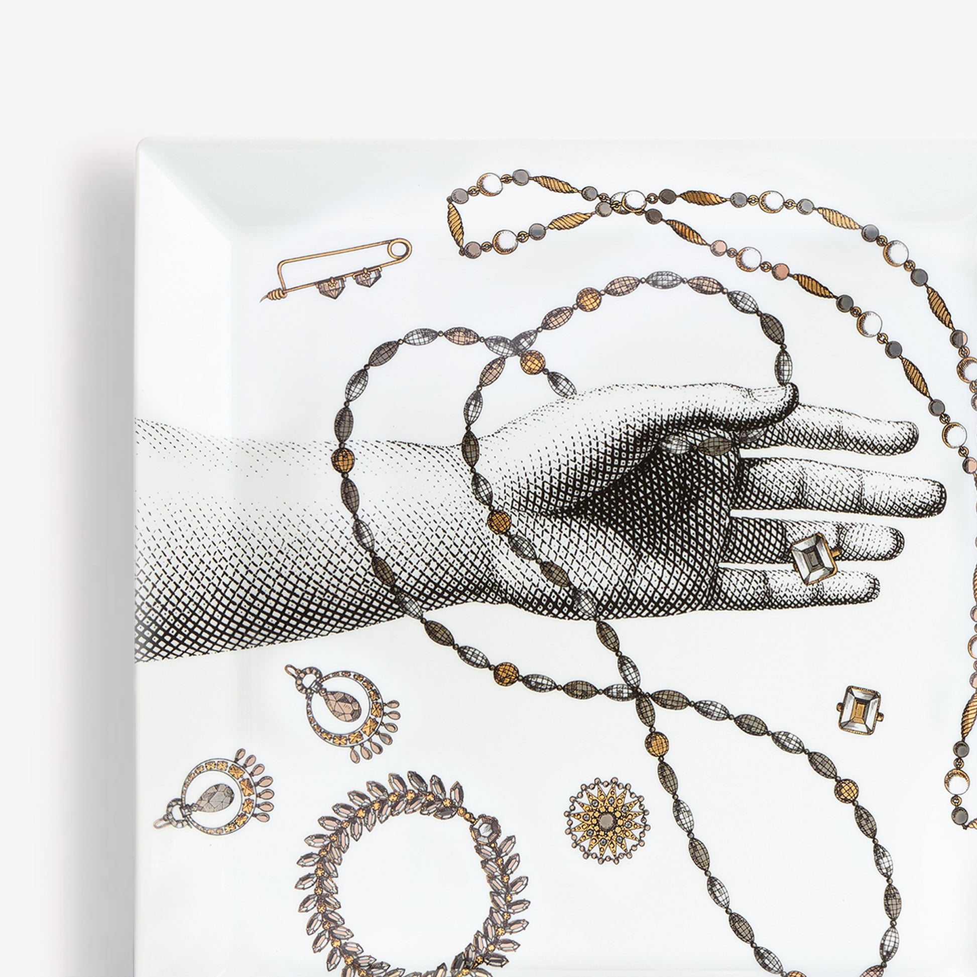 - Pour Fornasetti, la main, archétype de l’artiste, fonctionne à la fois comme un outil de création et comme un motif ornemental qui intègre les objets réalisés. Des mains qui tiennent des crayons, portent des bijoux, attrapent des papillons ou se moquent avec le geste du pied de nez peuplent la nouvelle collection de précieuses porcelaines conçues pour enrichir la table, garder des cartes et des petits objets, ou être exposées comme un pur élément décoratif.
