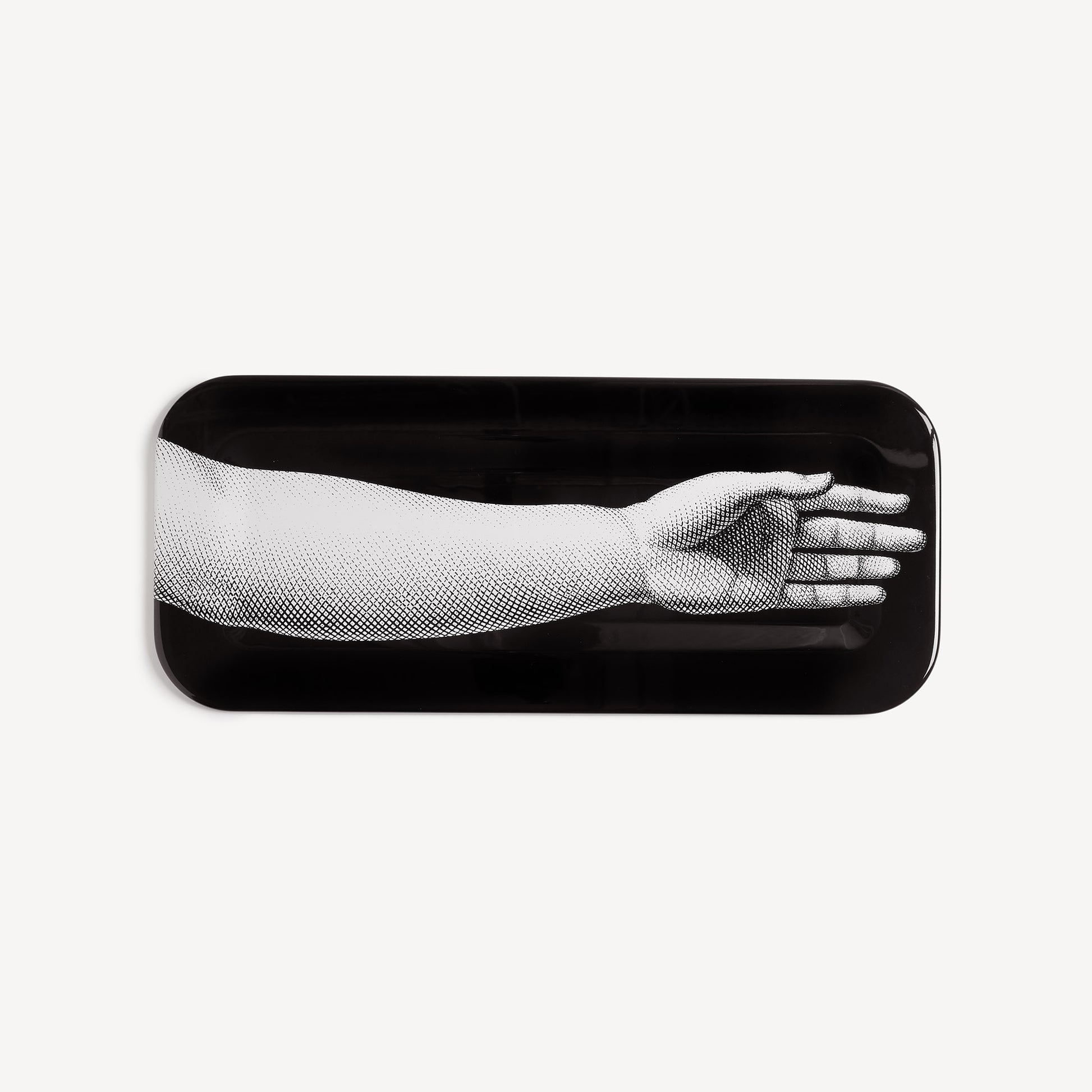 - Avec sa forme similaire à une feuille de papier, ce plateau est le complément qui convient le mieux à accueillir les motifs de l’Atelier. Décorée à la main, cette création s’agrémente d’un motif anatomique, très apprécié de Fornasetti. Combiné à un support pliable, ce plateau peut se transformer en table d’appoint.