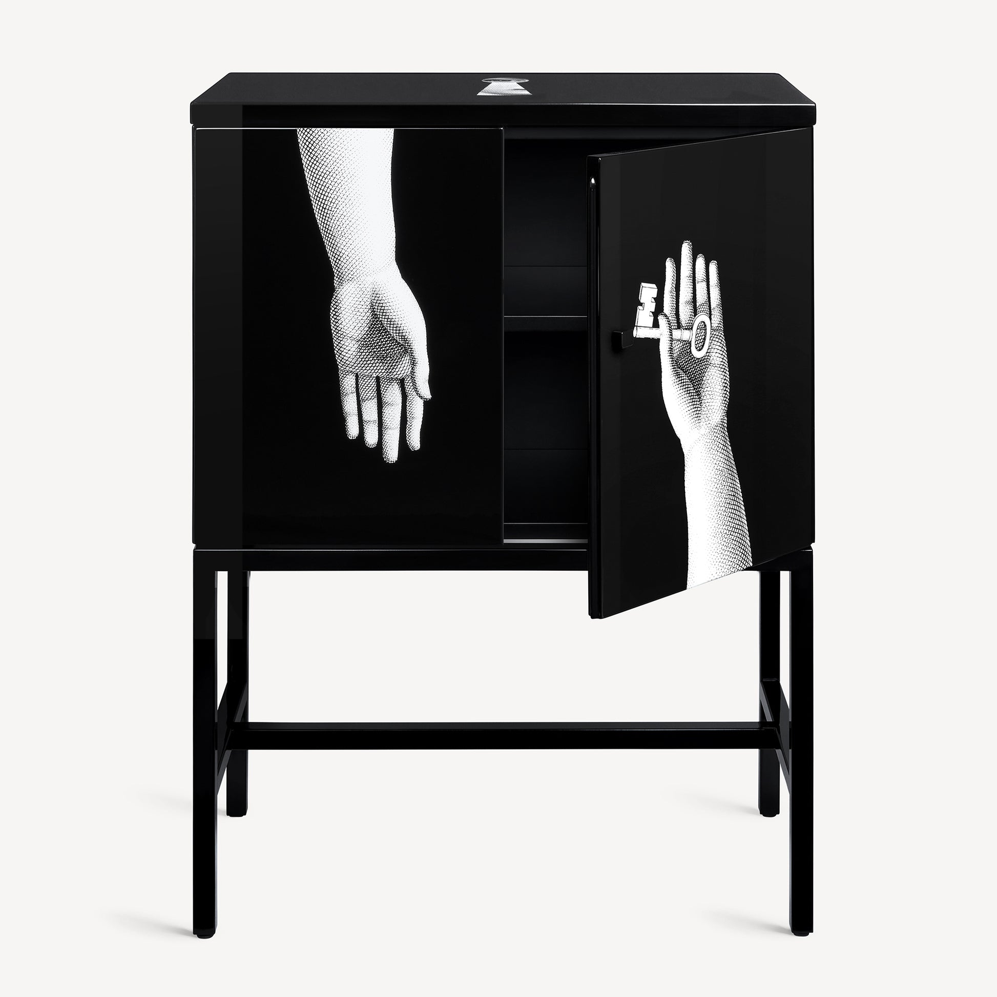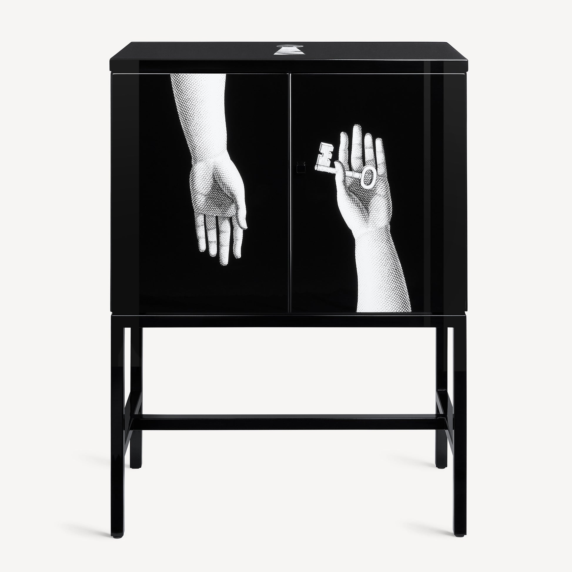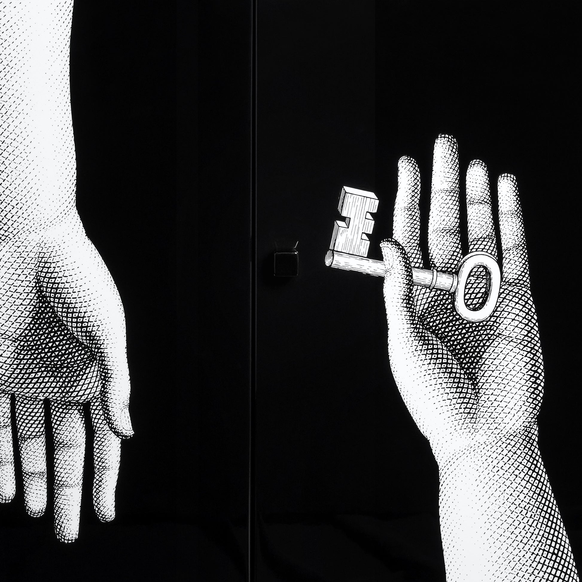 - La main iconique Fornasetti se multiplie sur la surface de ce cabinet, tandis que clé et serrure instaurent un jeu entre décor et fonction.