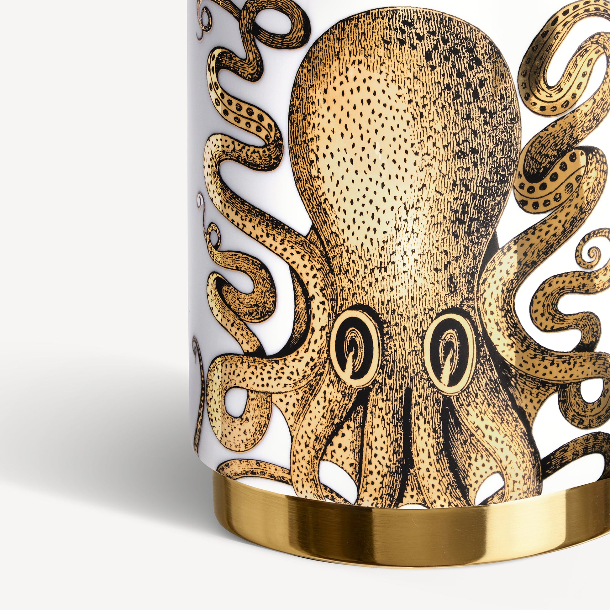 - Les tentacules d’un poulpe se déploient sur la surface de cette bougie en porcelaine décorée à la main, dans un dessin riche en détails et d’une grande fluidité.