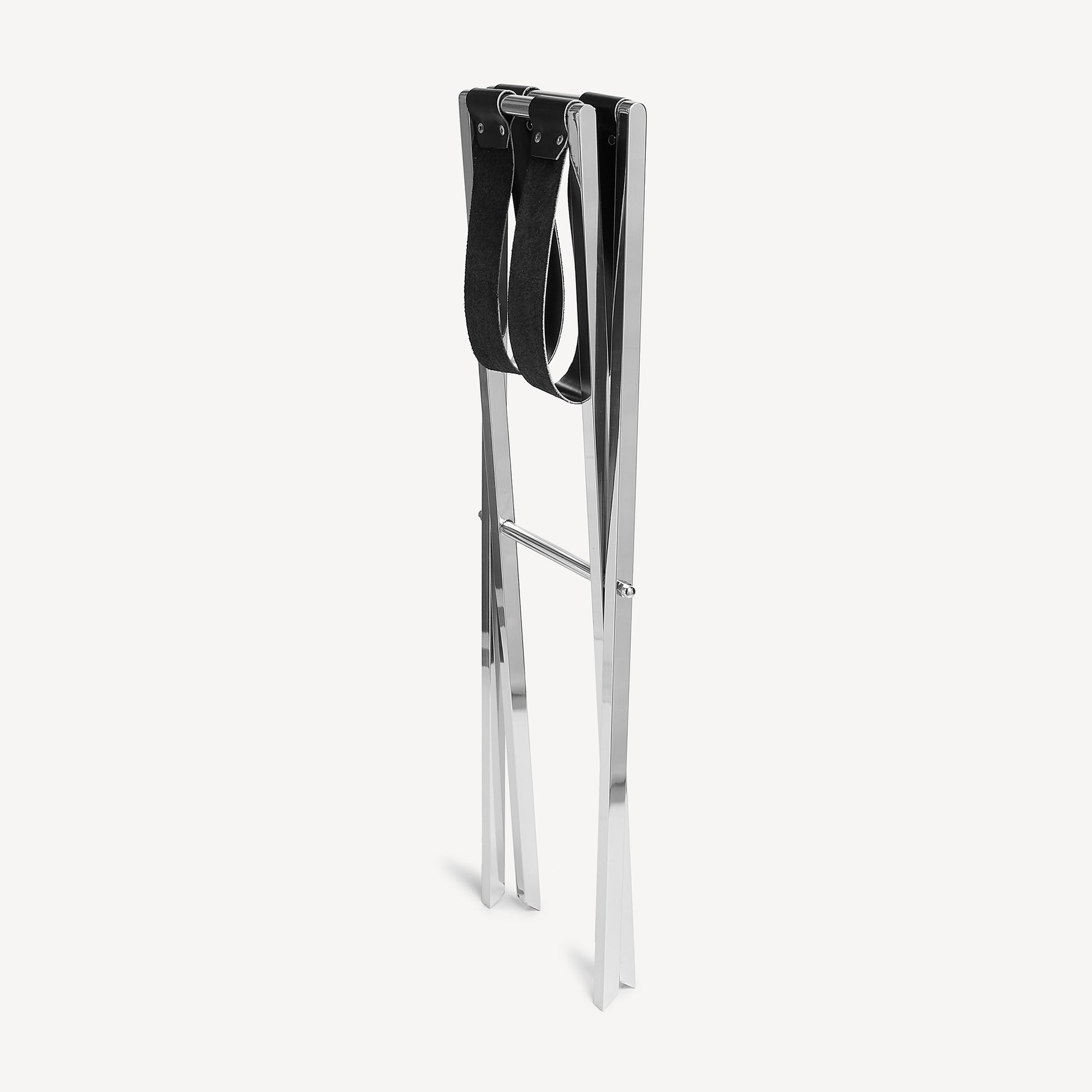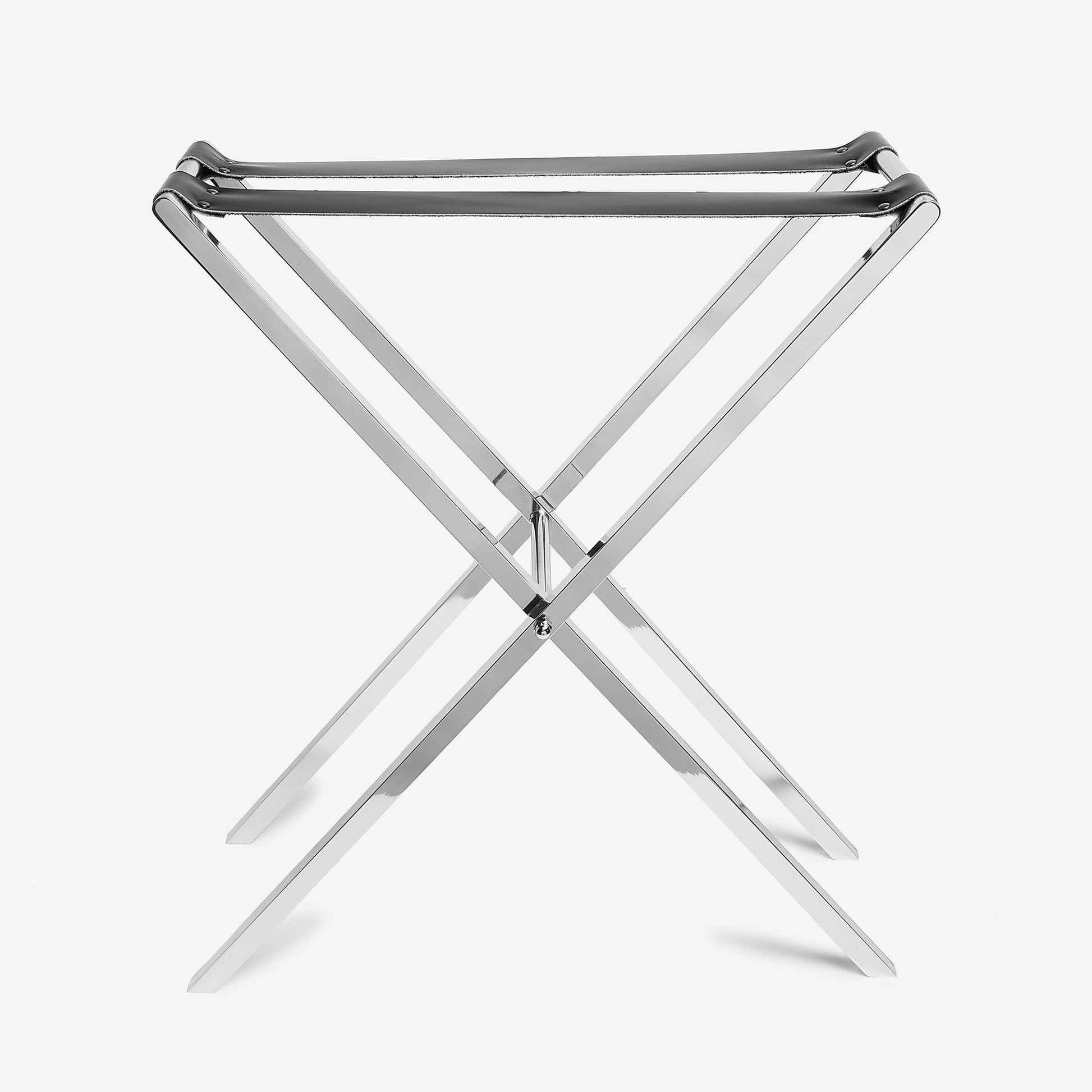 - Ce support pliable en fer chromé, renforcé par des lanières en cuir, permet de transformer le plateau en table d’appoint. Ce simple objet du quotidien acquiert ainsi une nouvelle fonction d’utilisation et de plaisir.