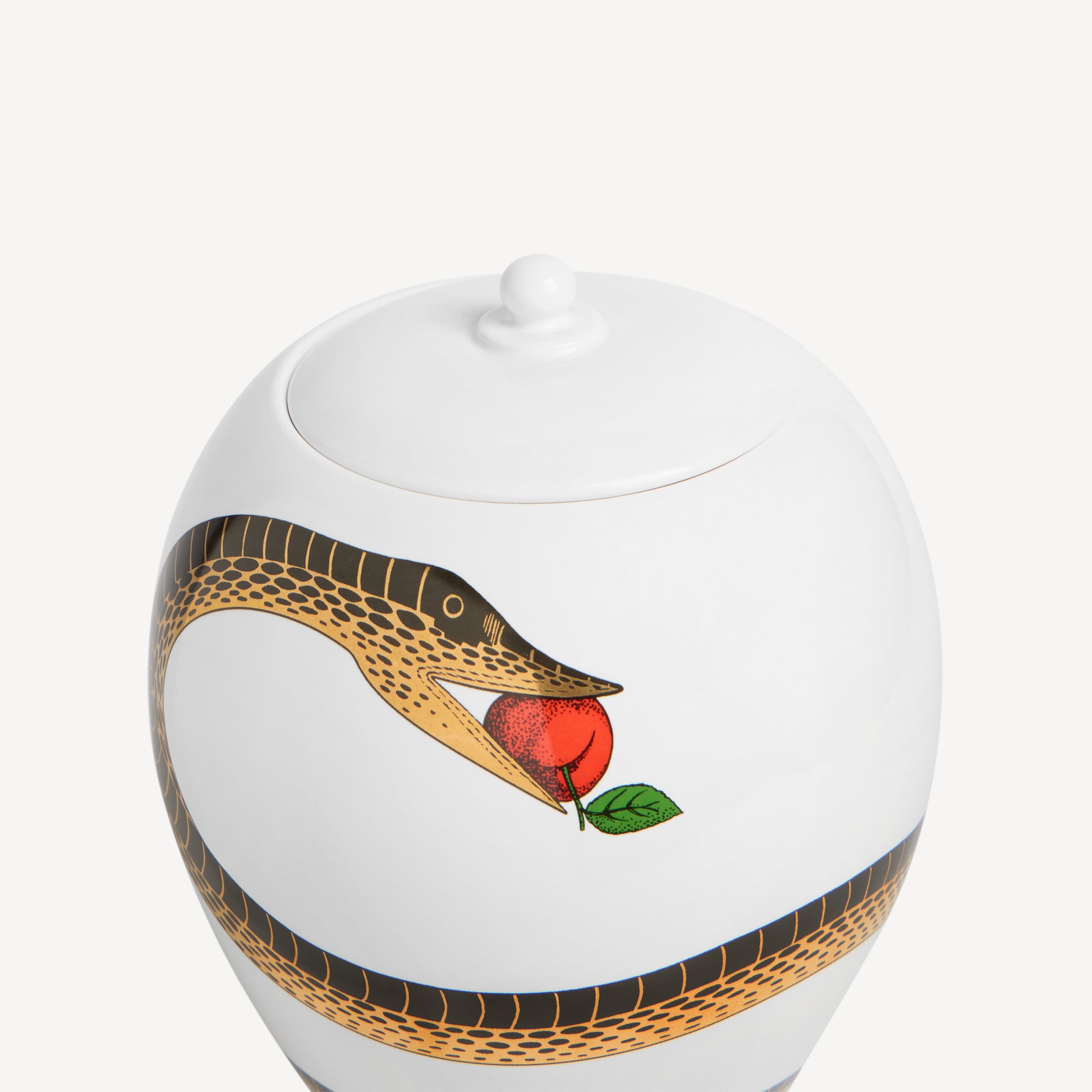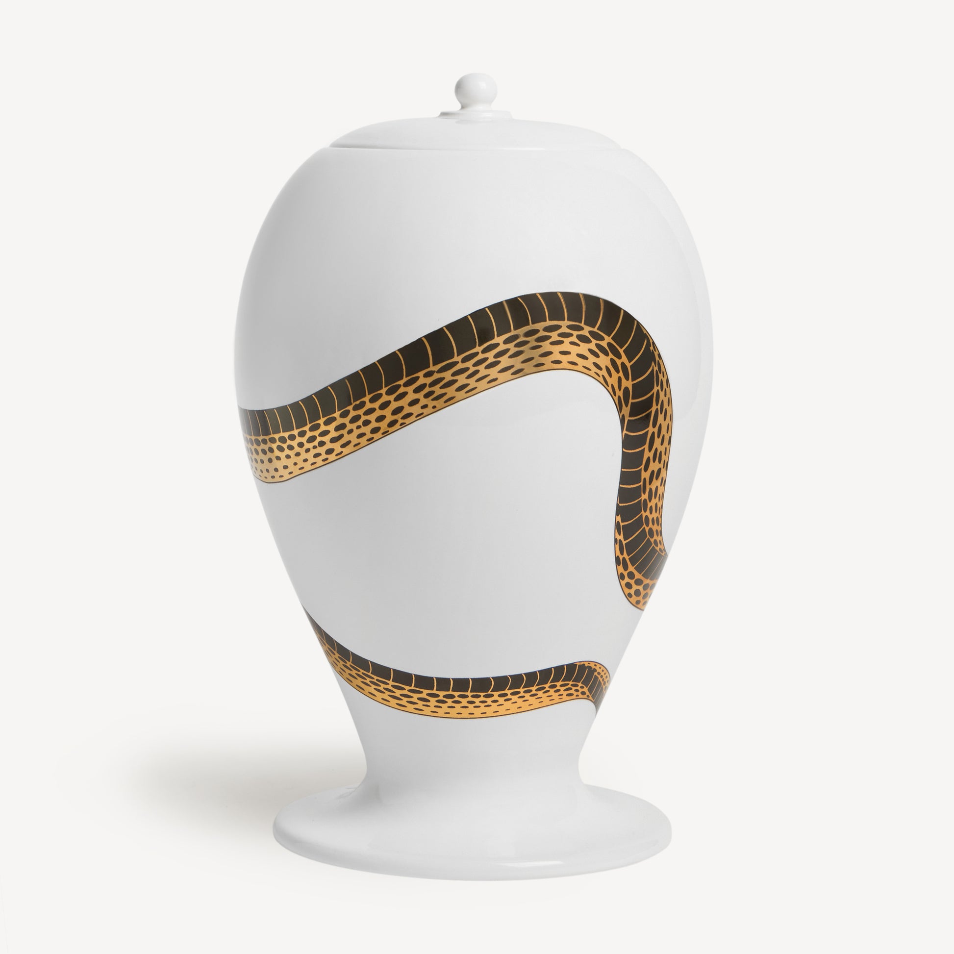 - Un serpent s’enroule avec souplesse autour de ce vase en porcelaine décoré à la main, créant un jeu captivant de lignes et de mouvement.