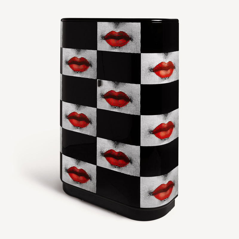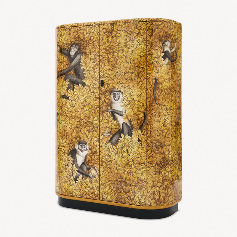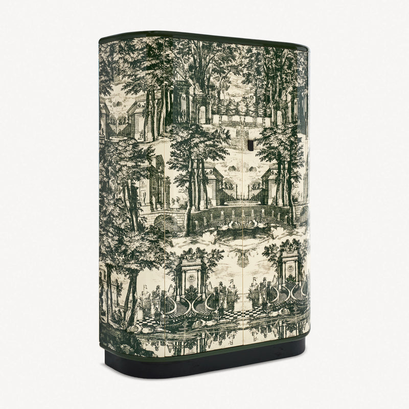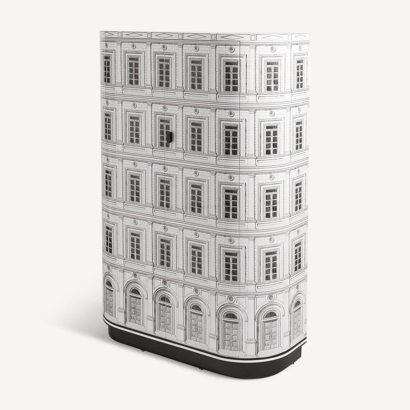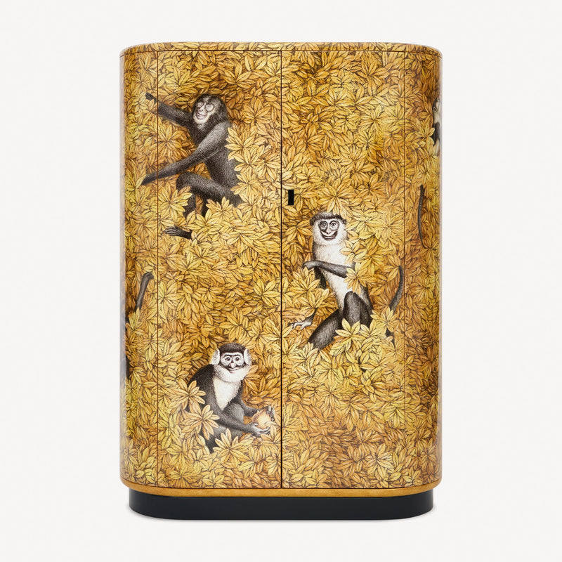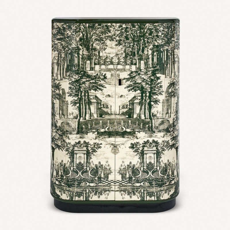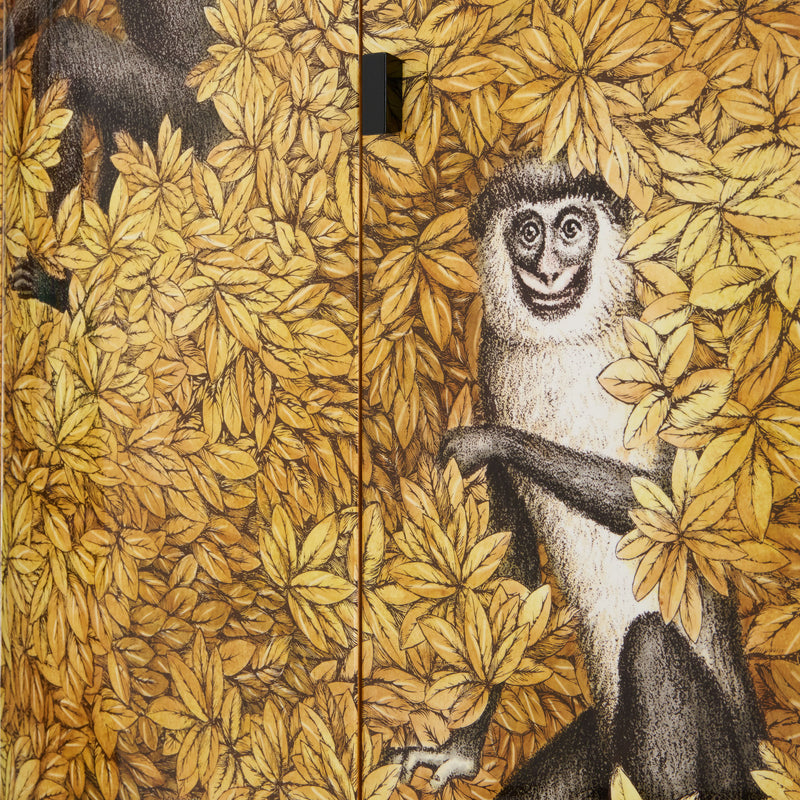 Questo mobile è un omaggio alla tradizione dei decori zoomorfi. La zebra spunta da un cespuglio di foglie e fa capolino nel regno domestico. Il mondo onirico di Fornasetti fa del salotto il suo habitat ideale.