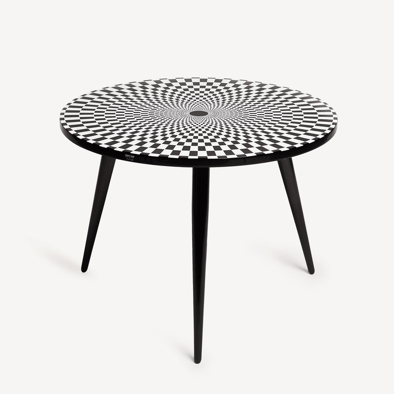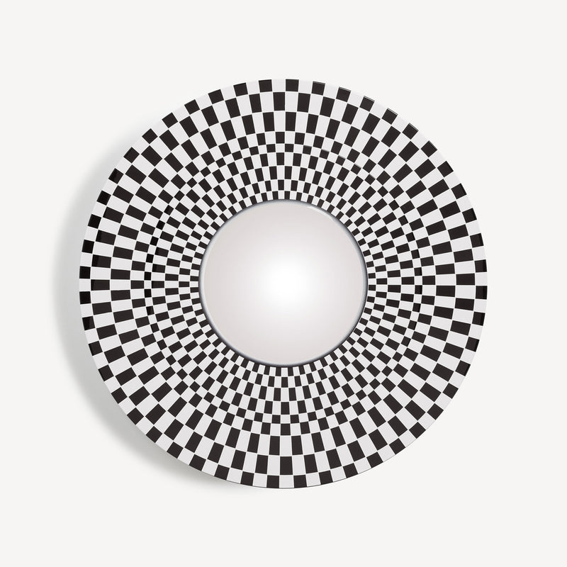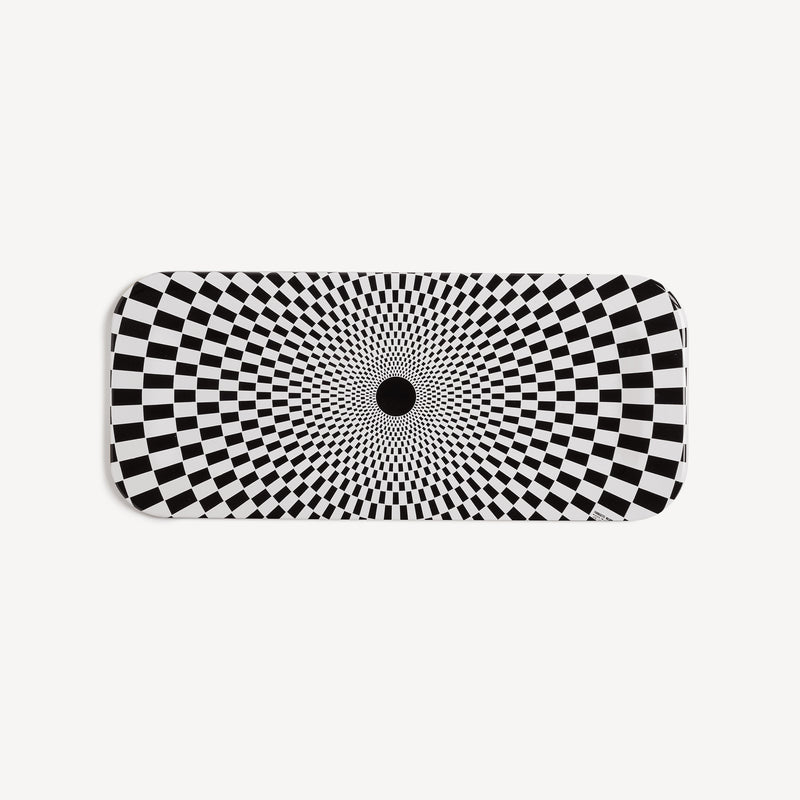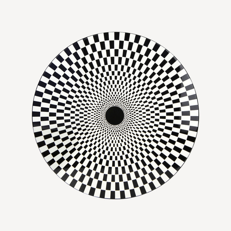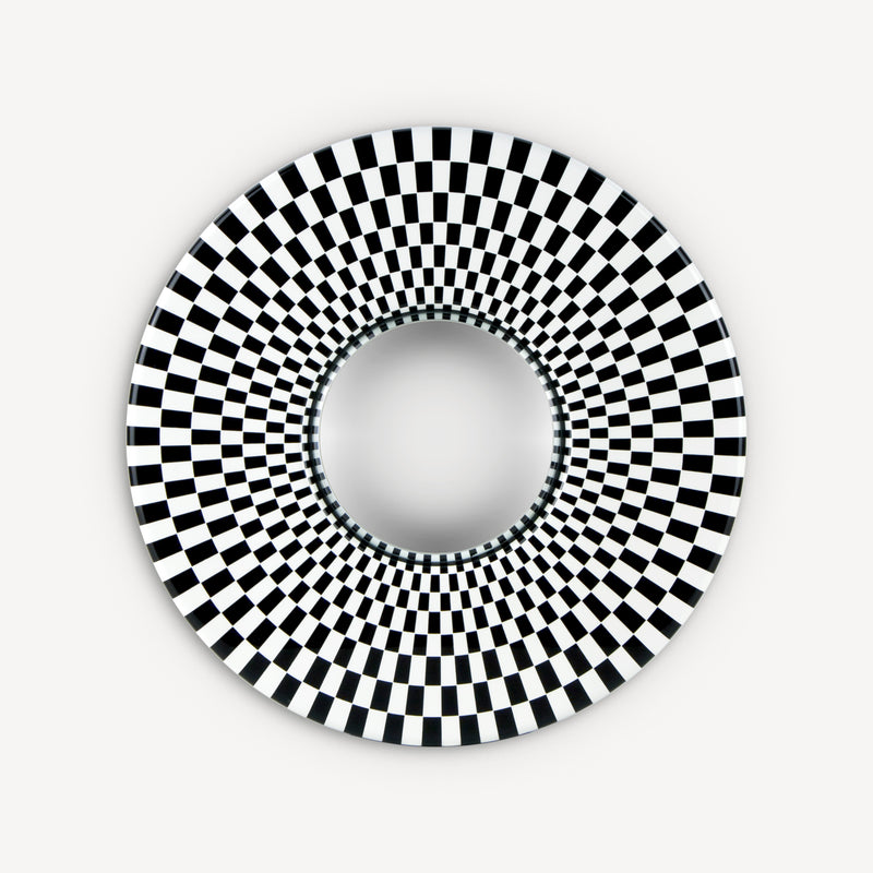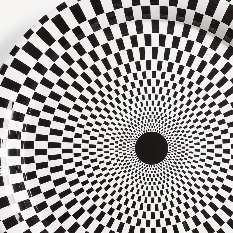 Sperimentatore ed esploratore di ogni angolo dell’esistente, Fornasetti si dedica alle geometrie optical nella serie Egocentrismo. Variazioni sul tema della scacchiera, illusioni percettive che giocano sul contrasto fra bianco e nero disegnando spirali immaginarie. Un’incursione di Fornasetti nell’arte astratta, minimale e contemporanea, senza rinunciare al suo spirito eccentrico.