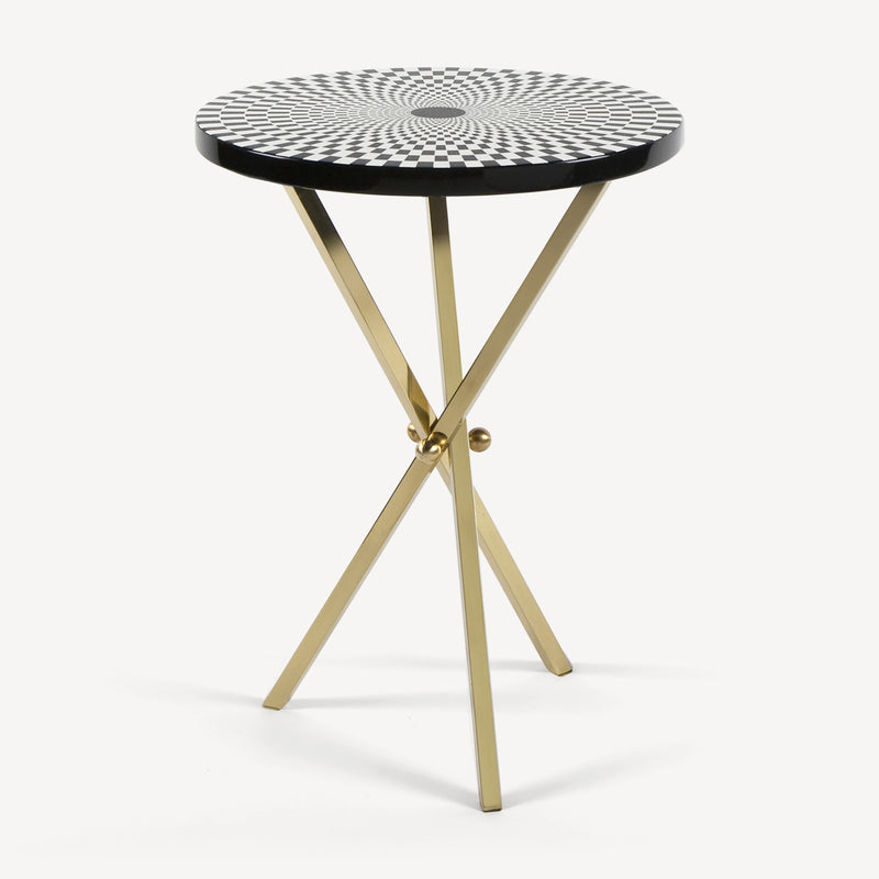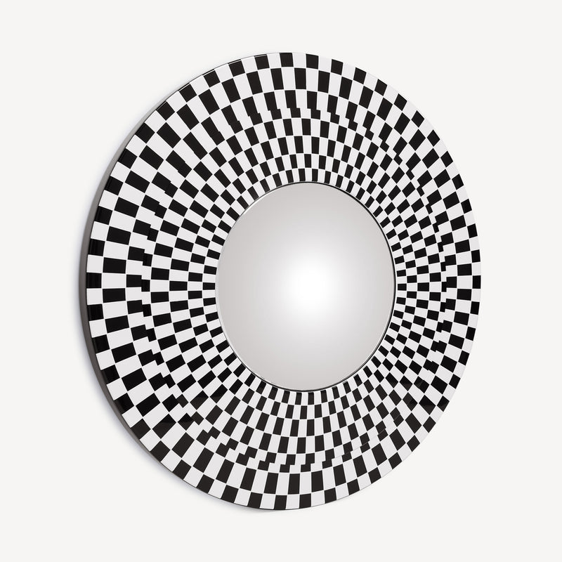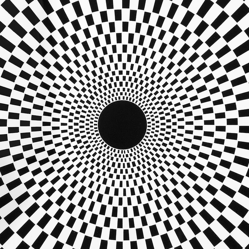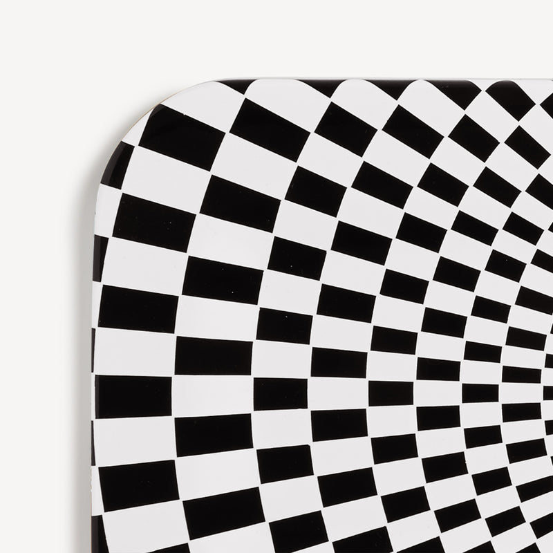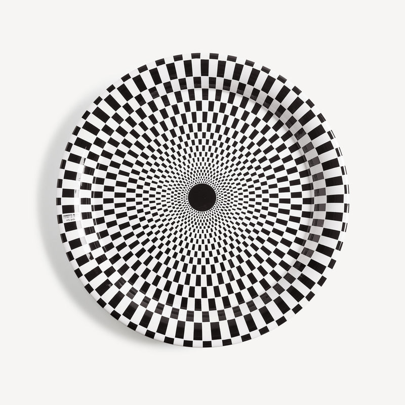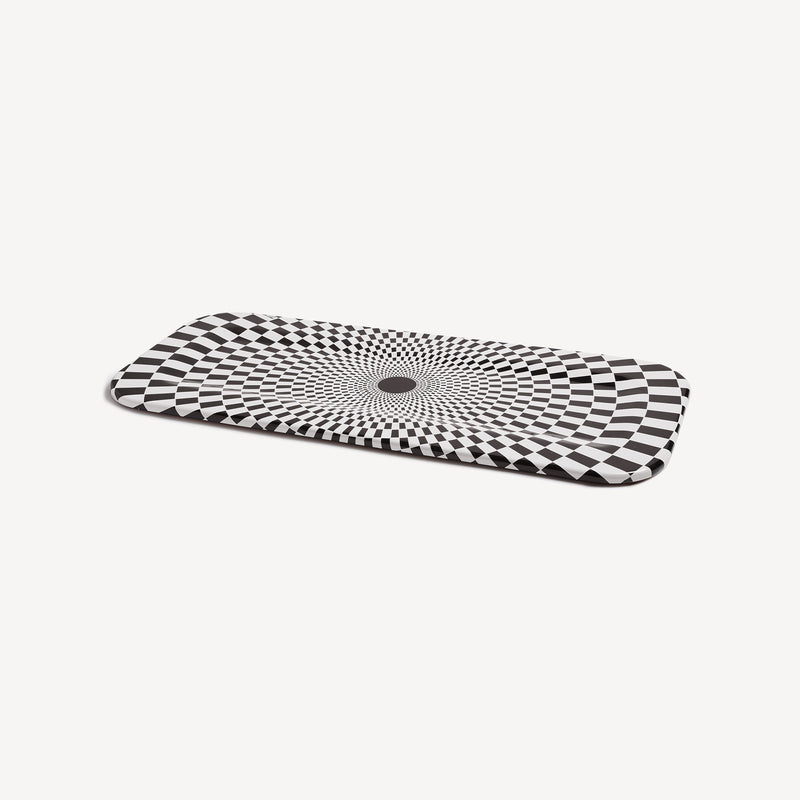 Sperimentatore ed esploratore di ogni angolo dell’esistente, Fornasetti si dedica alle geometrie optical nella serie Egocentrismo. Variazioni sul tema della scacchiera, illusioni percettive che giocano sul contrasto fra bianco e nero disegnando spirali immaginarie. Un’incursione di Fornasetti nell’arte astratta, minimale e contemporanea, senza rinunciare al suo spirito eccentrico.