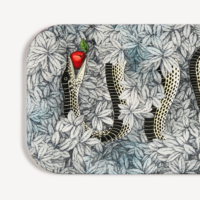 Fornasetti è uno scienziato dell’immaginazione: si muove con rigore nello studio del reale per trasformarlo con il suo tratto nero e una sapiente dose di follia. Nella sua enciclopedia creativa riscrive i Bestiari e gli Erbari medievali accostando mitologie, suggestioni e archetipi differenti. Nasce così il decoro Peccato Originale: le spire del serpente si insinuano in una selva di fogliame per riscrivere le sorti del Giardino dell’Eden su complementi d’arredo come vassoi, portacarte, cuscini e sull’iconico stipo Fornasetti.