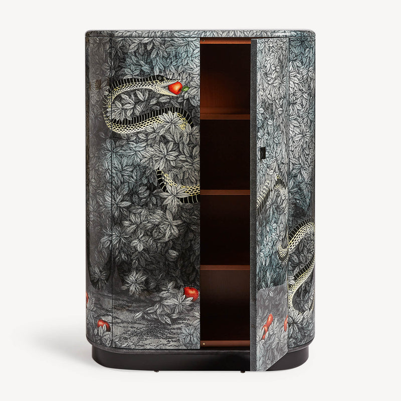 Sinuoso anche nelle forme, il mobile contenitore si trasforma in un Paradiso terreste abitato dal serpente tentatore. Ogni singolo dettaglio, dal fogliame alle mele, è dipinto a mano come da tradizione dell’Atelier Fornasetti.