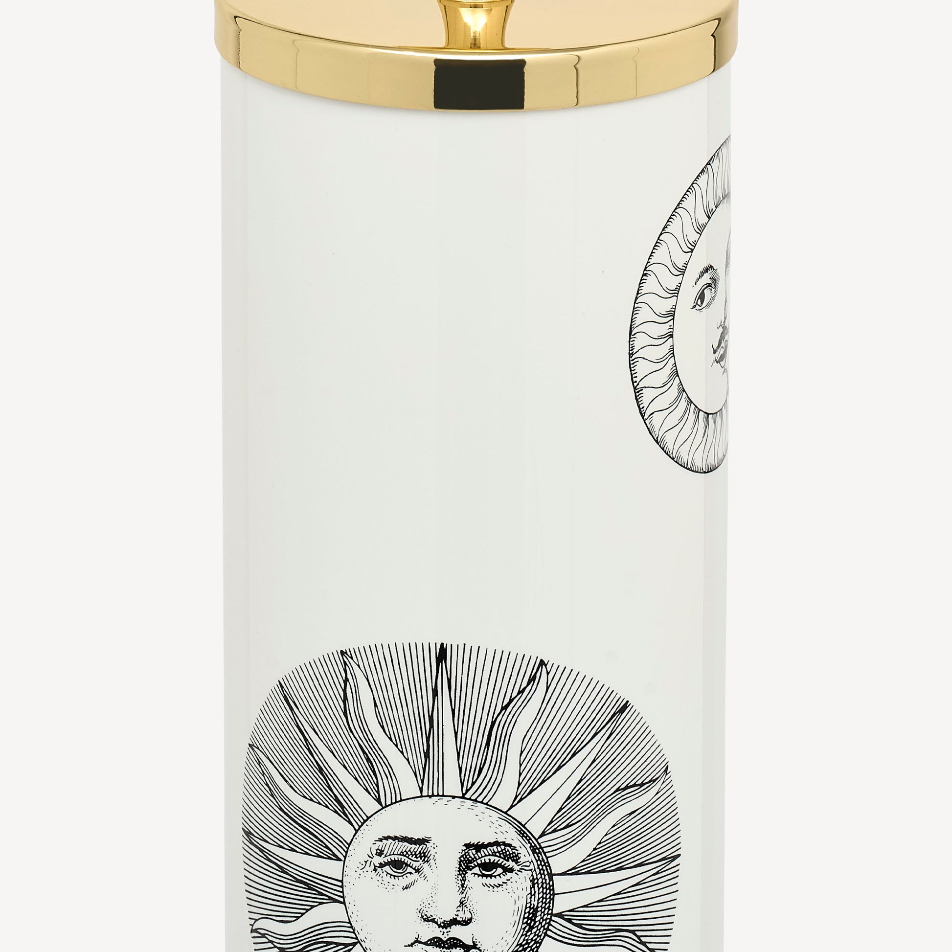Nel decoro Soli e Lune l'inconfondibile tratto grafico Fornasetti traduce un immaginario sistema solare in un sofisticato complemento per la casa. Nel sole con i baffi si riconosce un ironico autoritratto di Fornasetti.