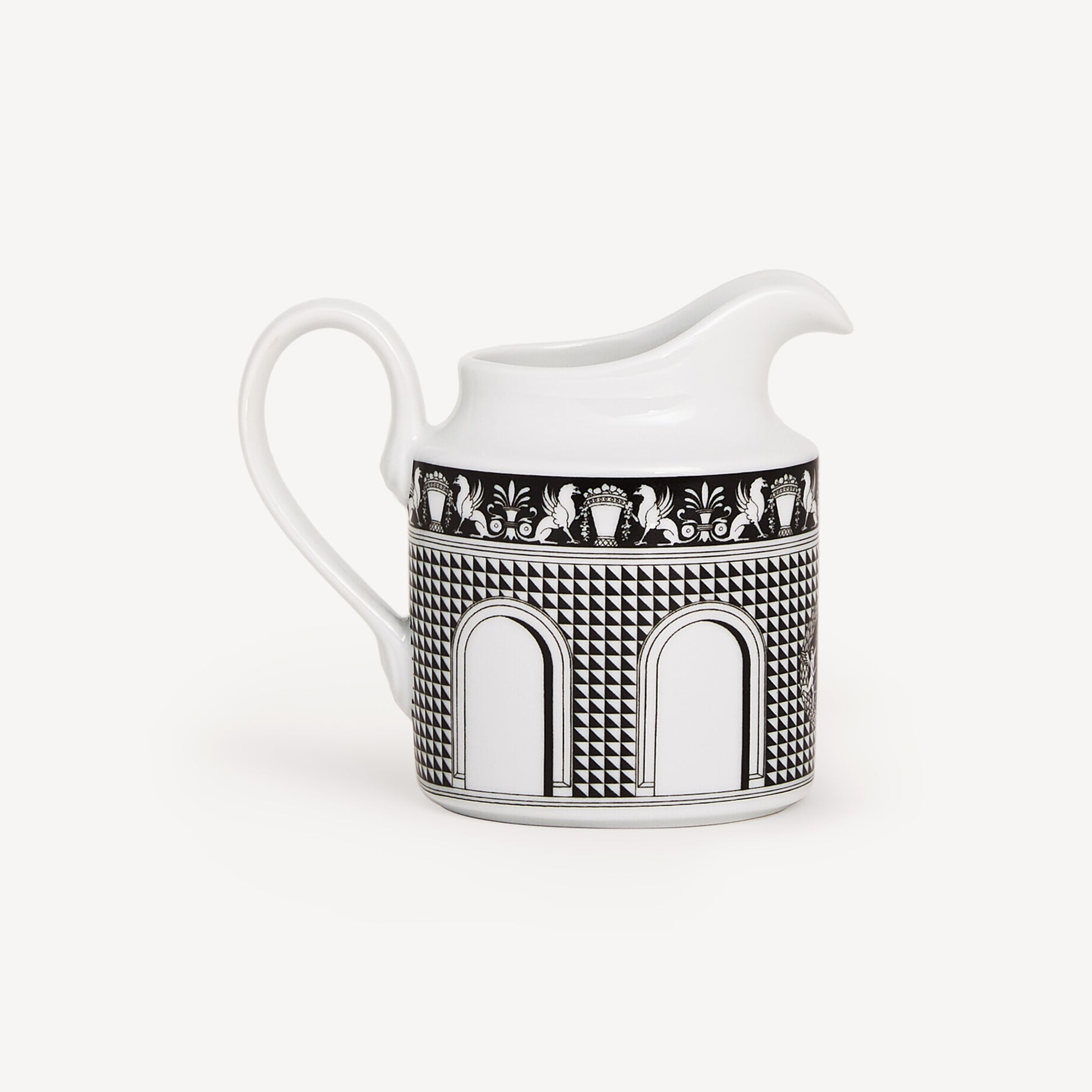 - Un elegante motivo architettonico riveste questa lattiera in porcellana decorata a mano, trasferendo l'immaginario fornasettiano su un oggetto per il tuo uso quotidiano che diventa così un pezzo da collezione.