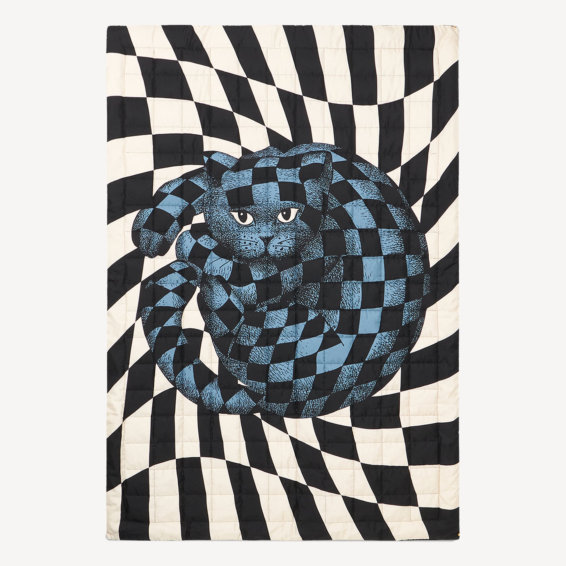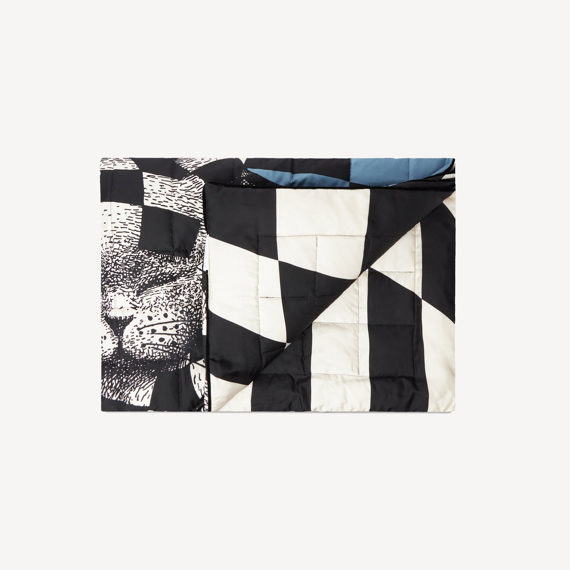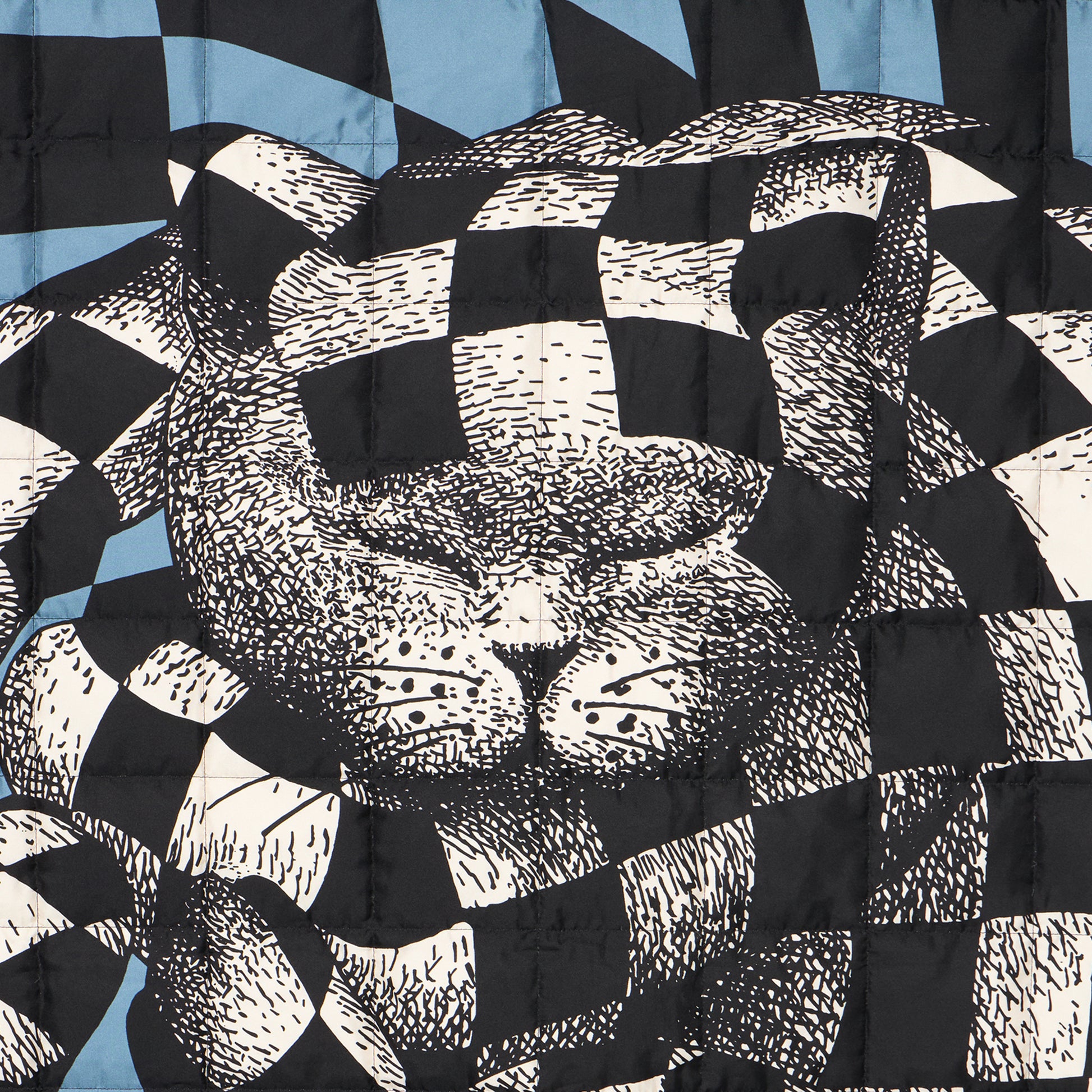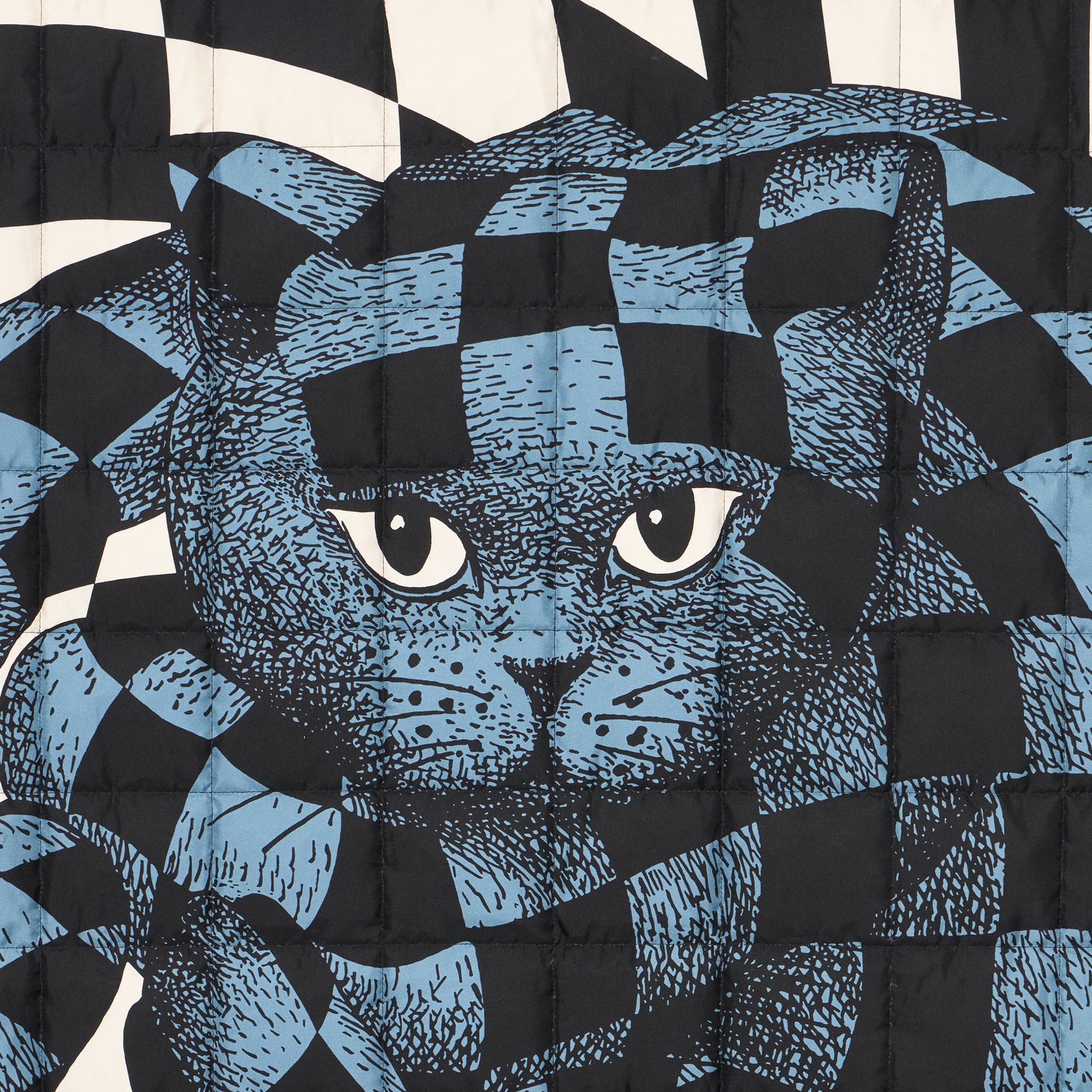 La sinuosità del gatto dialoga con il motivo geometrico del plaid in seta nei torni del blu, avorio e nero.