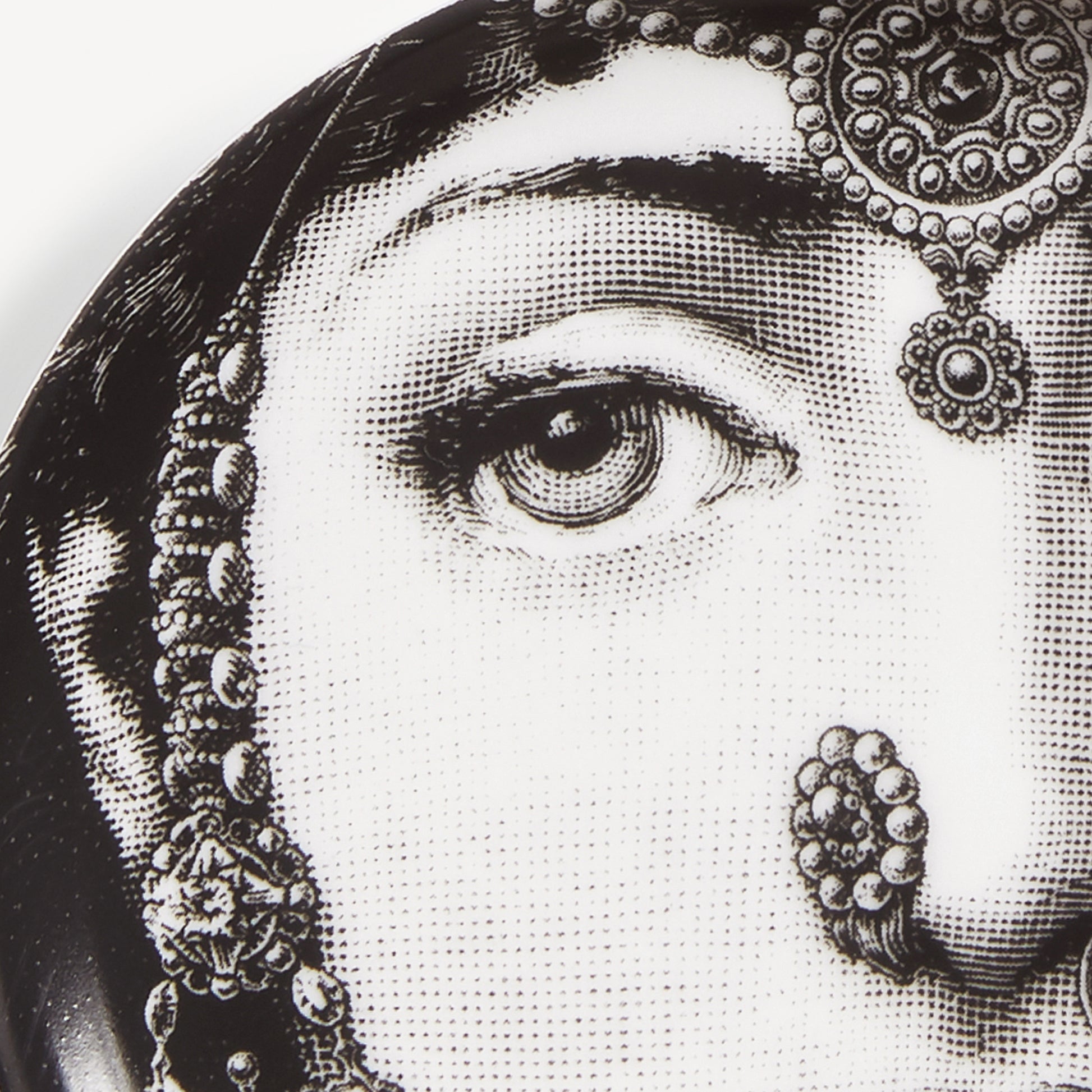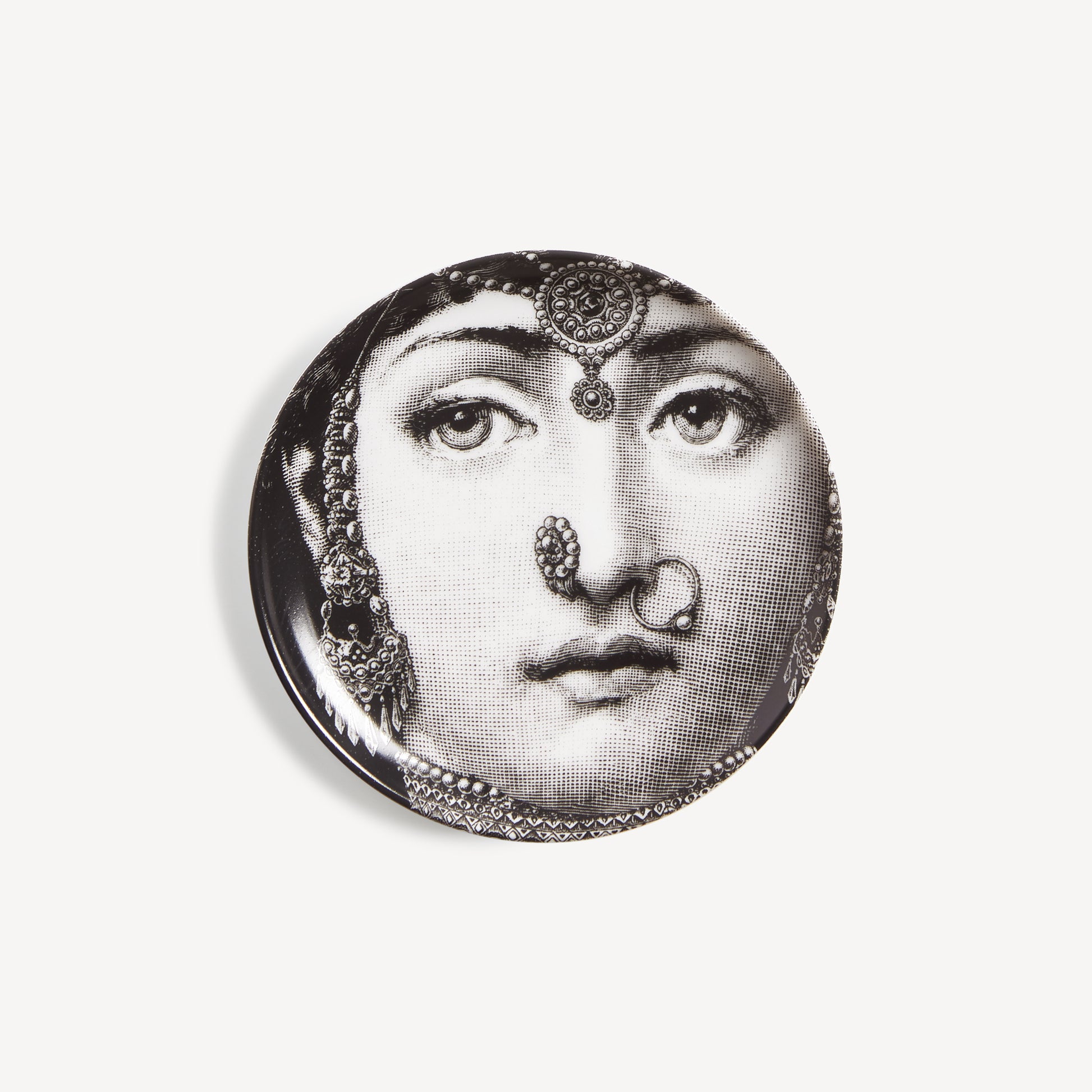 - La forma tonda di questo portaoggetti decorativo incornicia i lineamenti di Lina Cavalieri, in una delle innumerevoli interpretazioni che Fornasetti le ha dedicato nella serie Tema e Variazioni.