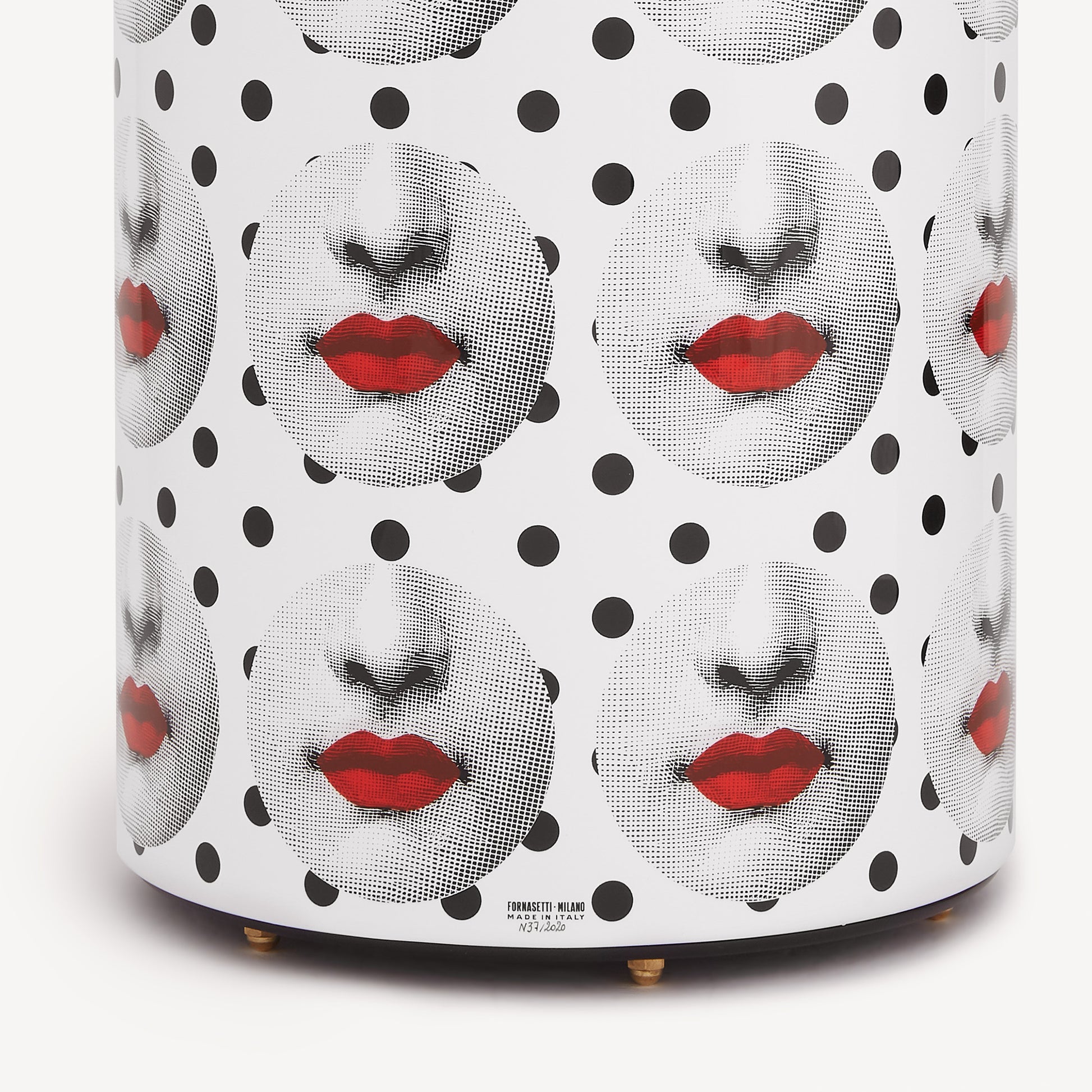 - L'inconfondibile ironia fornasettiana si esprime in questo decoro in cui il rosso delle labbra e le forme in bianco e nero creano ipnotici giochi visivi. Il portaombrelli è realizzato in metallo serigrafato e laccato a mano, con bordo superiore e piedini in ottone. Per la pulizia si raccomanda l'utilizzo di un panno umido senza detergente.