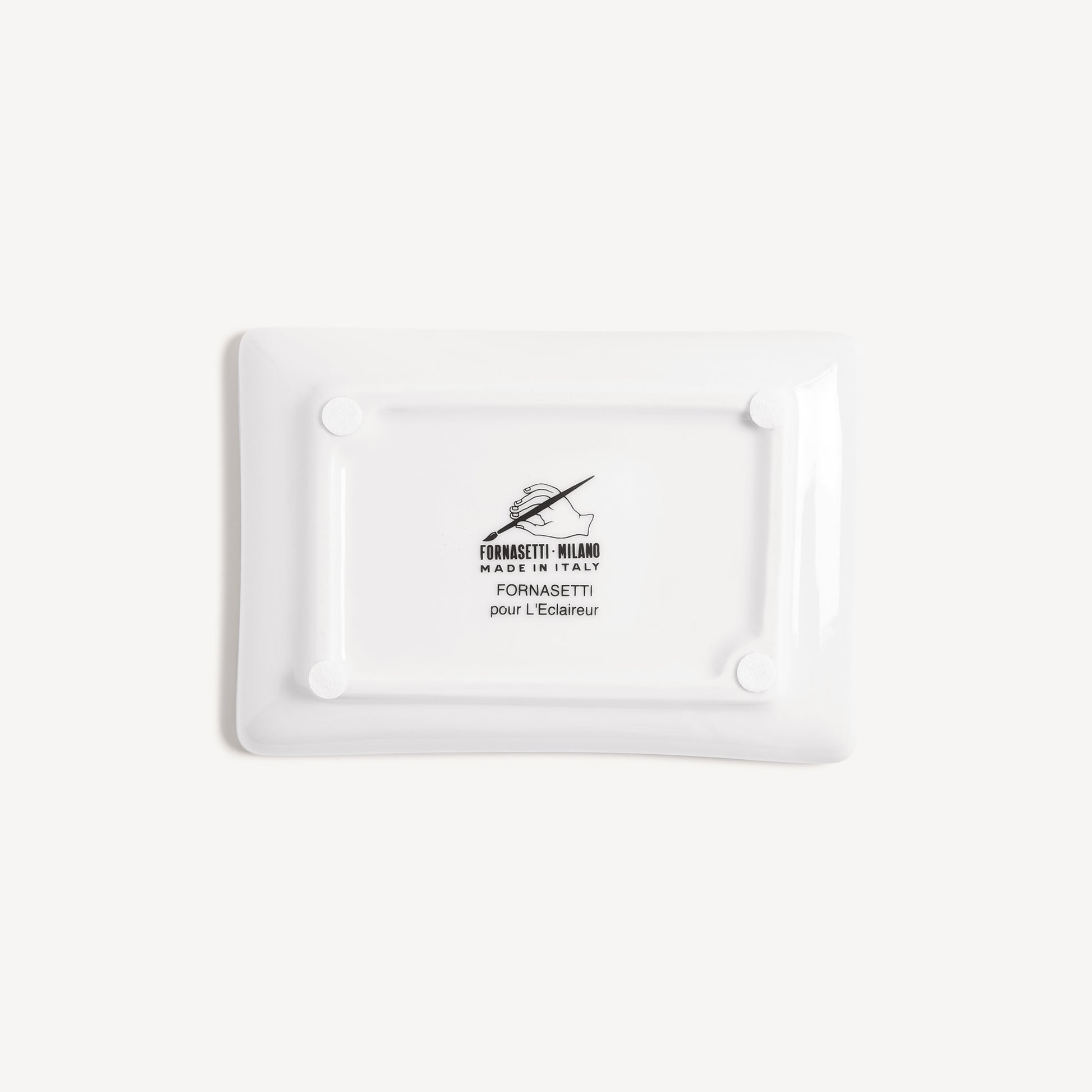 - La mano è un decoro ricorrente nella produzione di Fornasetti: qui, accompagnata da una colorata farfalla, impreziosisce questo posacenere a vaschetta in porcellana decorata e dipinta a mano.