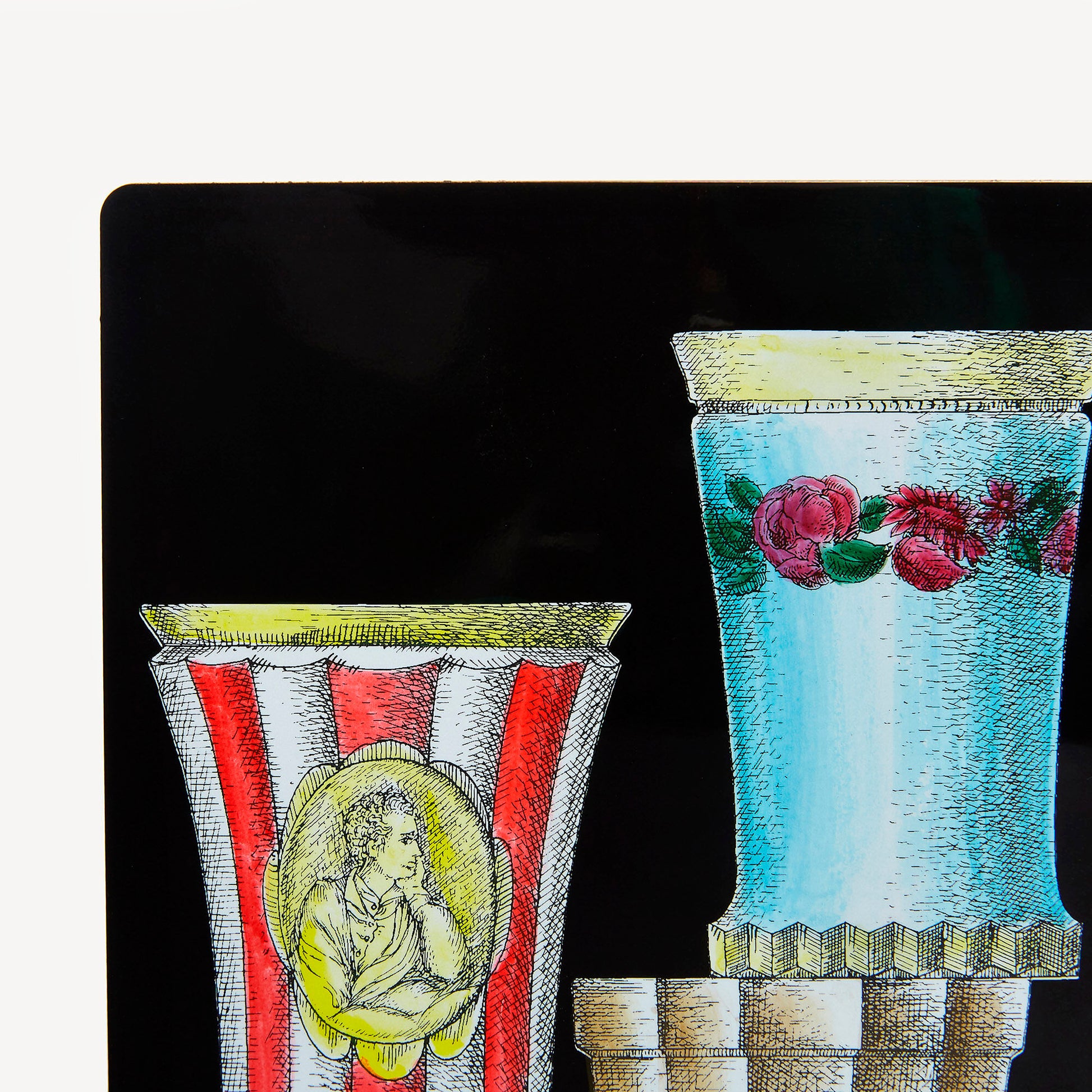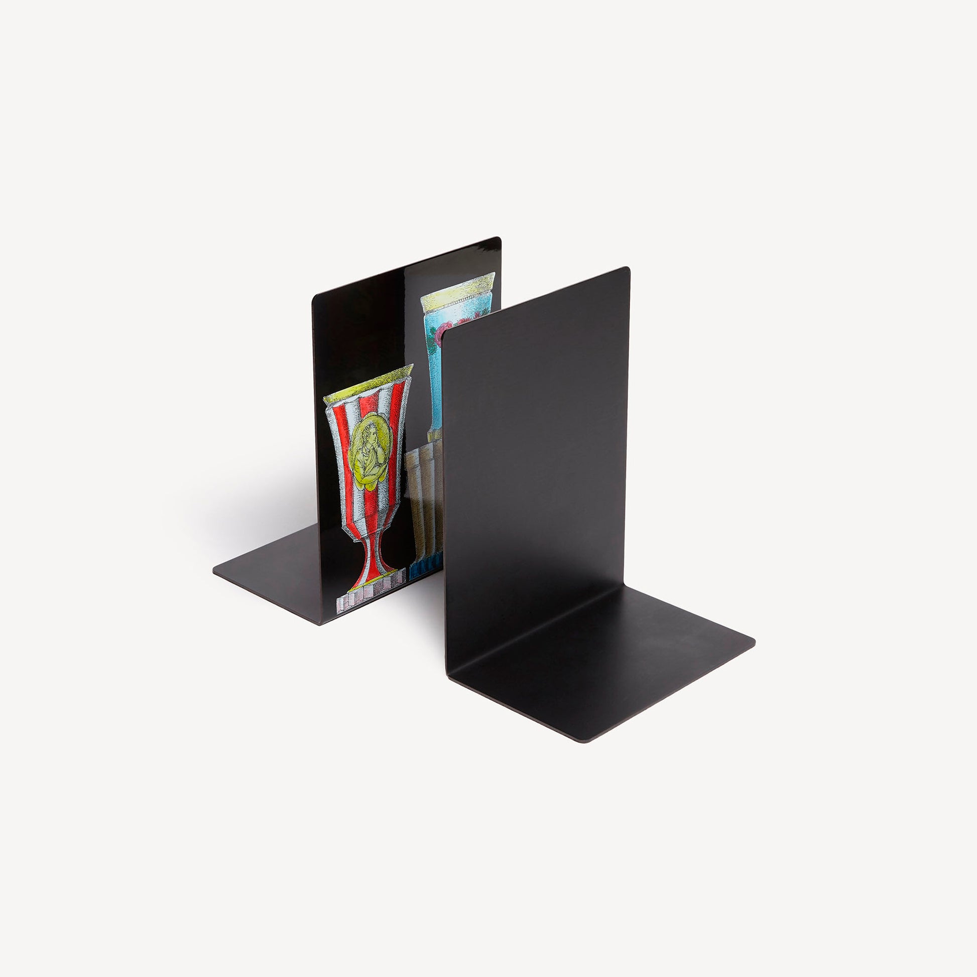 - Questa coppia di reggilibri in metallo serigrafato e dipinto a mano è impreziosita dal disegno di colorati bicchieri di cristallo: un elemento insolito per un complemento che cattura l'attenzione su qualunque mensola o ripiano.