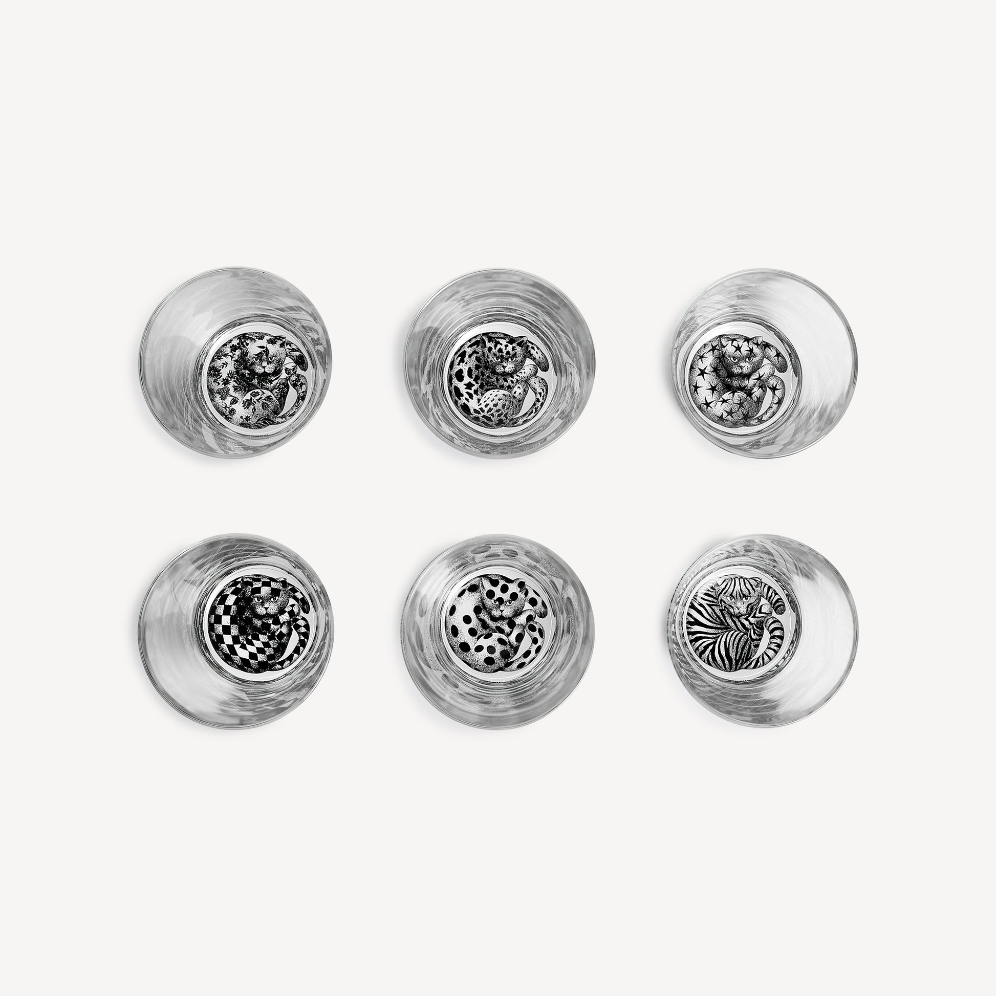 Questo set di sei bicchieri Fornasetti è l’accessorio di design ideale per servire acqua e bevande, trasformando un gesto quotidiano in un atto artistico.
