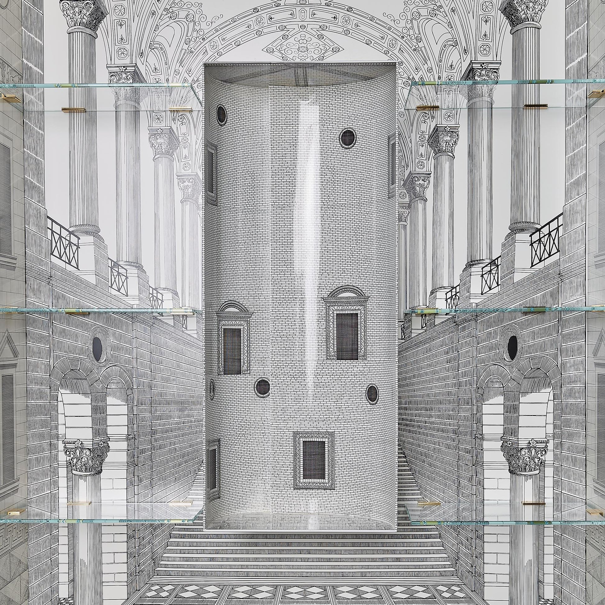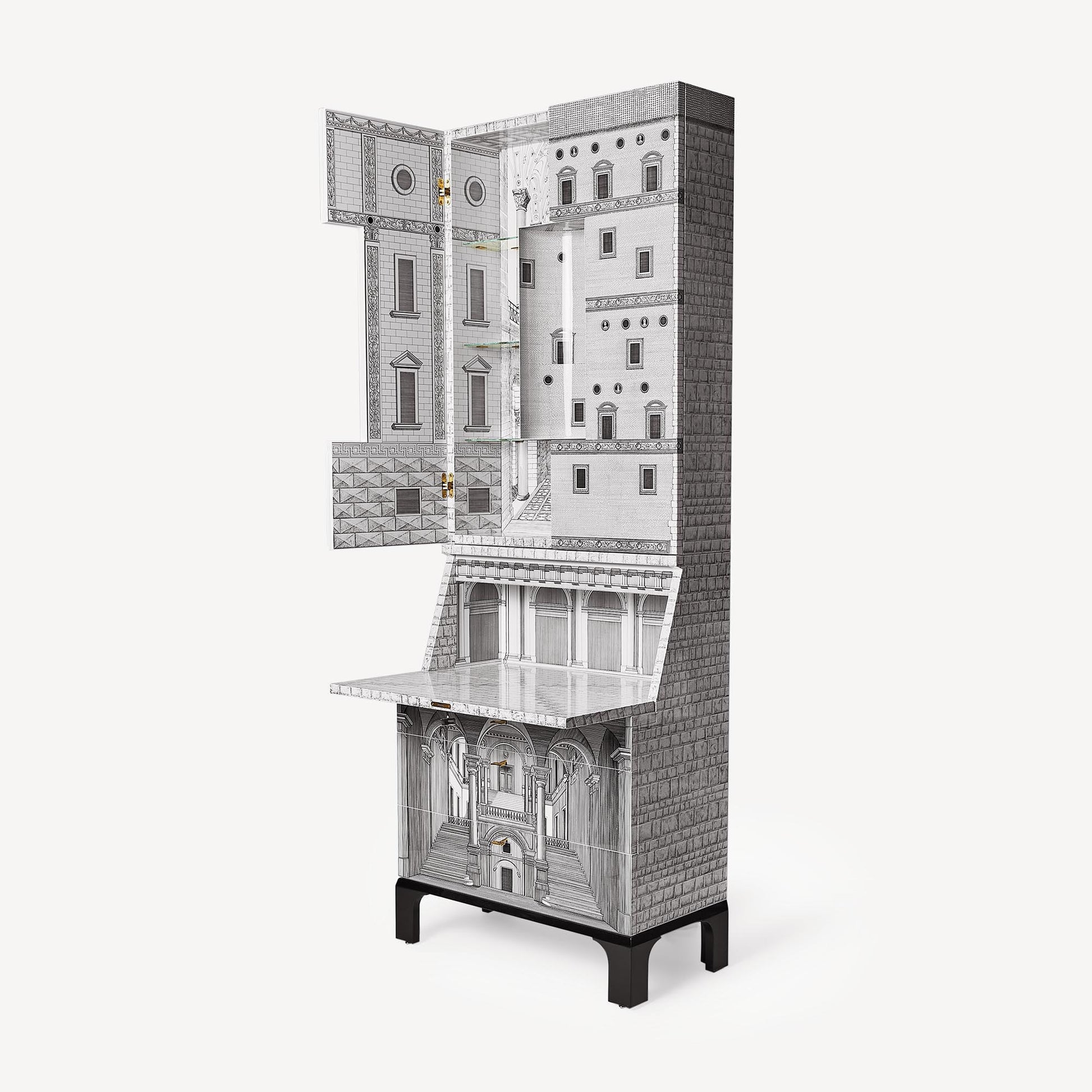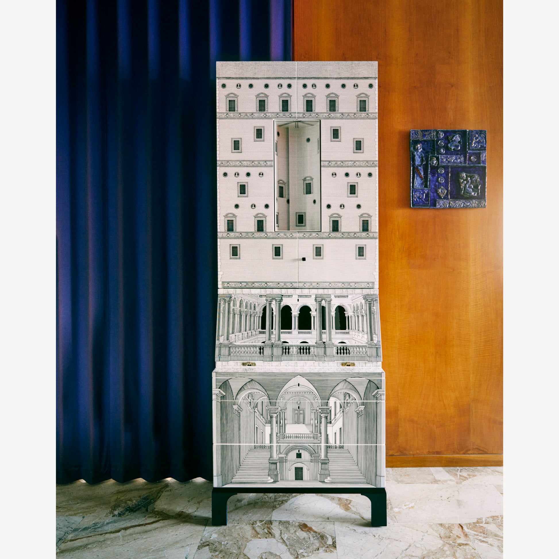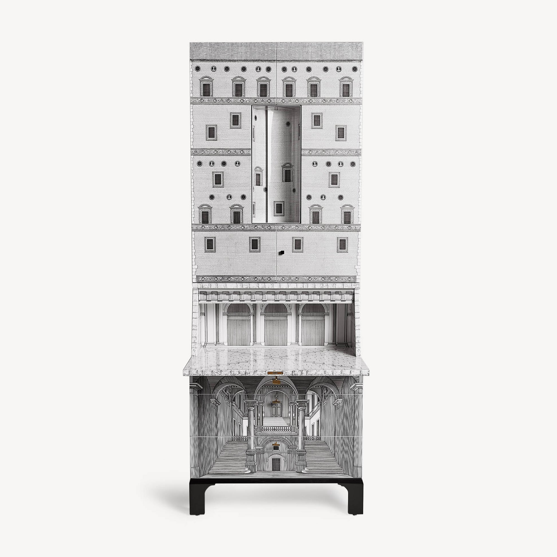 - Il trumeau Architettura è un mobile disegnato da Piero Fornasetti e Gio Ponti, riconosciuto come un'icona del design italiano d’autore. Viene ancora oggi realizzato artigianalmente in edizione limitata. Serigrafato e laccato a mano, presenta tre cassetti, una doppia anta e uno scrittoio a ribalta che si aprono su mondi immaginari.
