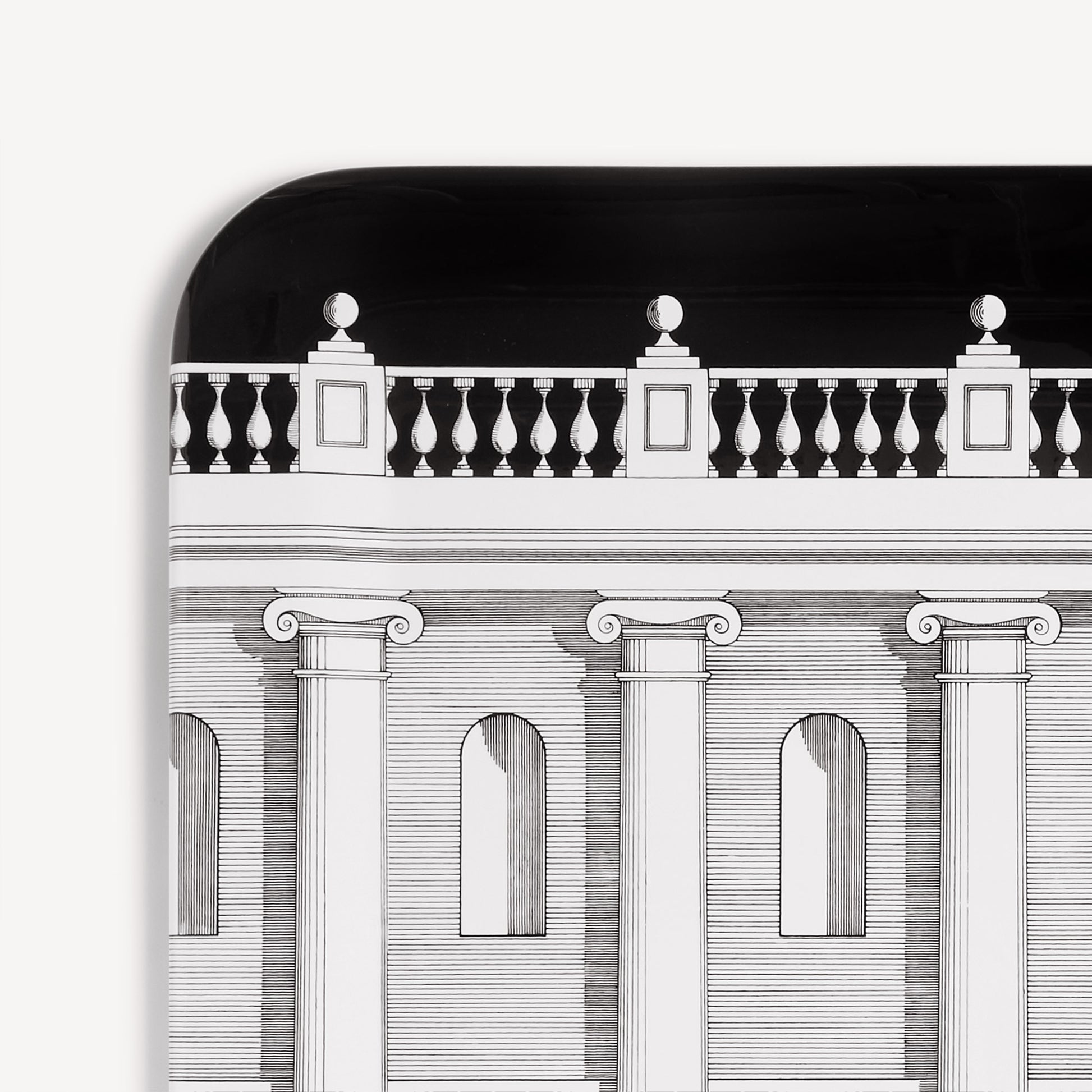 - Il vassoio, complemento che per forma e superficie più di tutti si avvicina a un foglio di carta, ha sempre offerto a Fornasetti grandi possibilità espressive. Questo modello, serigrafato a mano, crea uno spiazzante contrasto di scala tra la grandezza del palazzo raffigurato e le misure contenute dell'oggetto. Abbinato a una struttura pliant, il vassoio si può trasformare in tavolino.