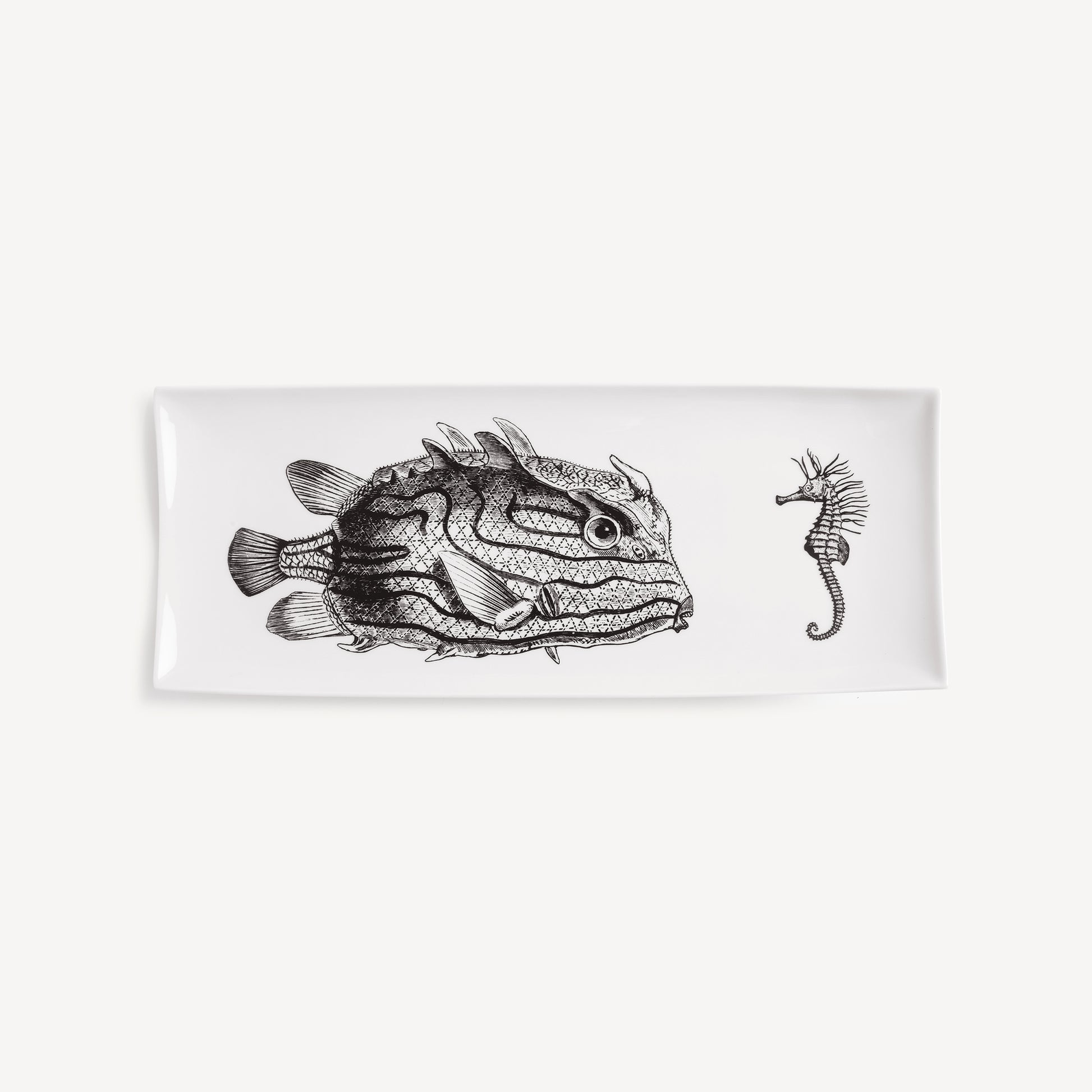 - Fornasetti ha sempre amato i decori di ispirazione marina. Lo testimonia questo vassoio decorato a mano, in cui due creature acquatiche si fronteggiano dando vita a un surreale duello dell'immaginazione.