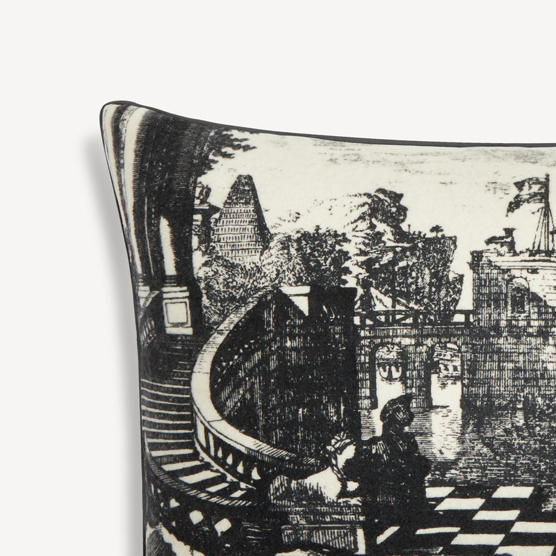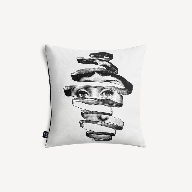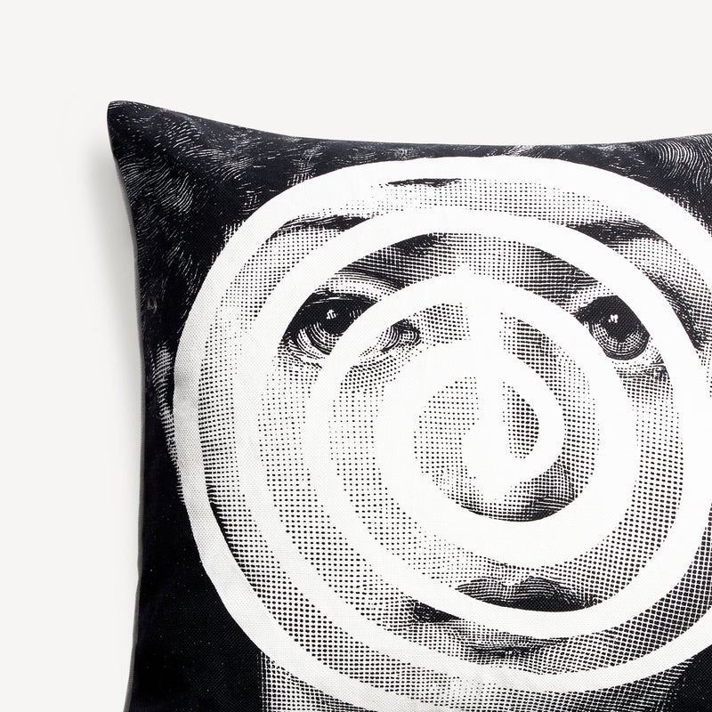 Appoggiato quasi per caso su una poltrona o attentamente disposto accanto agli altri della serie Tema e Variazioni, il cuscino Fornasetti è una magnetica presenza.