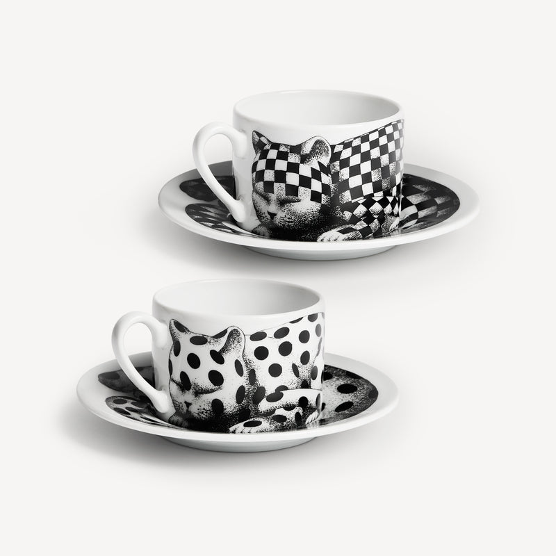 I nuovi set da tè e caffè High Fidelity reinterpretano il principio della variazione. Fiorato, a pois, a scacchi: il manto del gatto cambia su ogni tazza e piattino, trasformando la tavola in un originale gioco visivo.