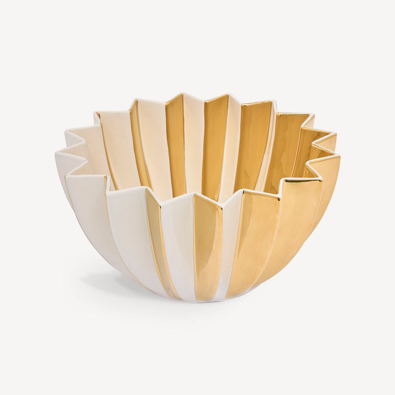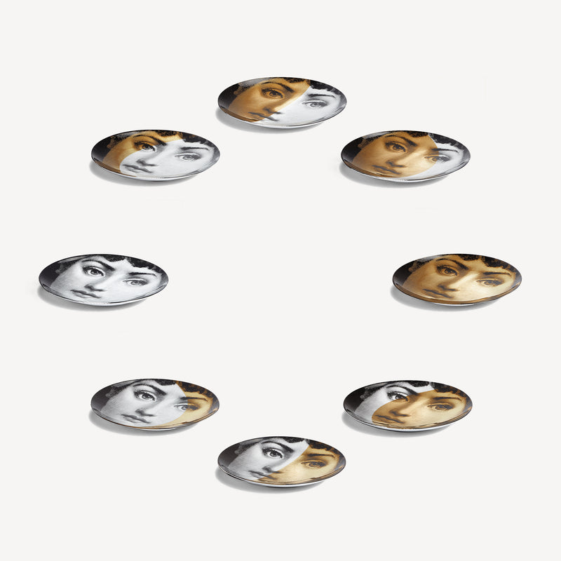 Nato da un disegno autografo di Barnaba Fornasetti, il centrotavola plissé in ceramica è un vero multiplo d'arte decorato a mano. La mise en place diviene così un immaginario sistema solare dove gli elementi orbitano con eleganza.