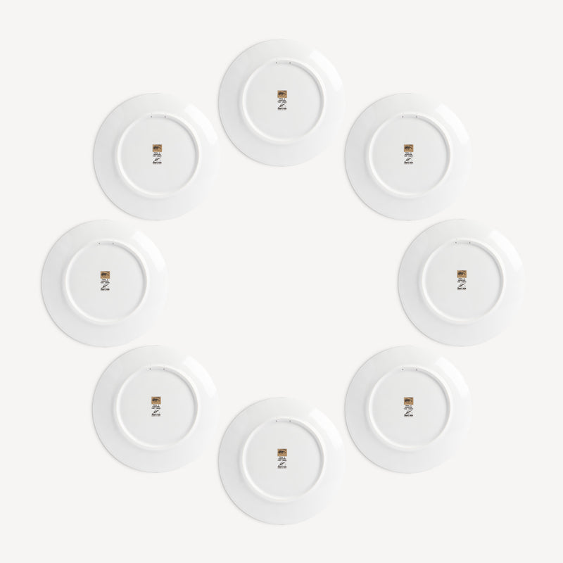 Lina Cavalieri interpreta la Luna e le sue trasformazioni. La tavola diviene uno scenario elegante e ultraterreno con il nuovo set di piatti Fasi Lunari decorati a mano con dettagli in oro.