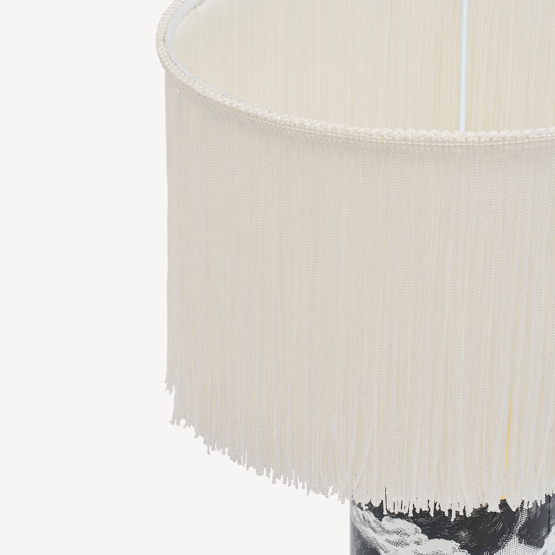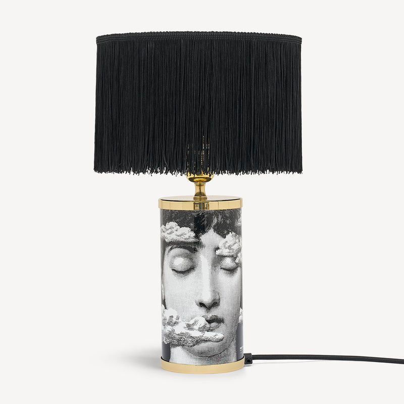 Le lampade più piccole dell’universo Fornasetti si trasformano in colonnati dorici, sistemi solari in miniatura e volti dalle espressioni eloquenti. Abbinate al nuovo paralume a frange diventano veri oggetti d’arte non convenzionali.