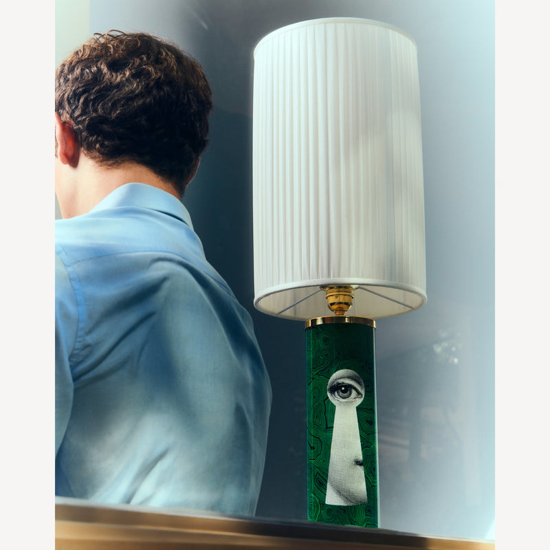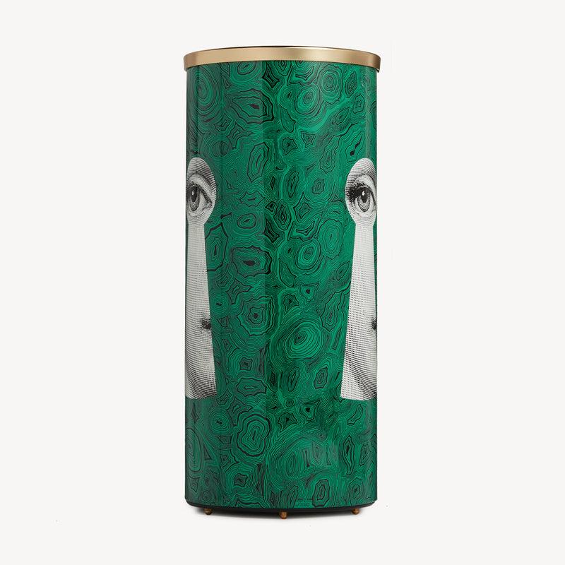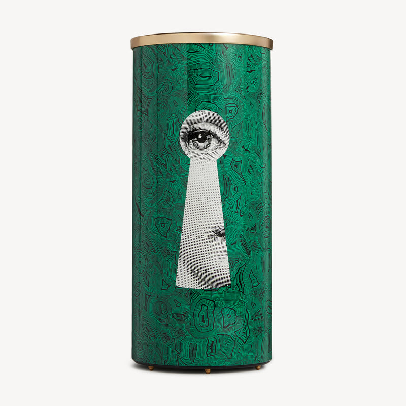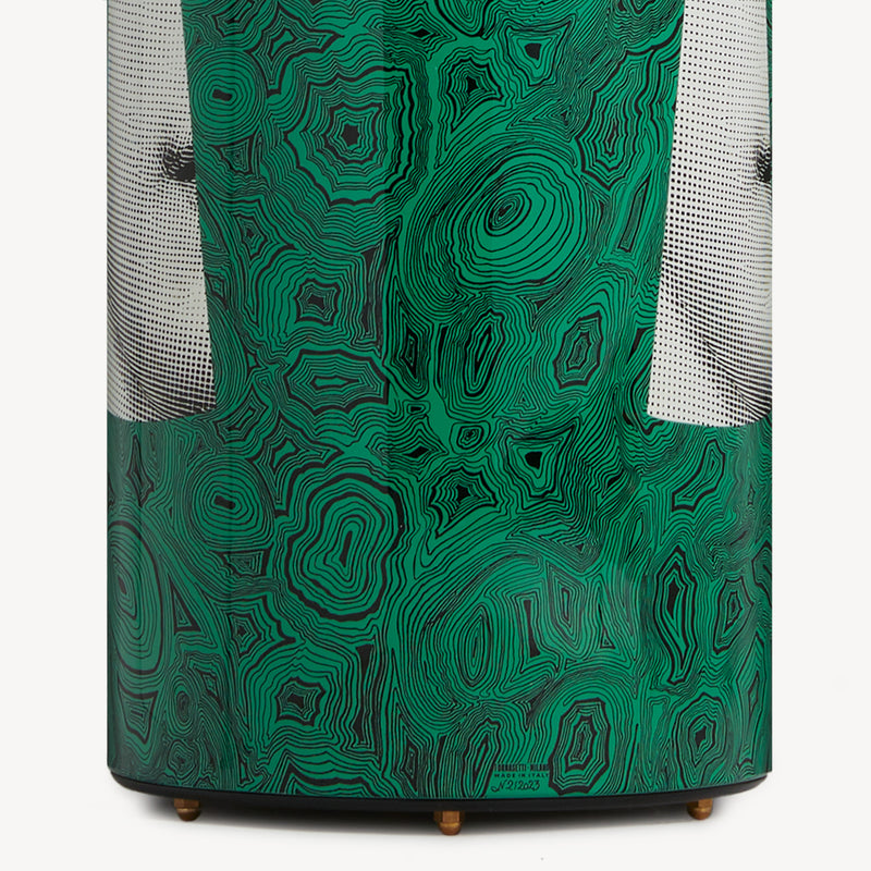 Nell’ossessiva indagine del reale di Fornasetti non manca il culto per i marmi e le pietre preziose, che con il suo disegno libero e onirico traghetta dalla dimensione del naturale a quella del surreale. Già dagli anni Cinquanta la Malachite verde, con le sue linee nere e sinuose, è una delle icone più ipnotiche ed eleganti della creatività dell’artista. Oggi incontra per la prima volta la musa Lina Cavalieri, il cui sguardo enigmatico emerge da un’immaginaria serratura. Un gioco illusorio che arricchisce la collezione di mobili e complementi d’arredo Fornasetti di un’estetica insieme classica e moderna.