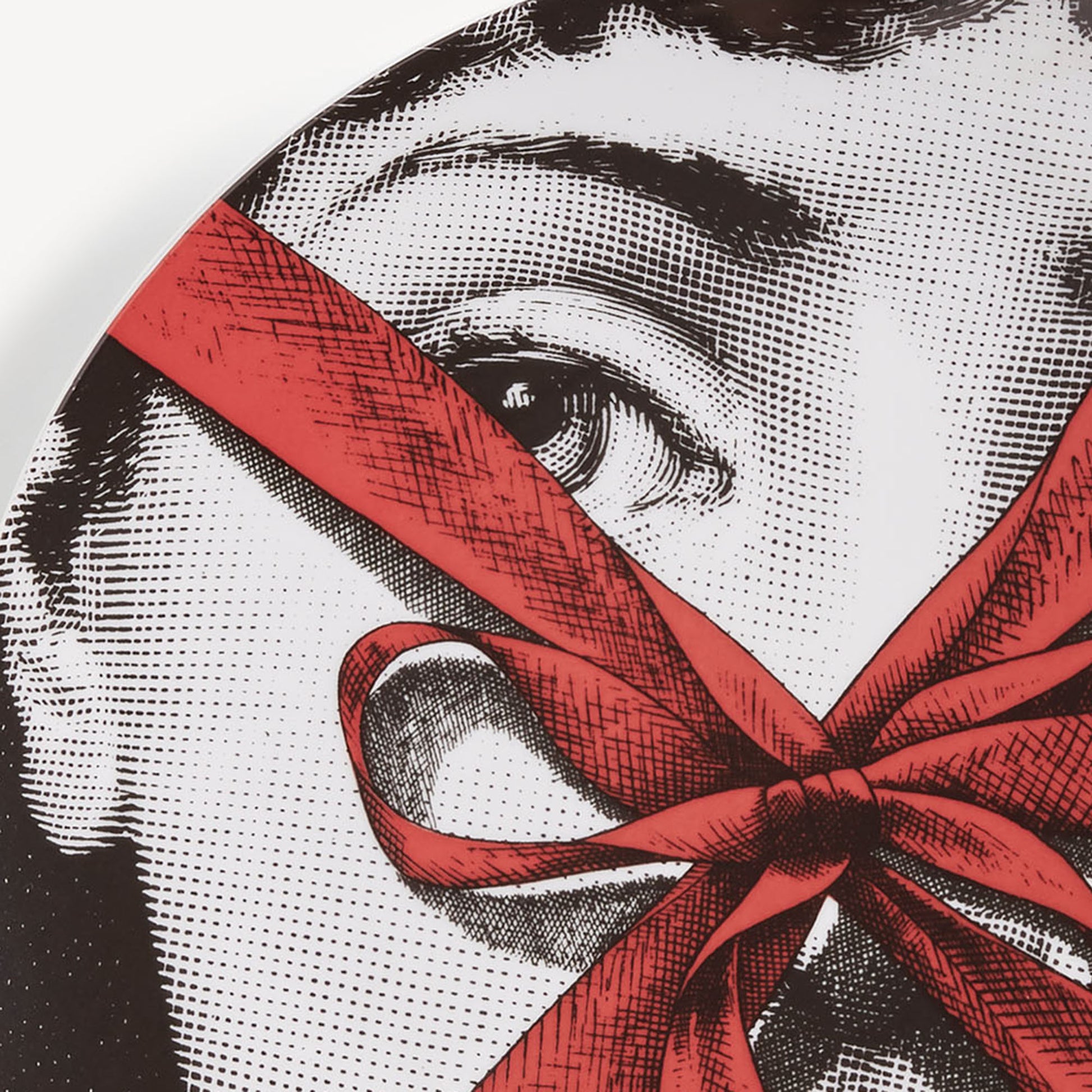 - Il volto della cantante lirica Lina Cavalieri, icona protagonista di innumerevoli reinterpretazioni da parte di Piero Fornasetti, impreziosisce questo piatto in porcellana decorato a mano e appartenente alla serie Tema e Variazioni: un vero pezzo da collezione, che potrai utilizzare come piatto da parete, grazie alla presenza di due fori sul retro, ma anche con funzione ornamentale per l'arte della tavola. Per la pulizia si raccomanda l'utilizzo di un panno umido senza detergente.