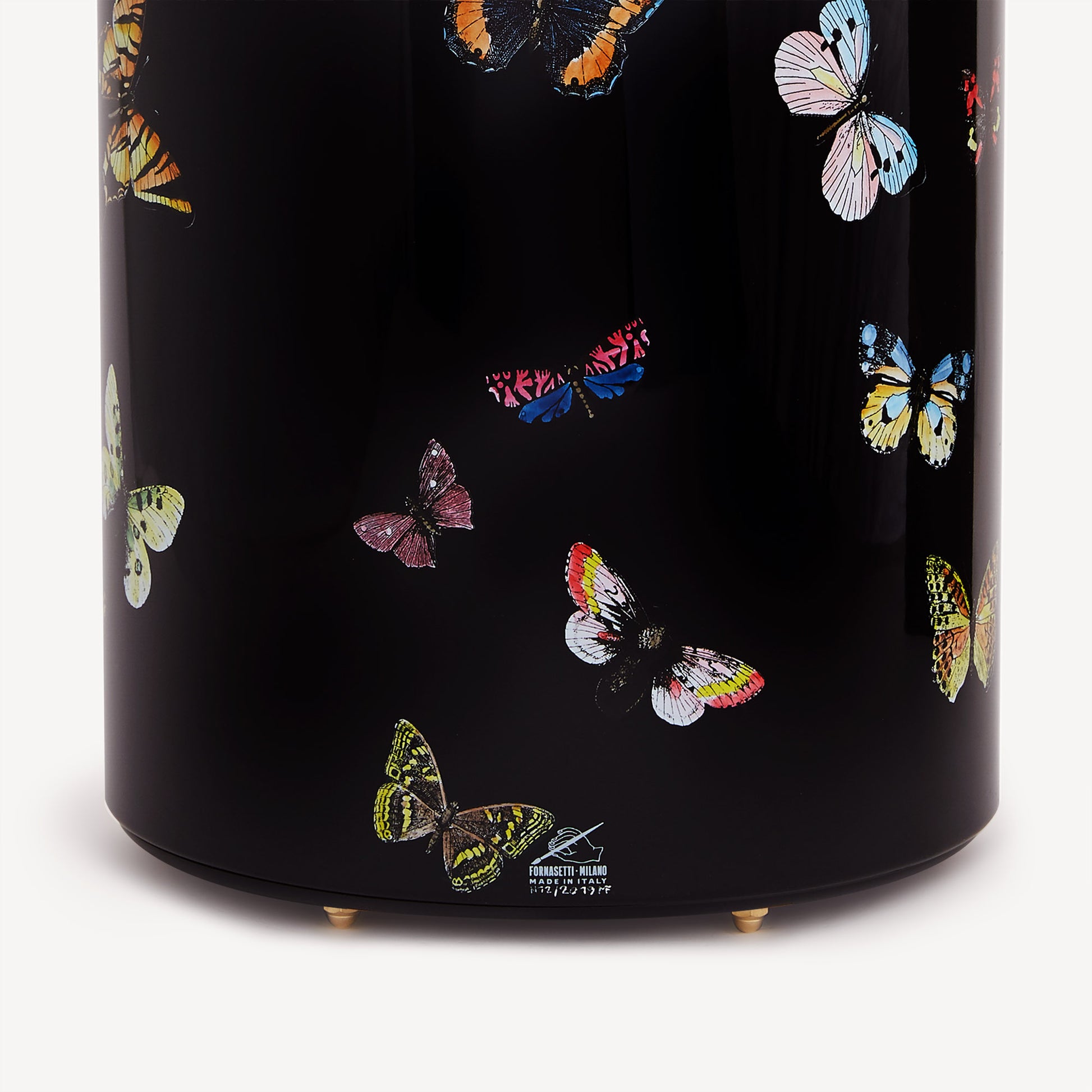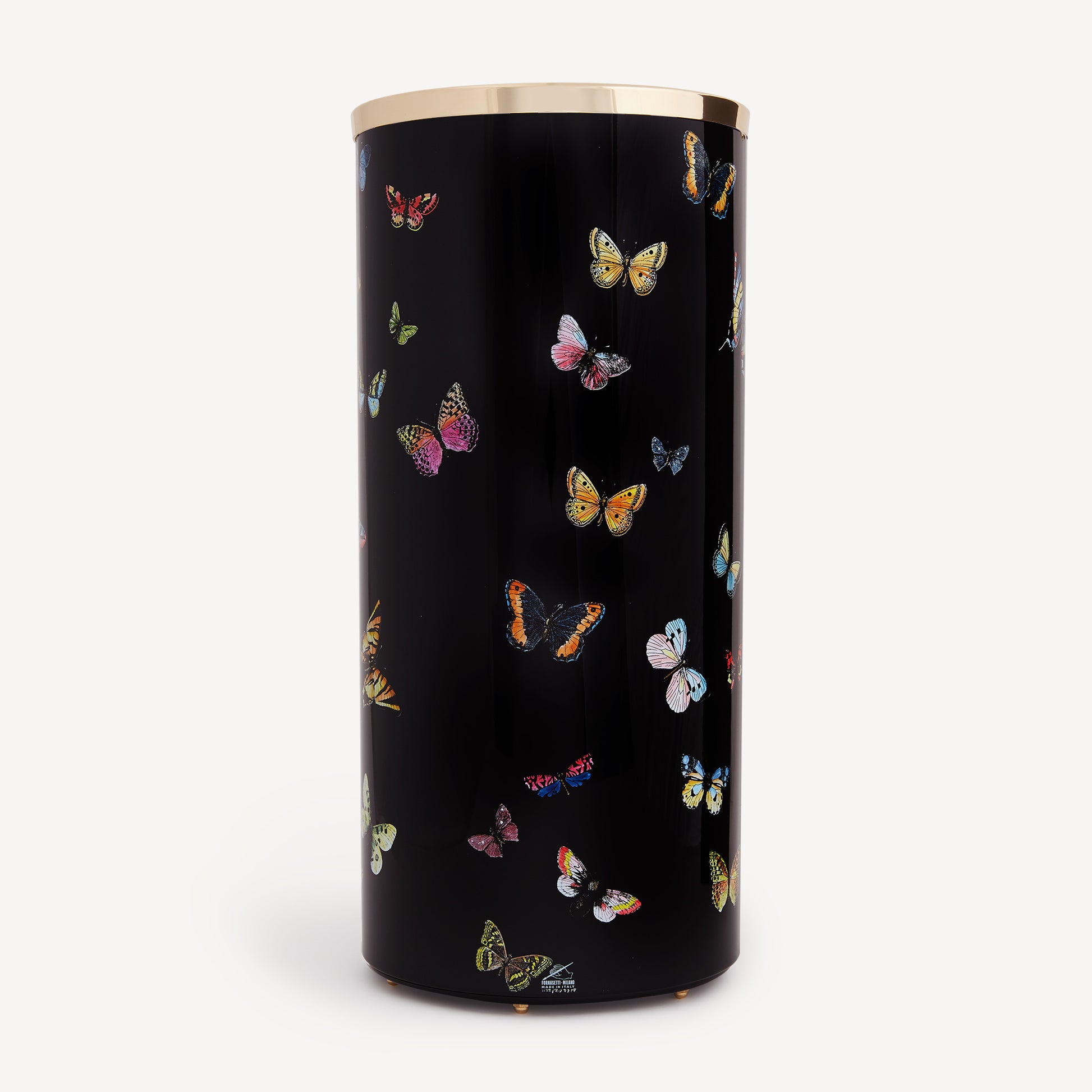 - La leggiadria delle farfalle in volo, protagoniste del decoro, conferisce un fascino sempre attuale e sorprendente a questo portaombrelli realizzato in metallo serigrafato, dipinto e laccato a mano, con bordo superiore in ottone e dotato di piedini. Per la pulizia si raccomanda l'utilizzo di un panno umido senza detergente.