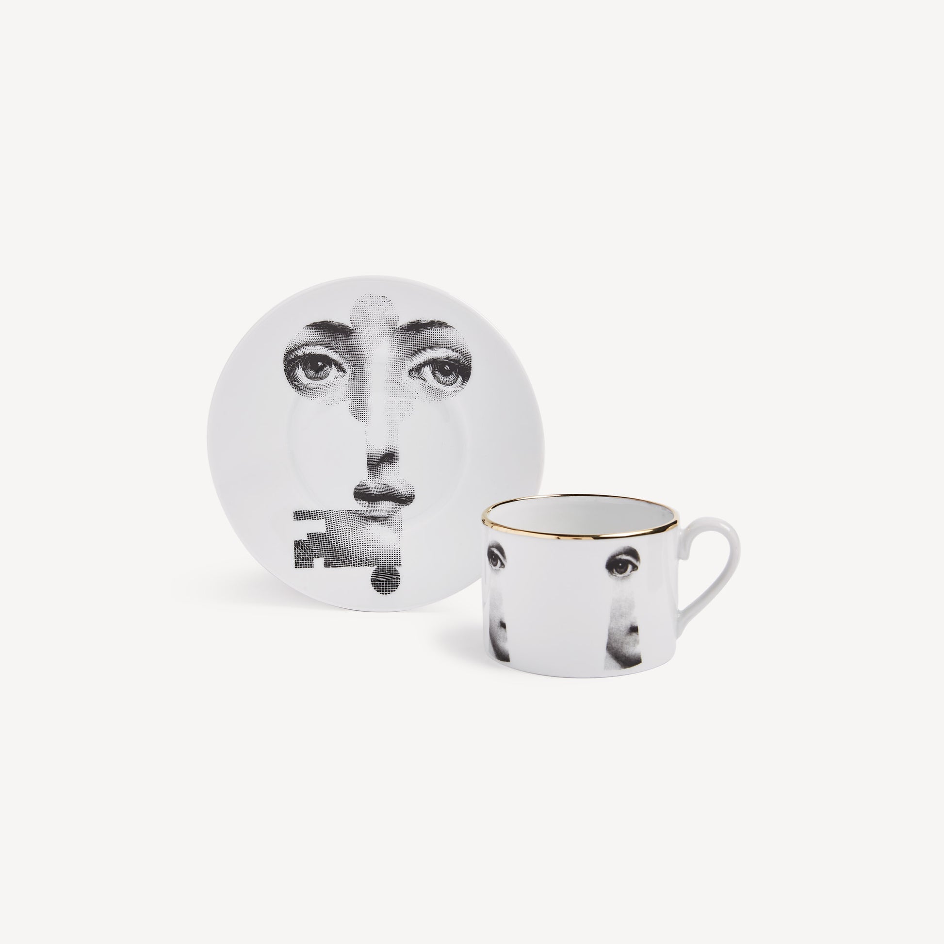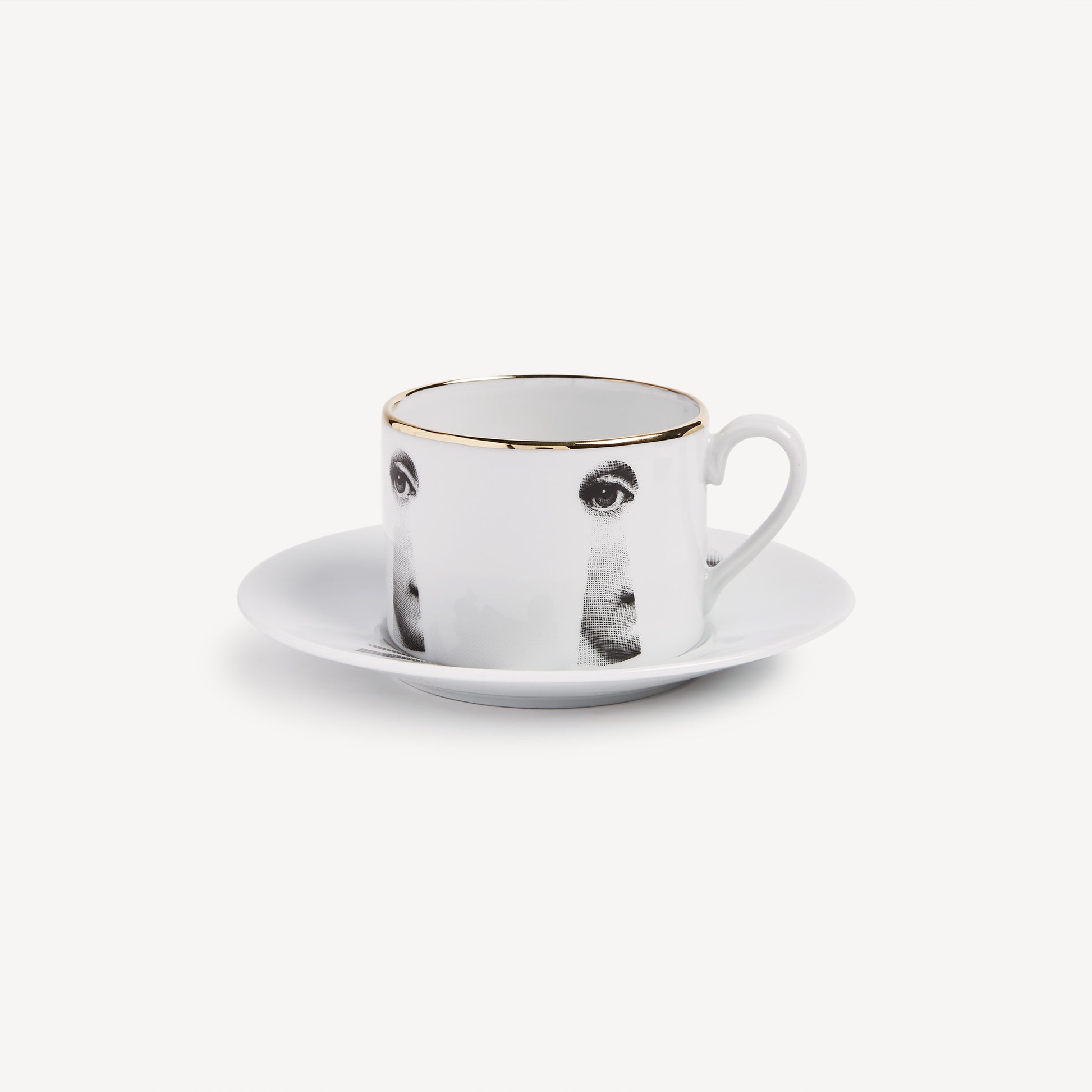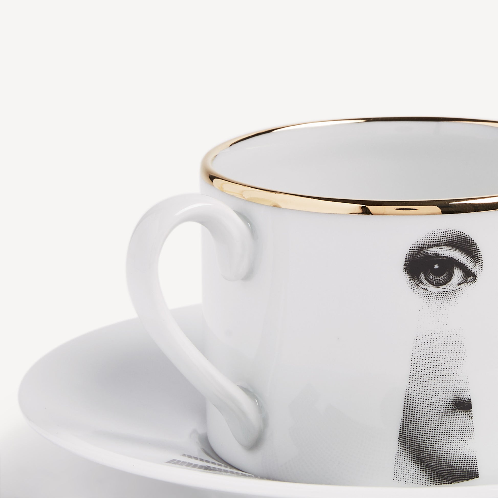 - Il volto della cantante lirica Lina Cavalieri, reinterpretato da Piero Fornasetti, impreziosisce questa tazza da tè in porcellana decorata a mano con inserti in oro, facente parte dell'iconica serie Tema e Variazioni: un vero pezzo da collezione.