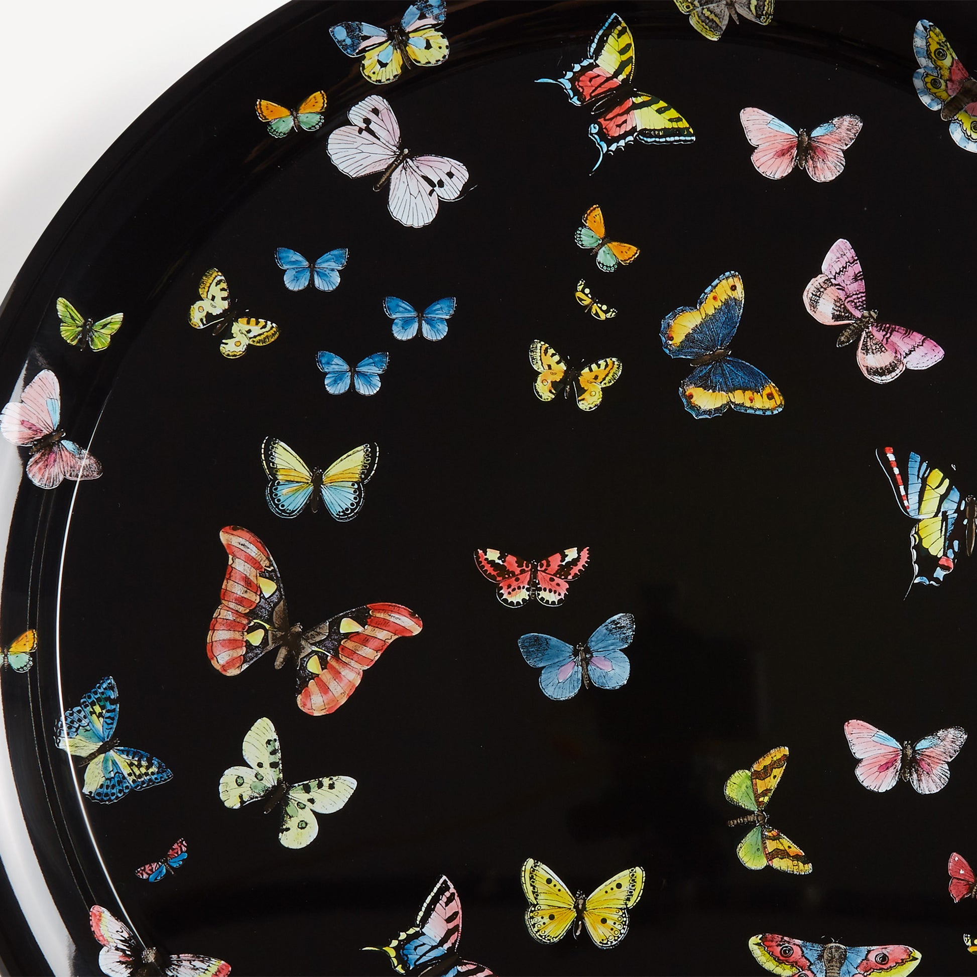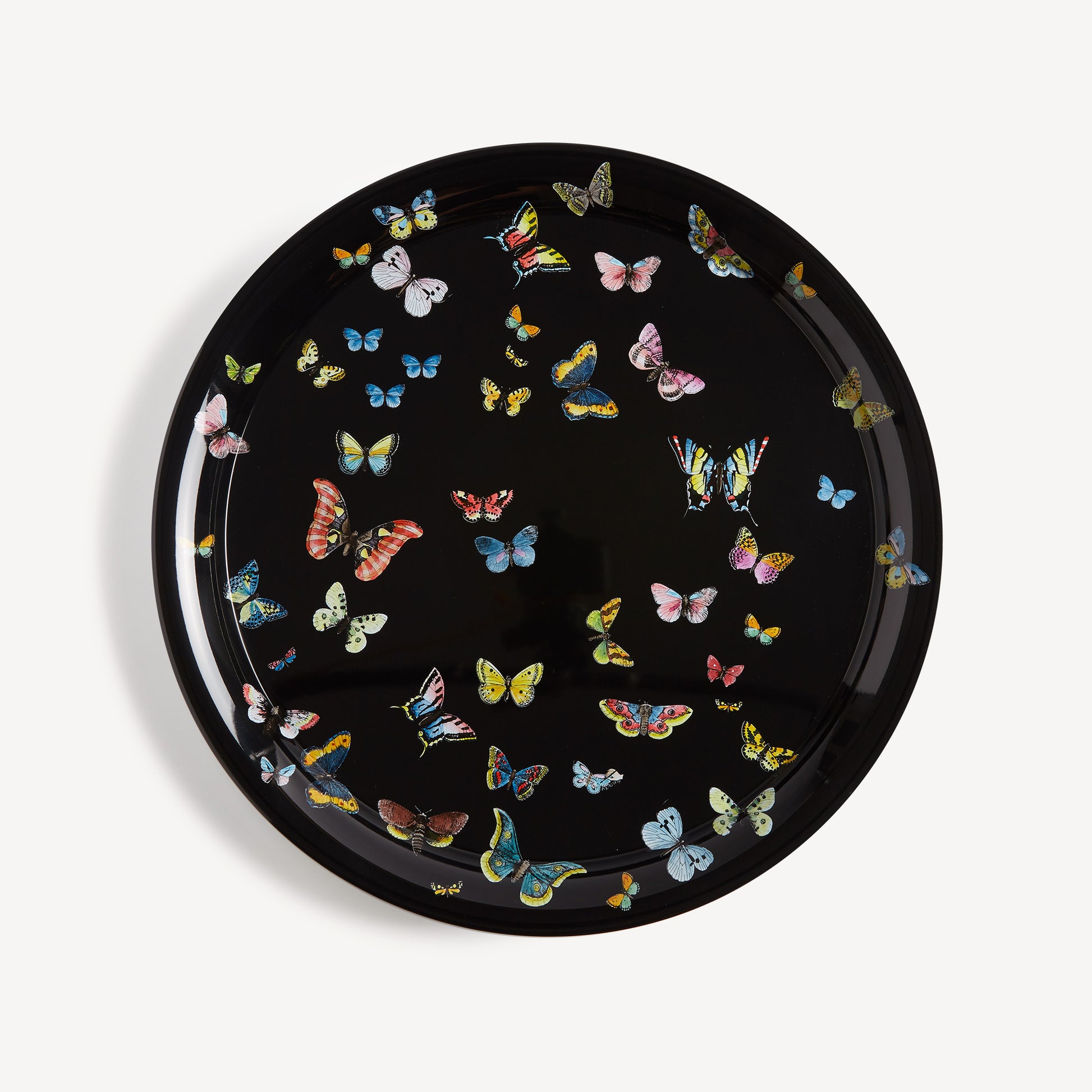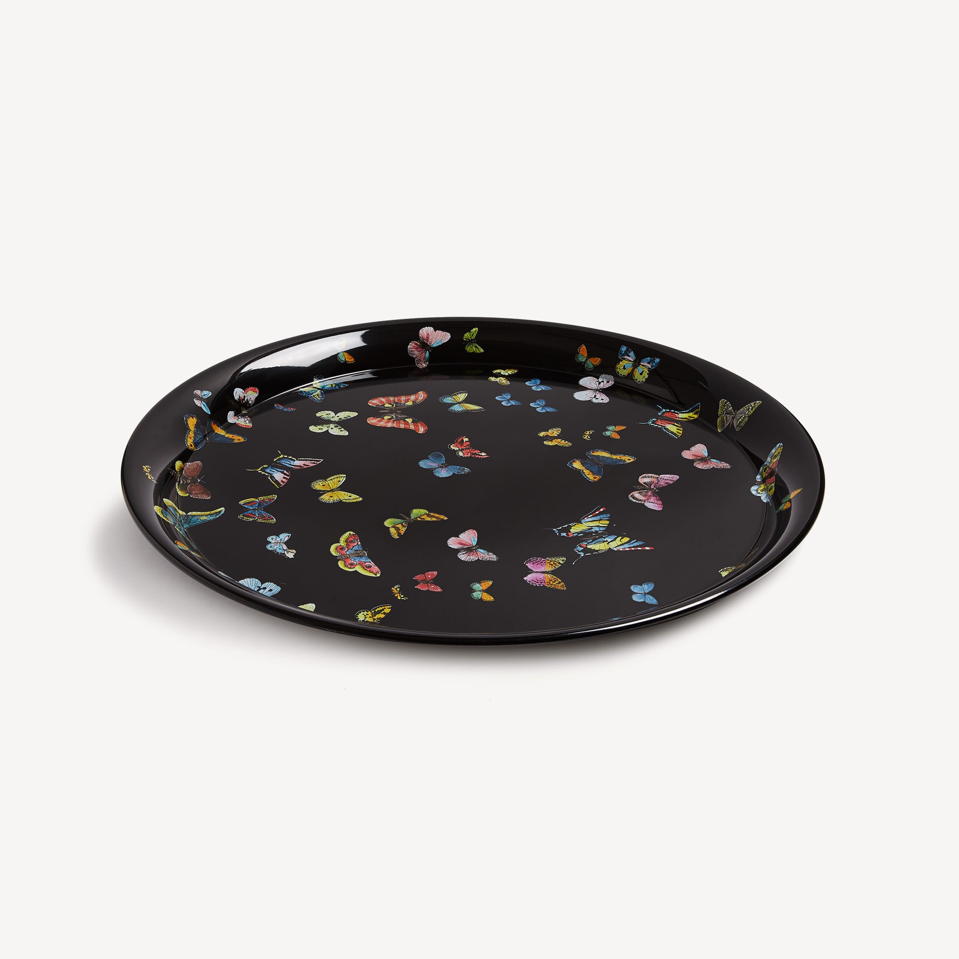 - La forma circolare e la superficie piana danno grande risalto ai decori dell'Atelier. Questo vassoio, serigrafato, dipinto e laccato a mano, è impreziosito dal volo di leggiadre farfalle. Abbinato a una struttura pliant, il vassoio si può trasformare in tavolino.