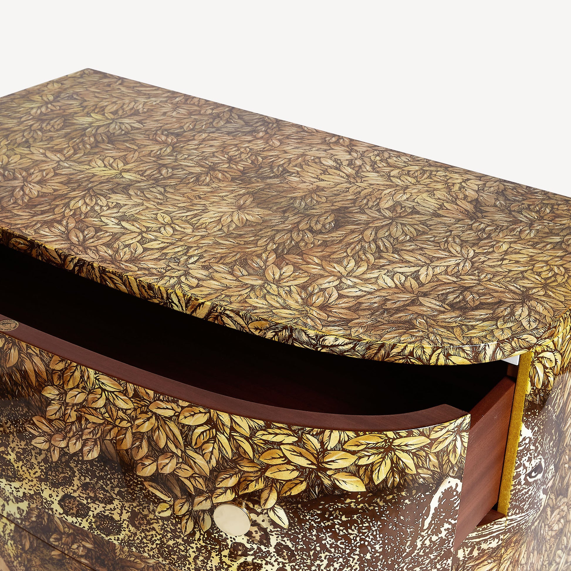 - L’incedere elegante del leopardo ispira l’immaginazione dell’artista. Disegnato negli anni ’50 per il salotto della villa di famiglia, questo comò in legno dal decoro esotico, serigrafato, dipinto e laccato a mano, era una delle creazioni più amate dallo stesso Piero Fornasetti.