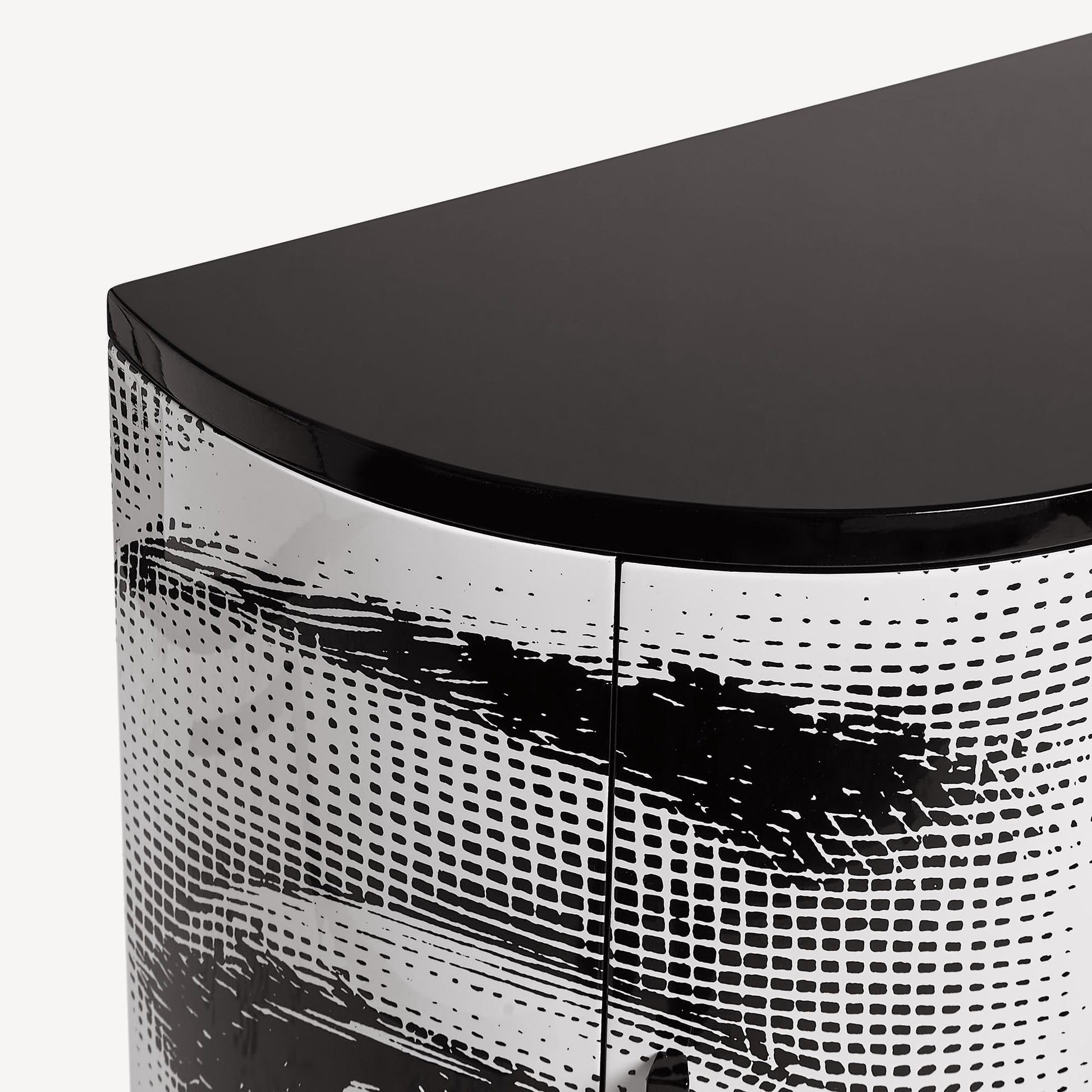 Il top di questo mobile Fornasetti è verniciato in tinta unita e laccato a mano e il vetro protettivo non è previsto.